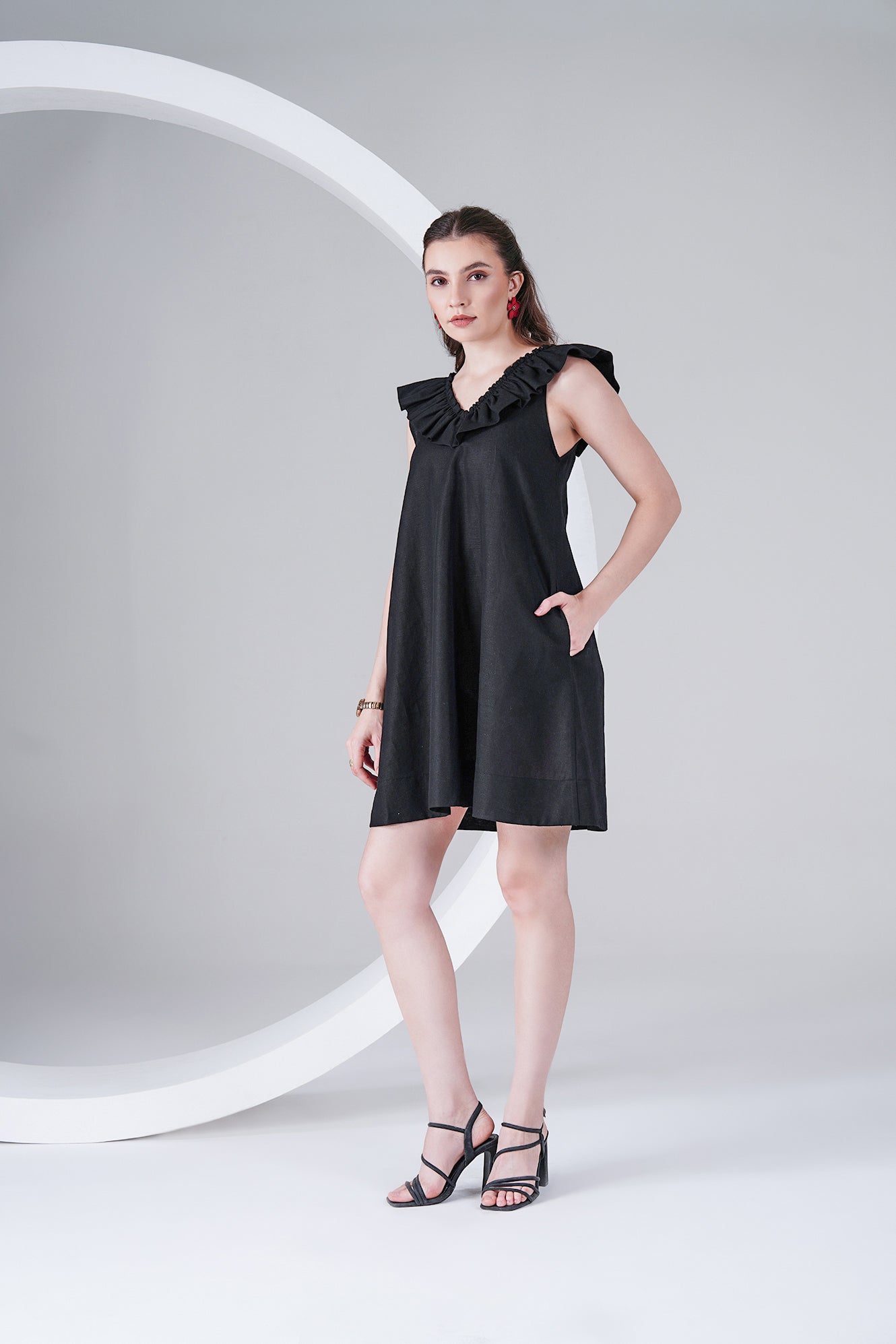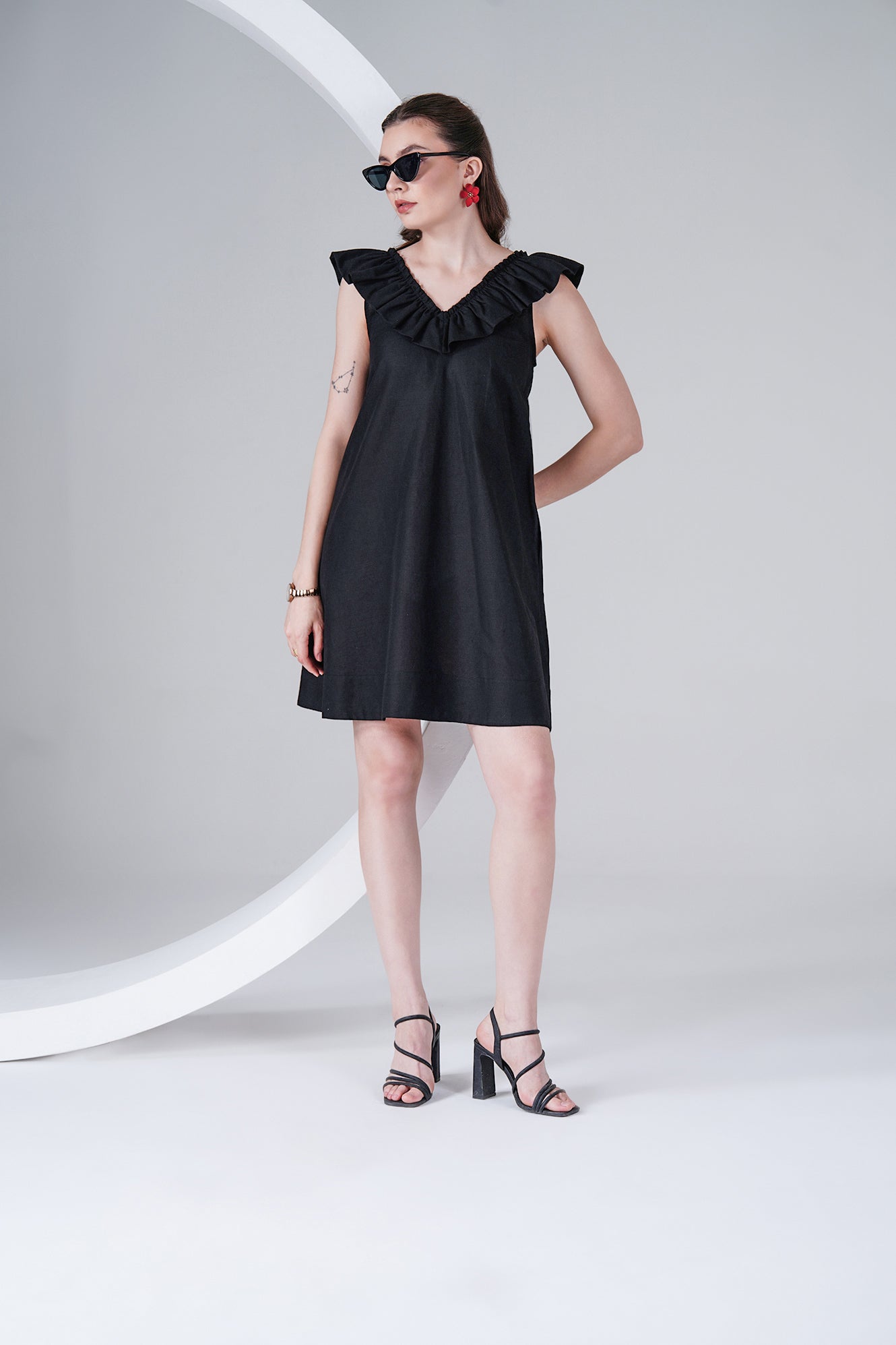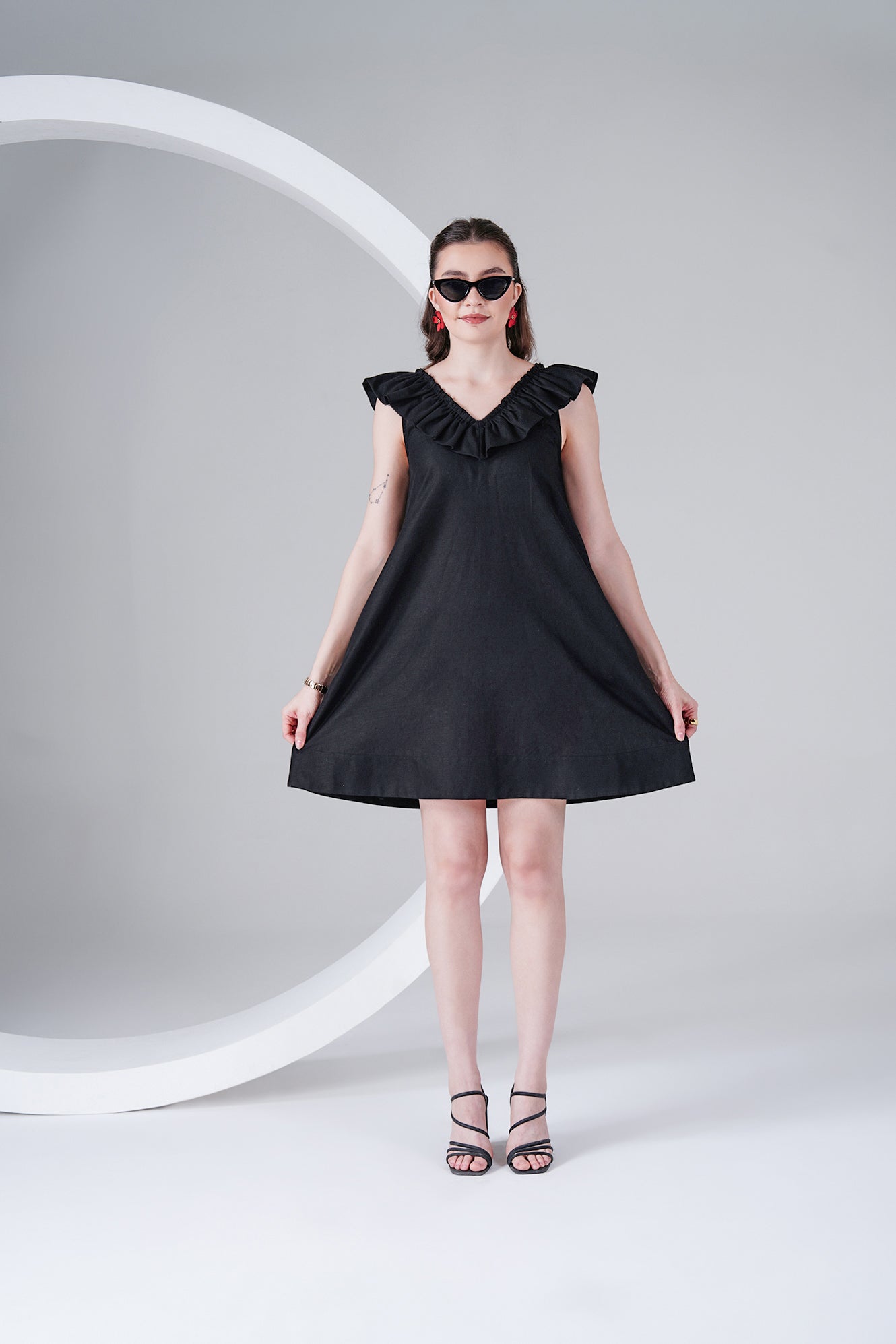 Effortless and chic, this black A-line dress is designed with a flattering V-neckline adorned with soft ruffle details. Made from breathable cotton-linen blend, it flows gracefully for a comfortable yet elevated look. Perfect for brunches, evenings out, or everyday minimal elegance.