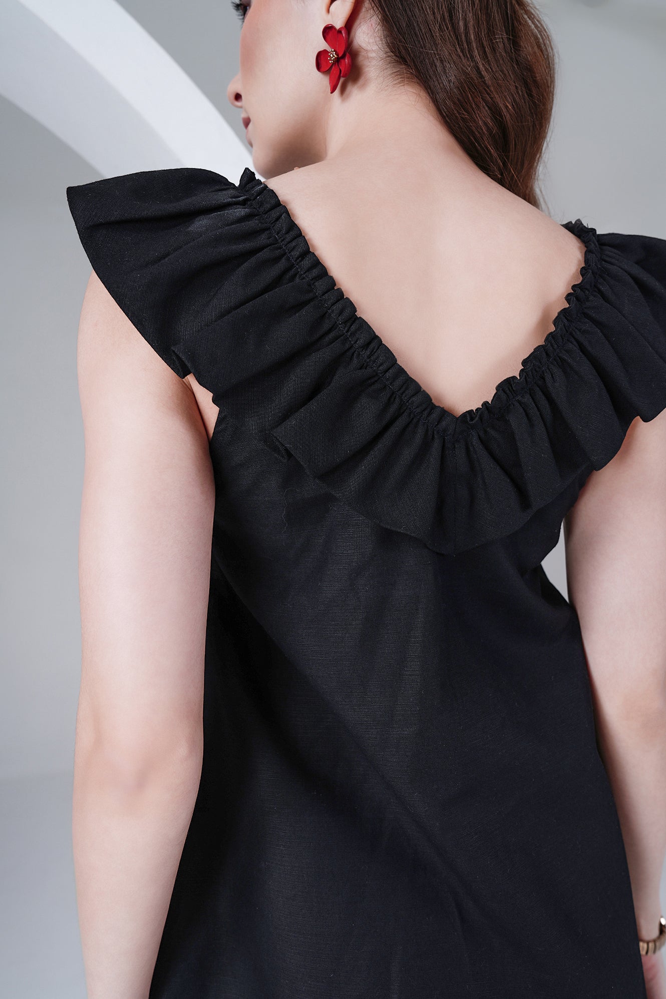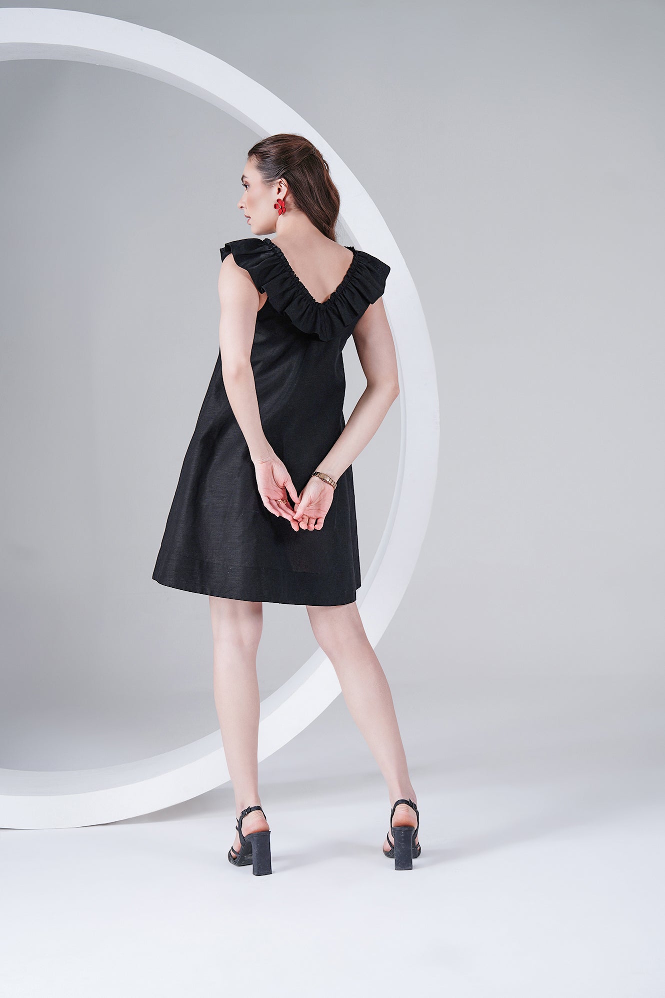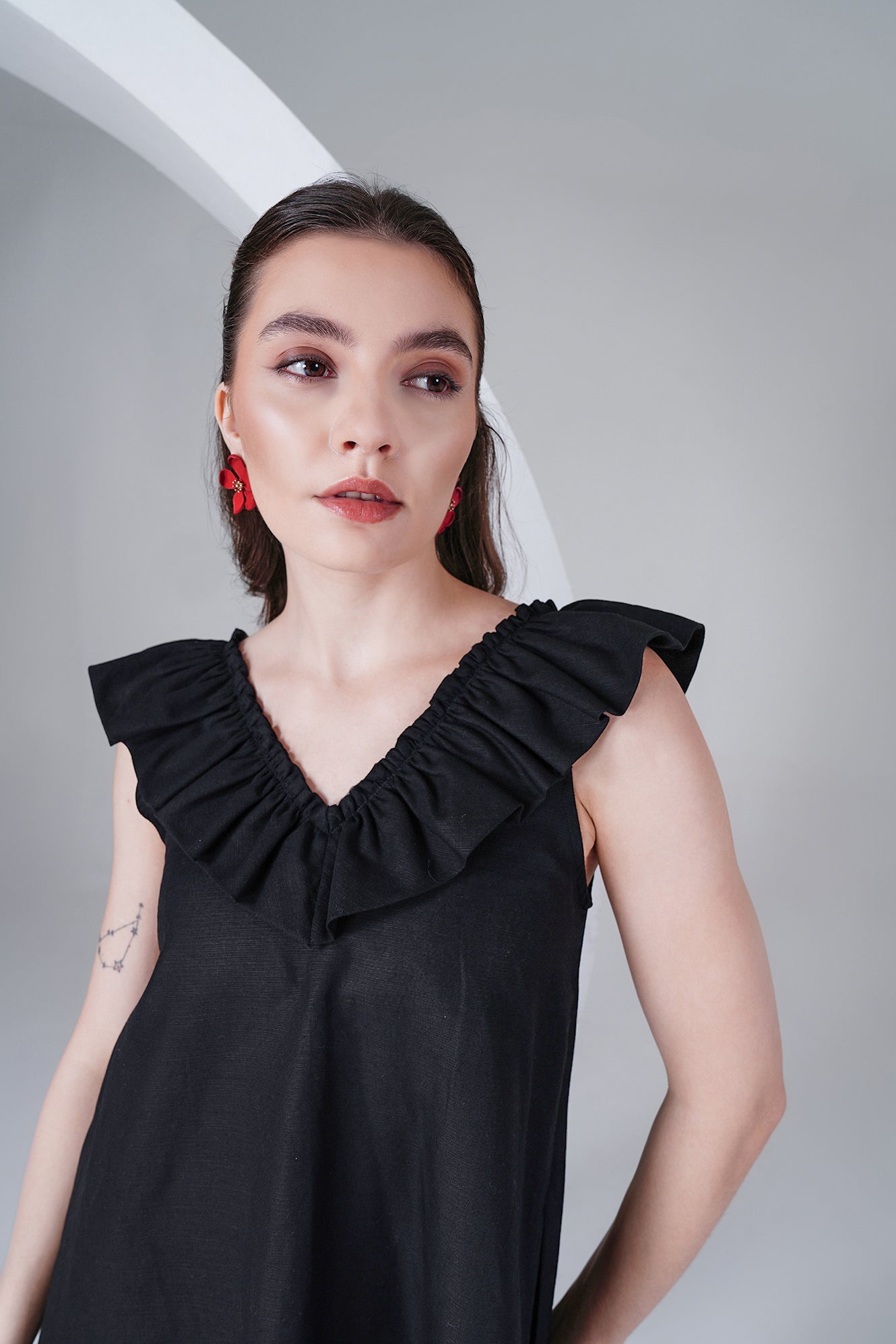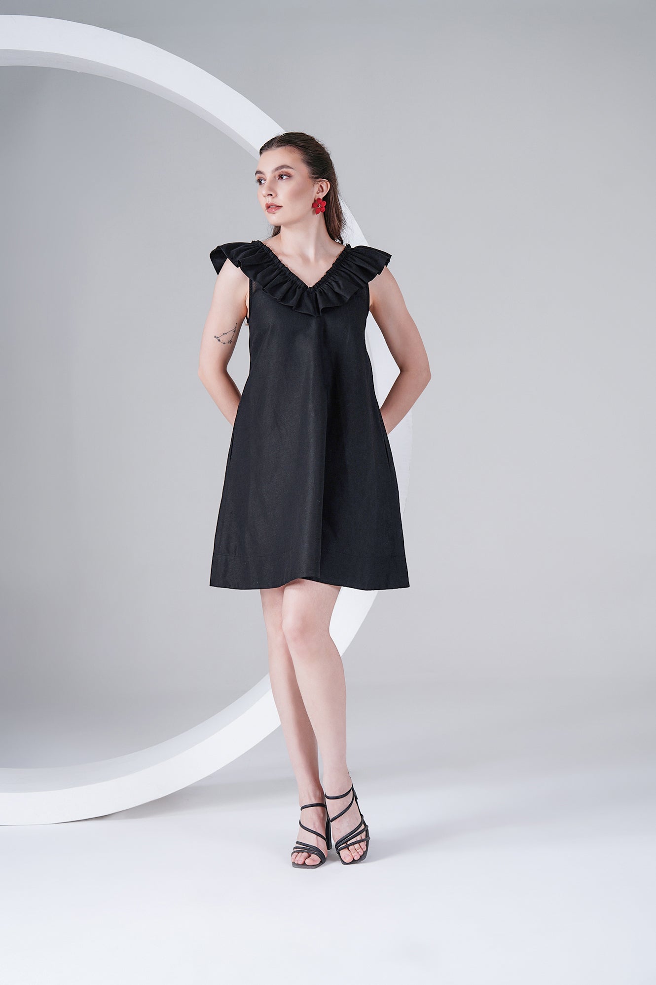 Effortless and chic, this black A-line dress is designed with a flattering V-neckline adorned with soft ruffle details. Made from breathable cotton-linen blend, it flows gracefully for a comfortable yet elevated look. Perfect for brunches, evenings out, or everyday minimal elegance.
