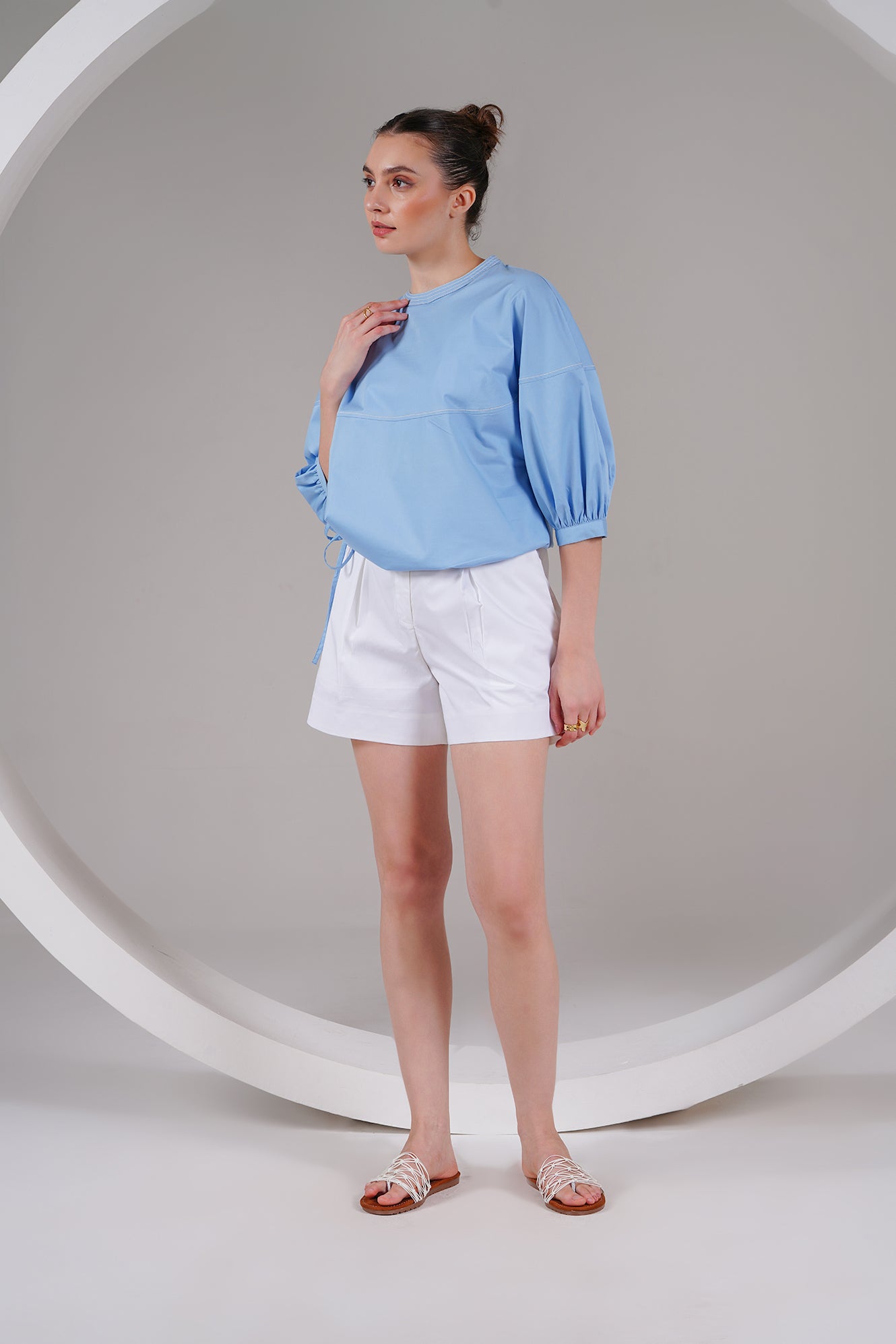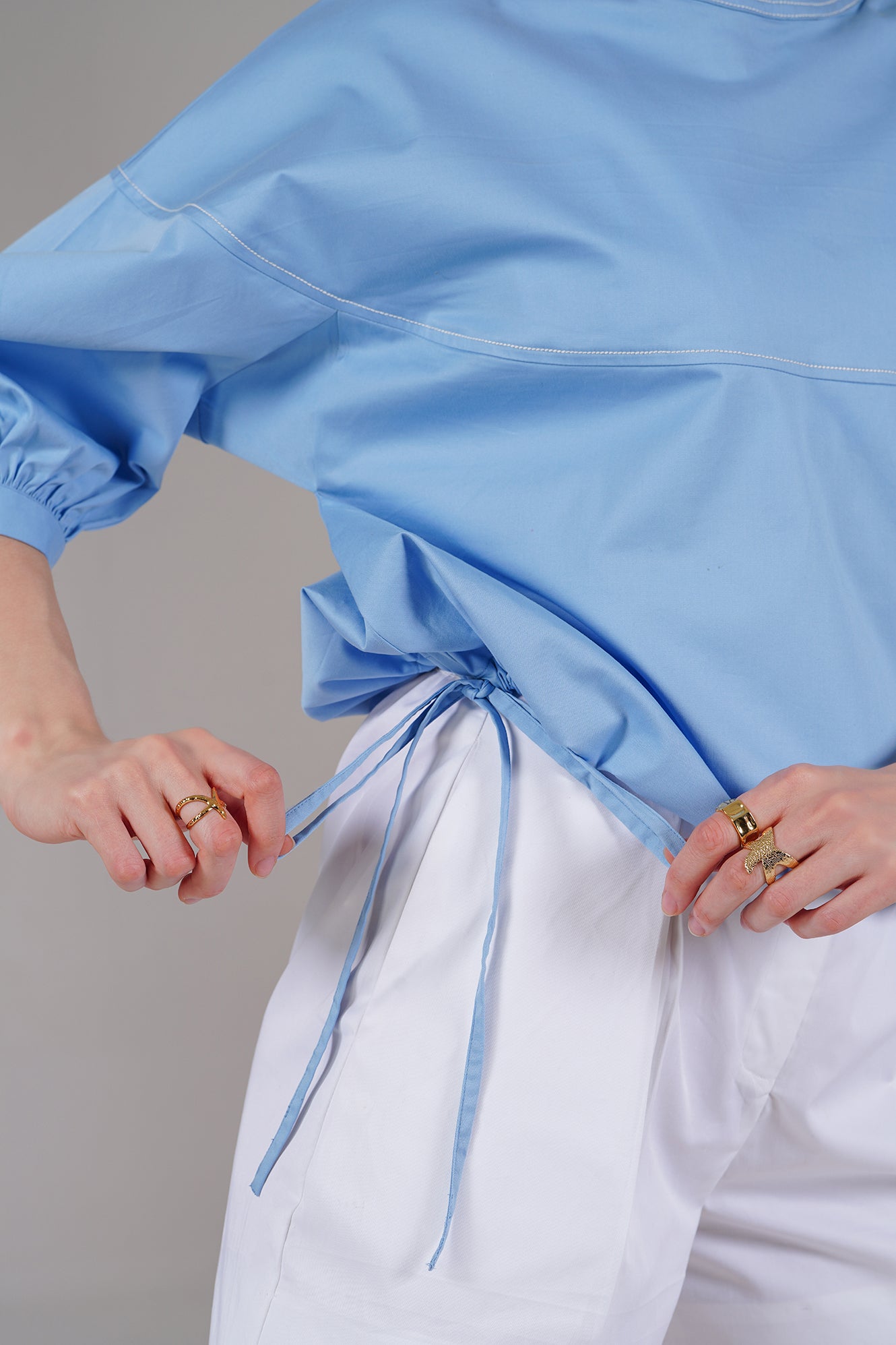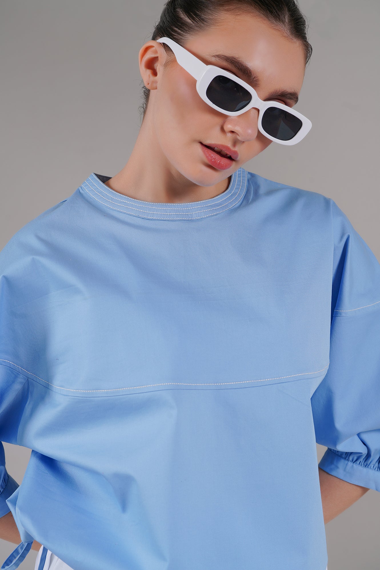A modern essential with a relaxed twist — this blue cotton poplin oversized top blends comfort with minimal design. Featuring a round neckline with contrast stitch detailing, three-quarter puff sleeves with elastic cuffs, and adjustable side tie details, it allows you to style it your way.