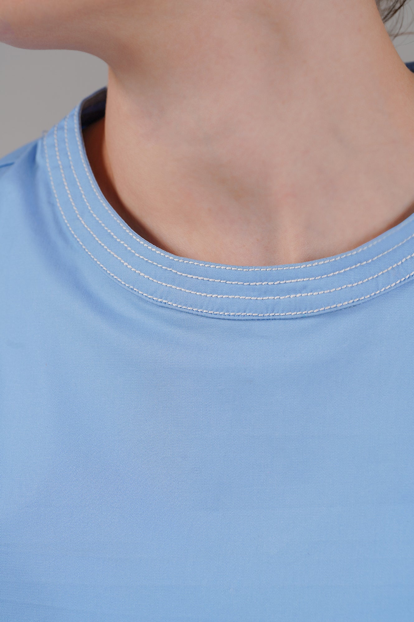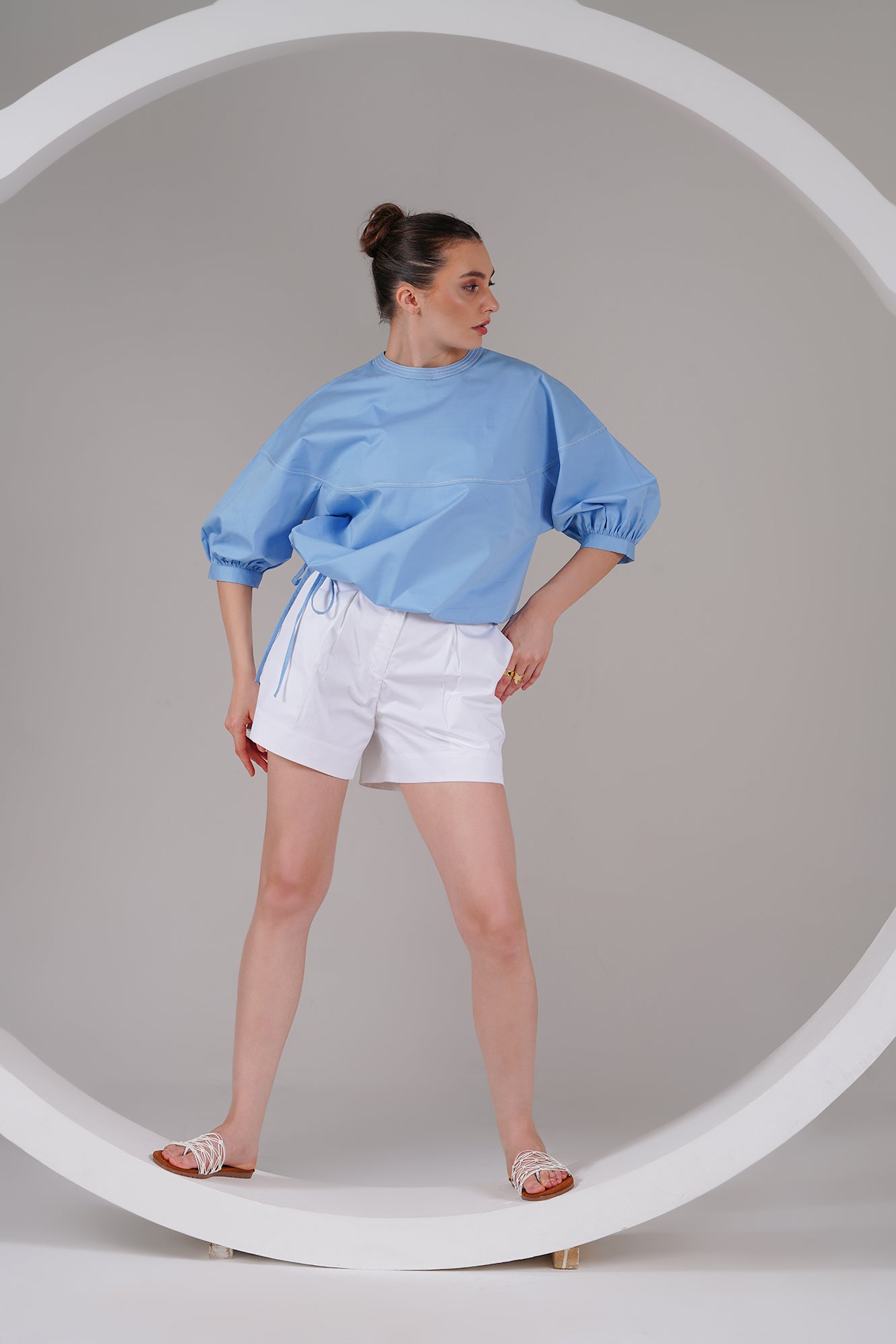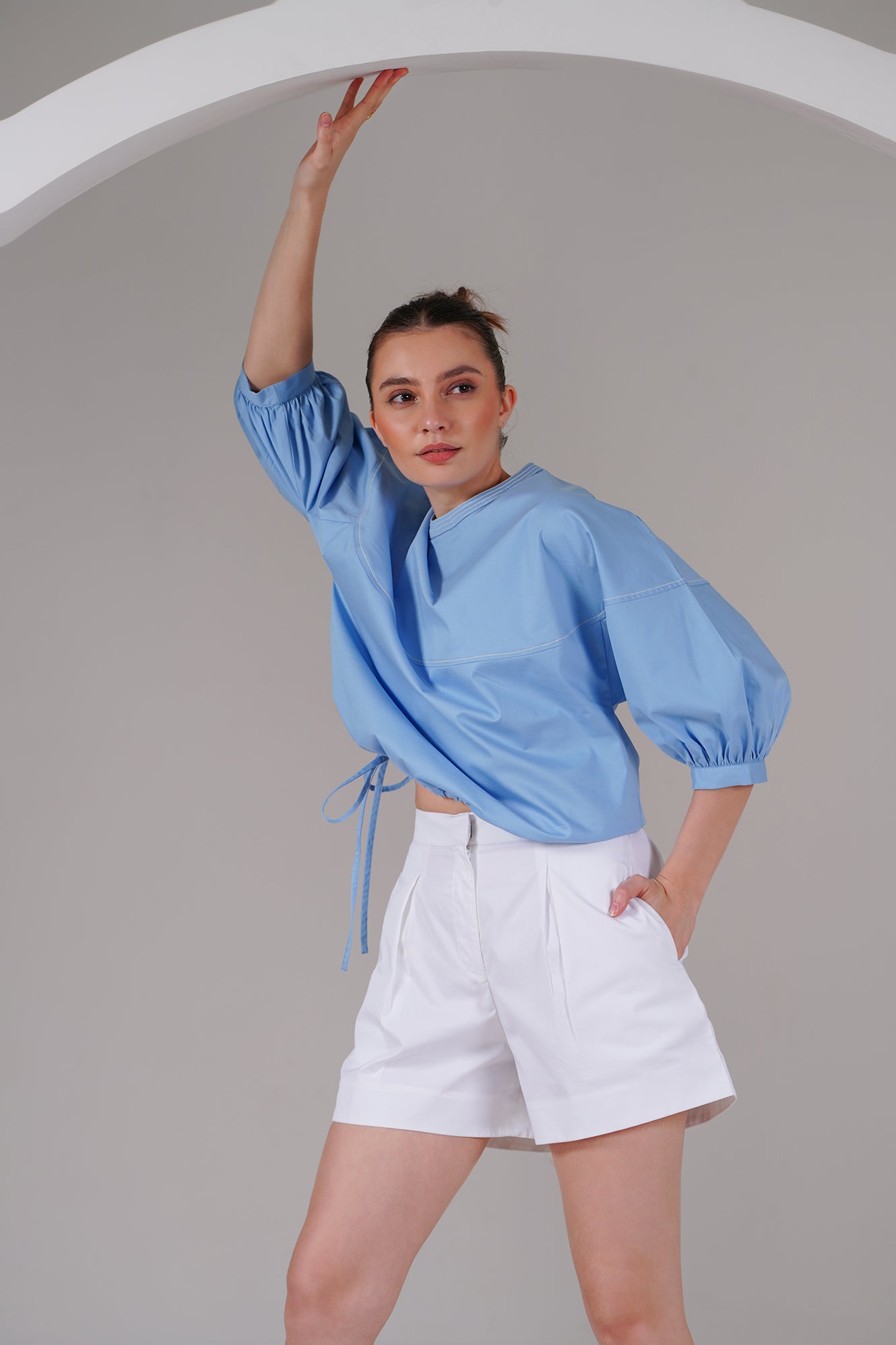 A modern essential with a relaxed twist — this blue cotton poplin oversized top blends comfort with minimal design. Featuring a round neckline with contrast stitch detailing, three-quarter puff sleeves with elastic cuffs, and adjustable side tie details, it allows you to style it your way.