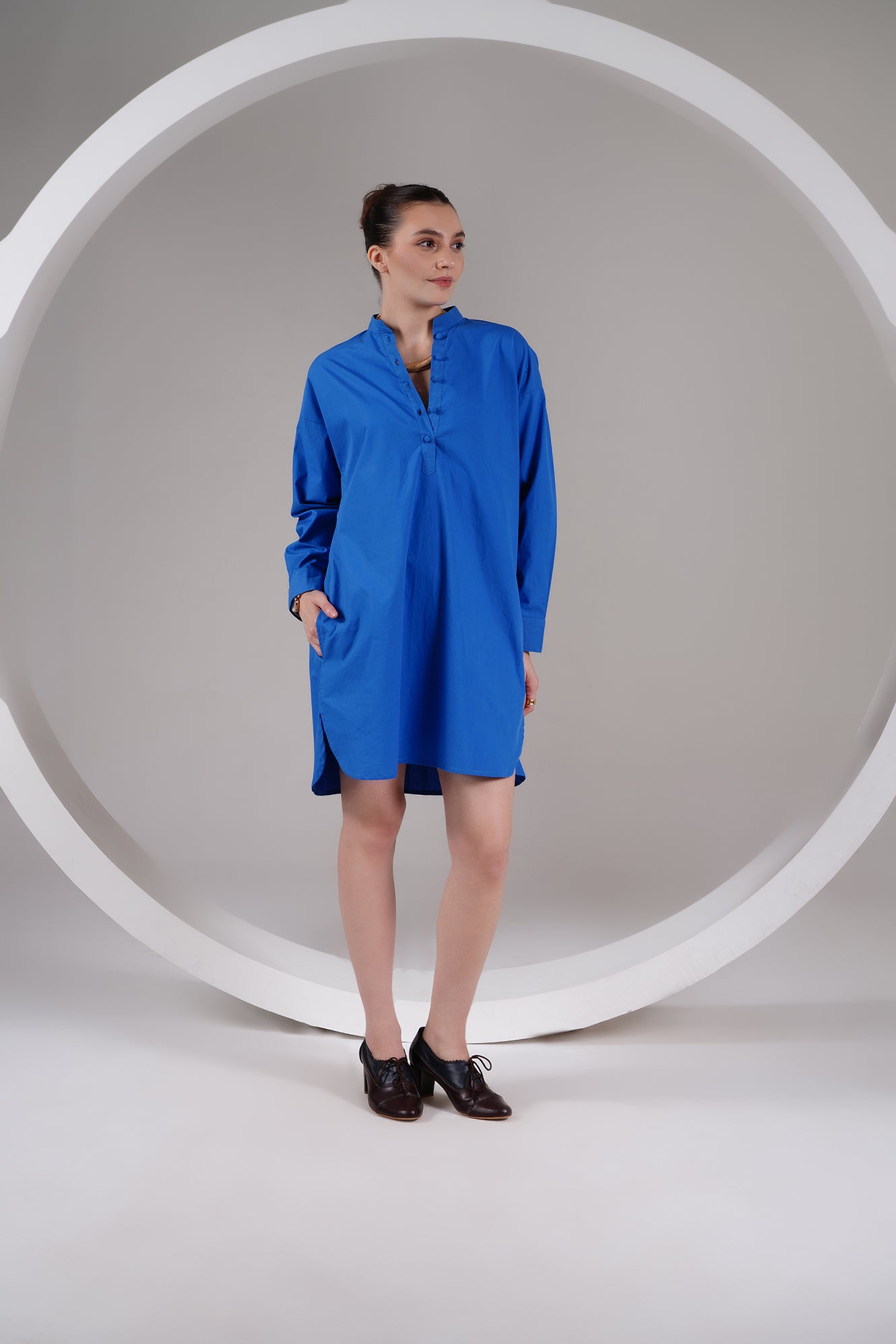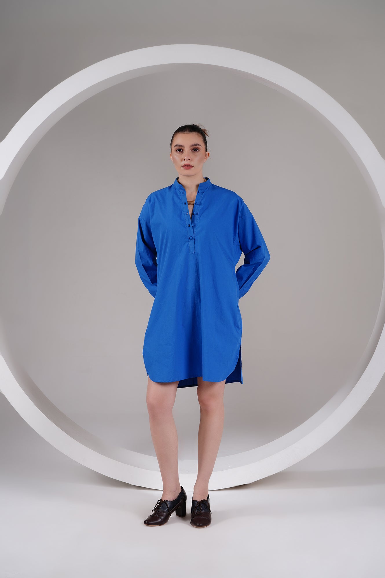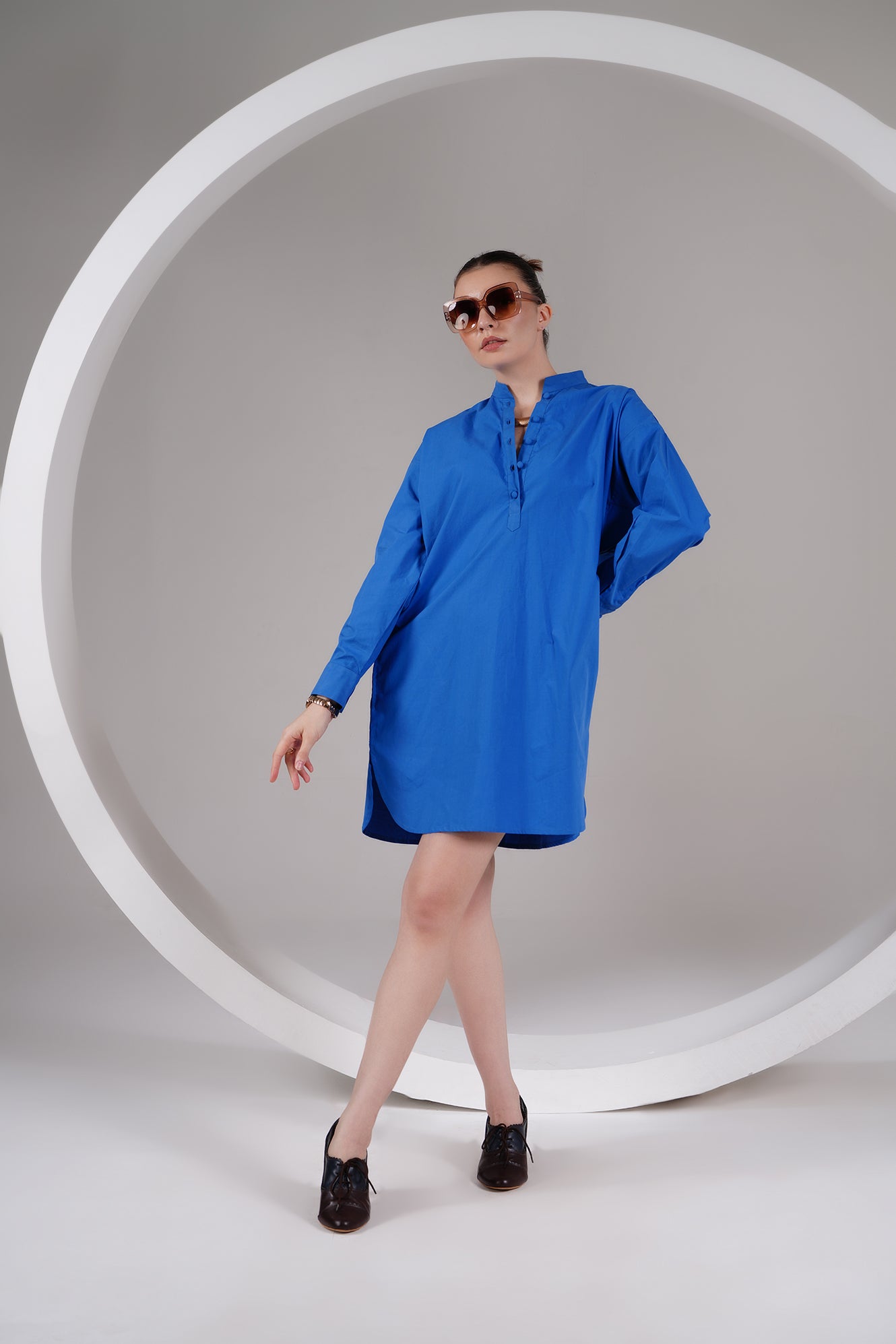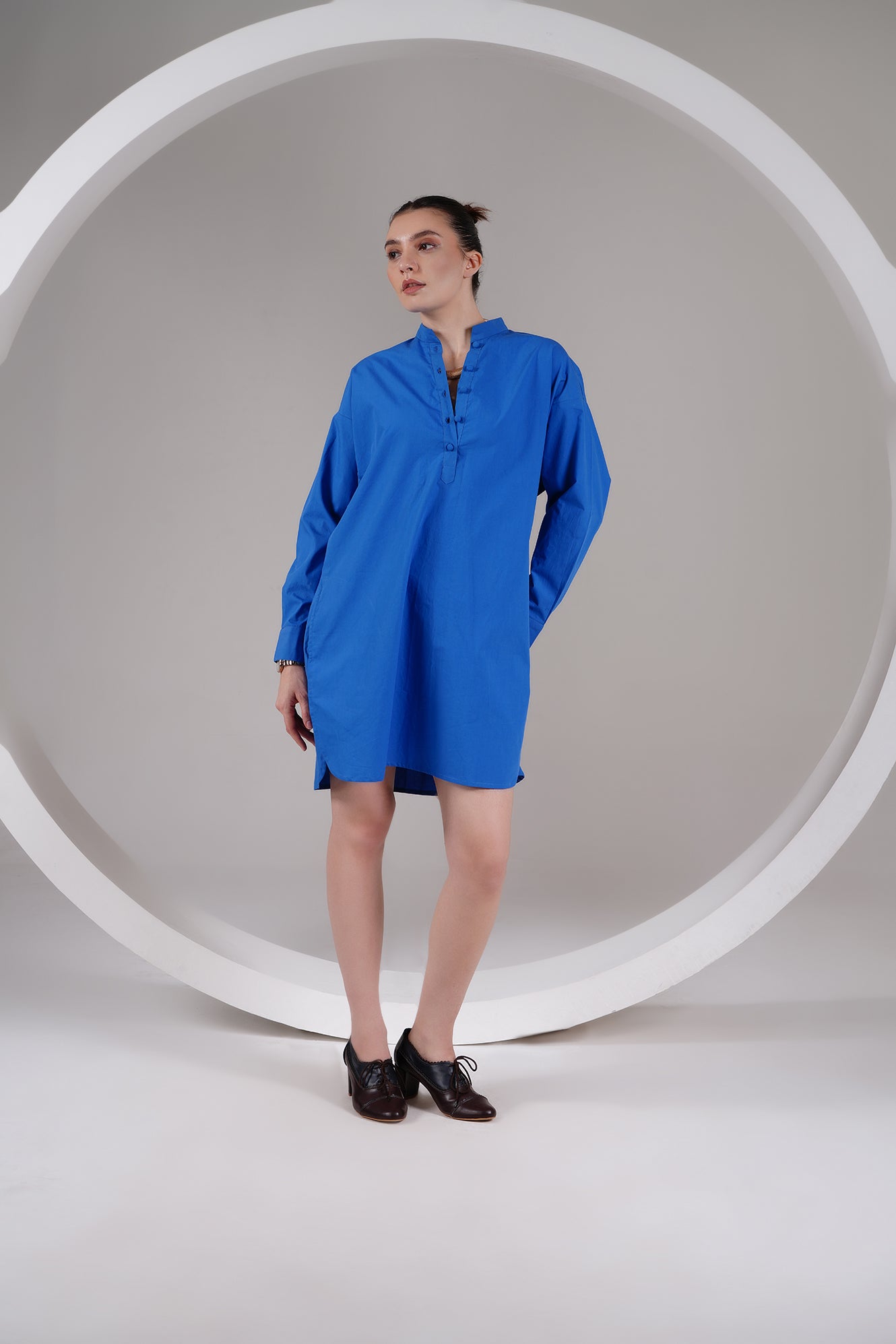Minimal, bold, and versatile — this shirt dress in royal blue is designed for everyday ease. Crafted in 100% cotton poplin, it features a straight relaxed silhouette with a clean mandarin collar, a half-button placket, and long sleeves. Designed to be worn as a standalone dress or styled as a tunic, it’s the perfect mix of comfort and quiet statement.