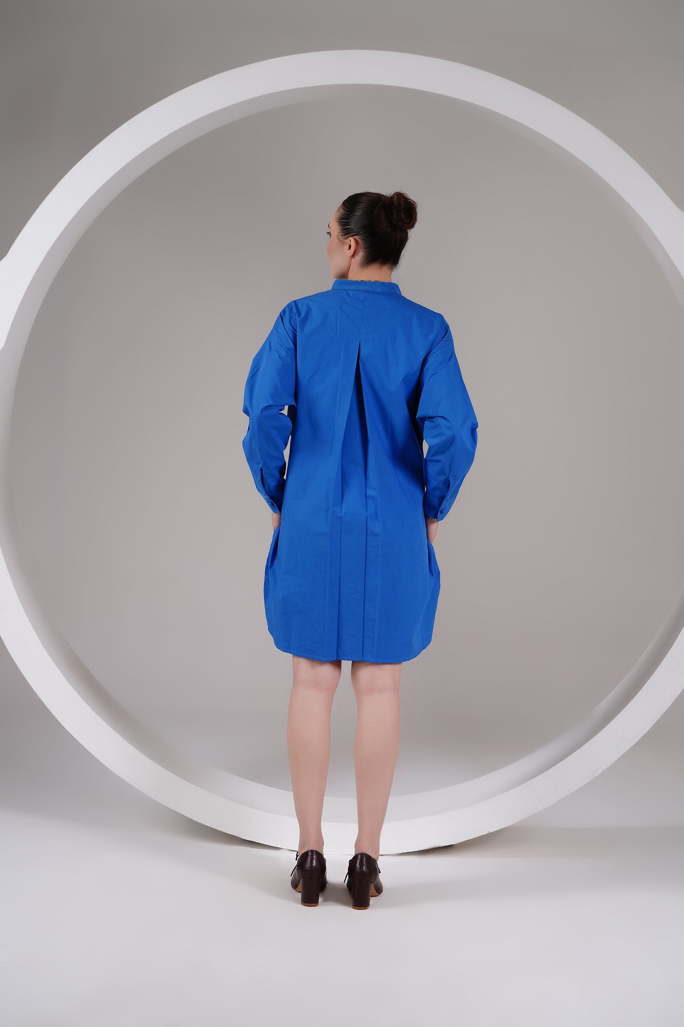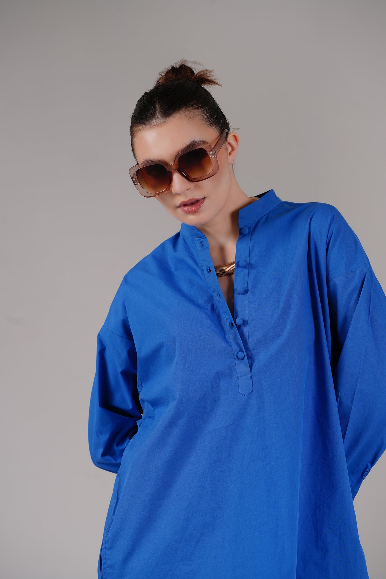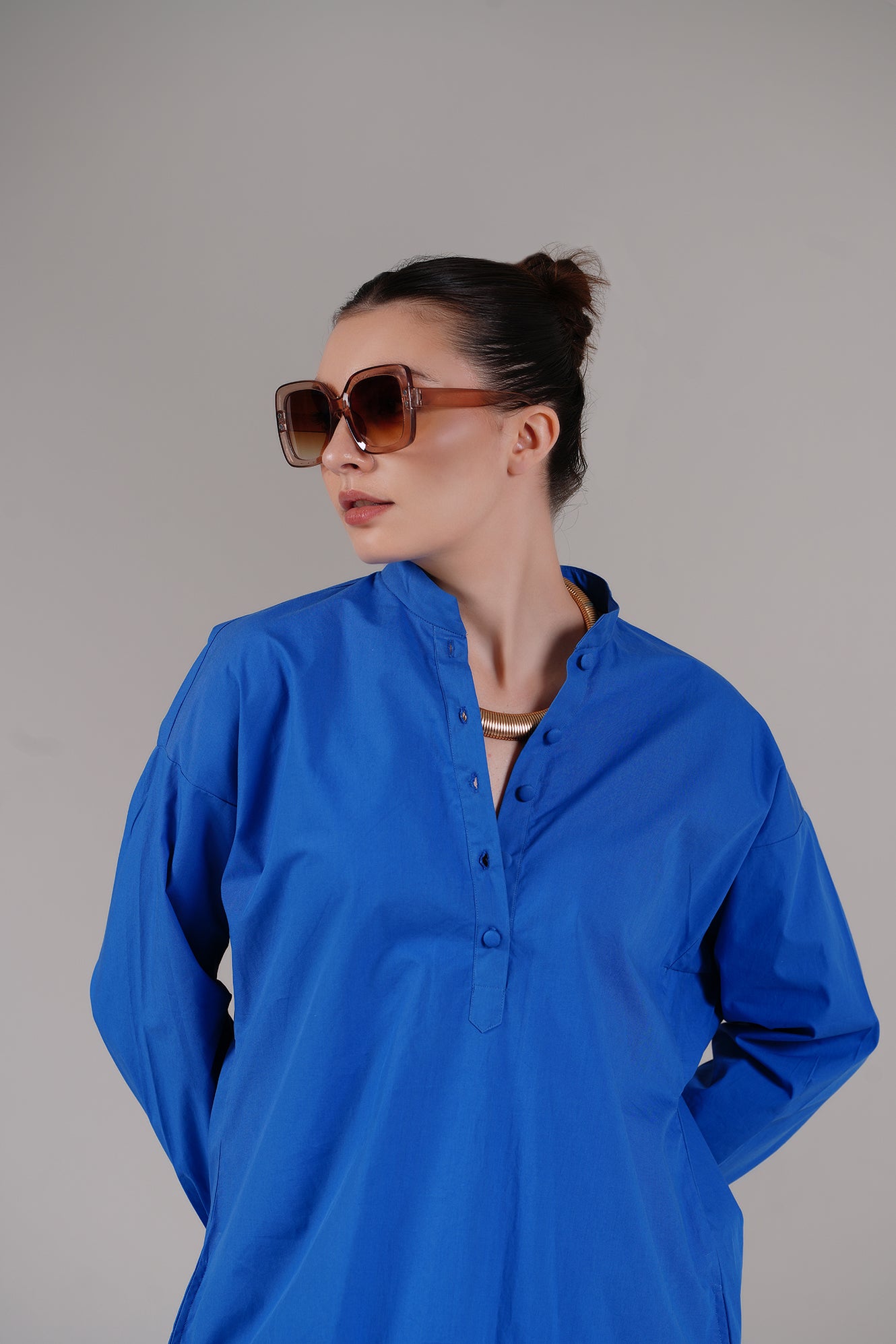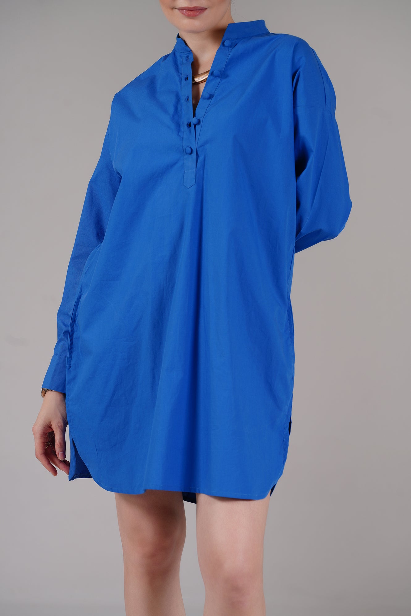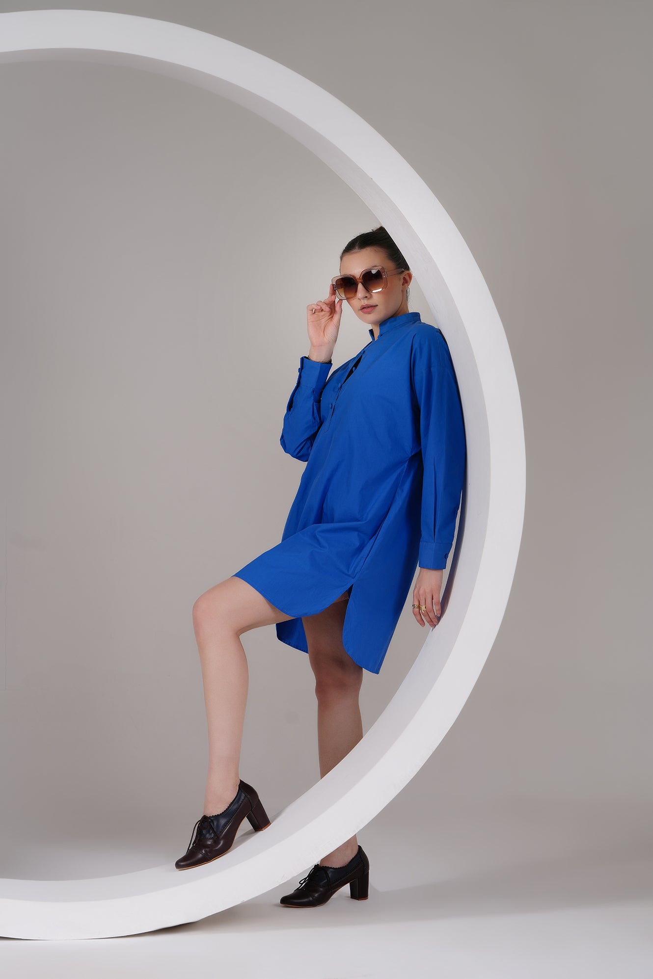 Minimal, bold, and versatile — this shirt dress in royal blue is designed for everyday ease. Crafted in 100% cotton poplin, it features a straight relaxed silhouette with a clean mandarin collar, a half-button placket, and long sleeves. Designed to be worn as a standalone dress or styled as a tunic, it’s the perfect mix of comfort and quiet statement.
