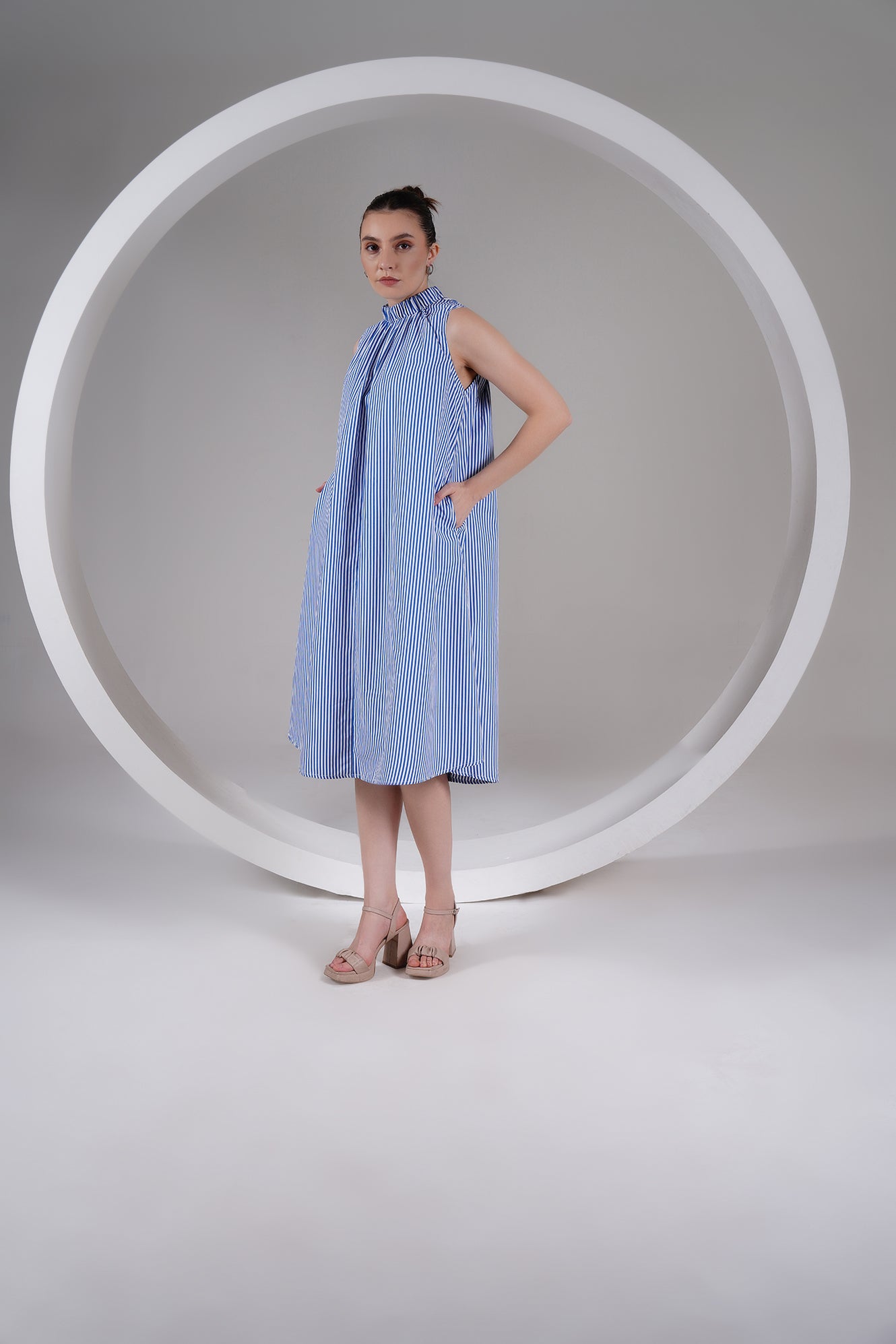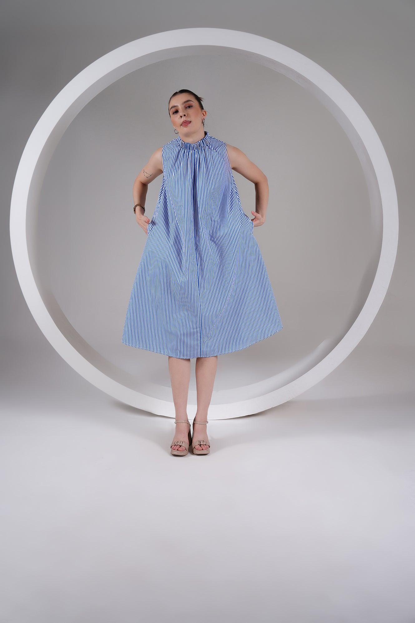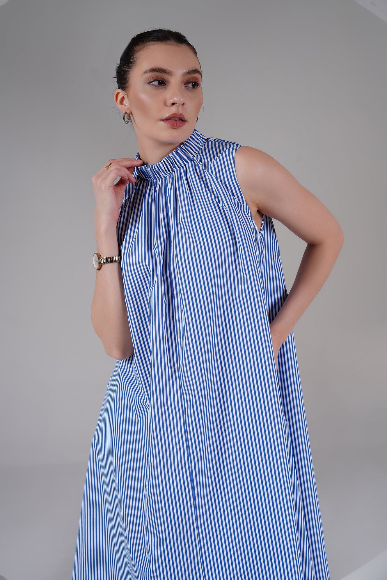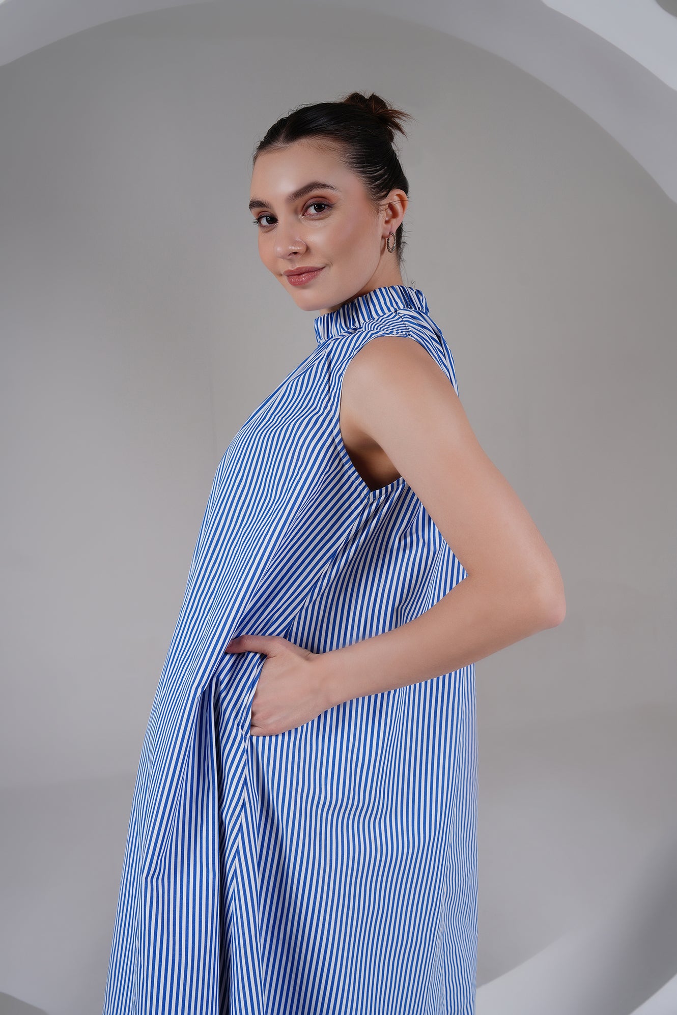 A timeless blend of ease and elegance — this Blue Striped High Neck A-Line Dress is designed for slow, breathable living. Crafted from 100% cotton poplin, it features a gathered neckline, roomy silhouette, and side pockets for everyday comfort. The flowy shape moves with you, keeping you cool and effortless through the day.