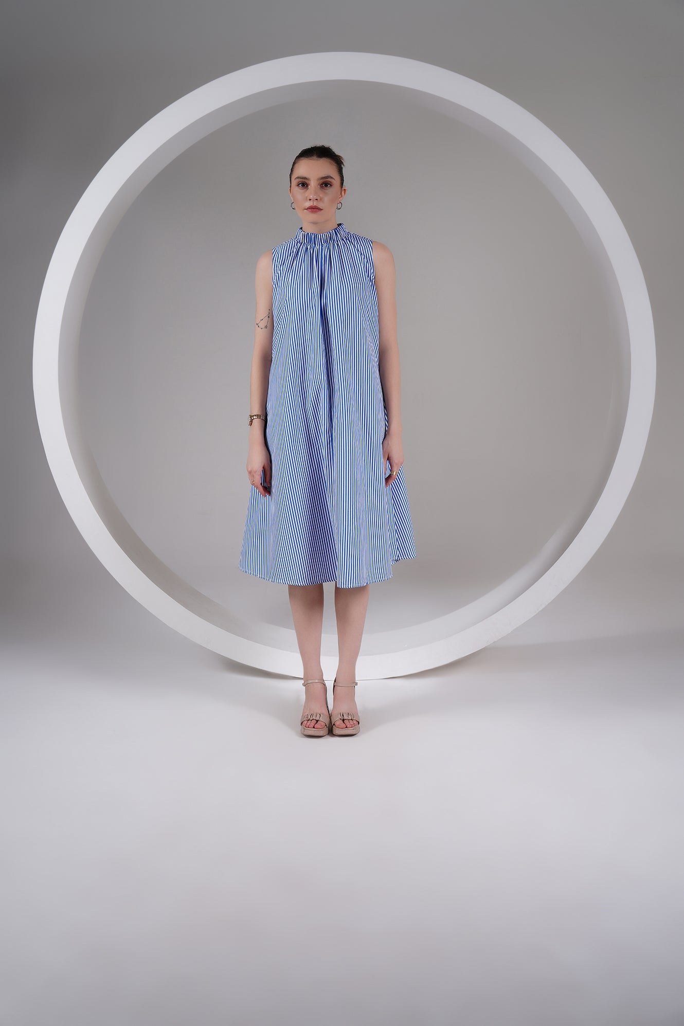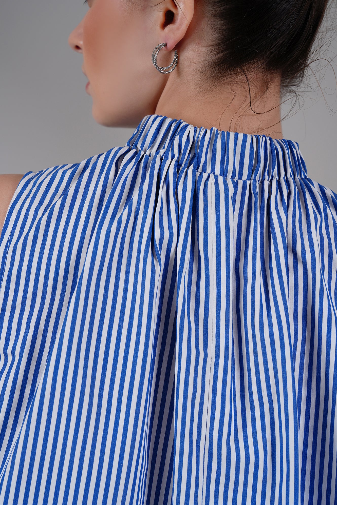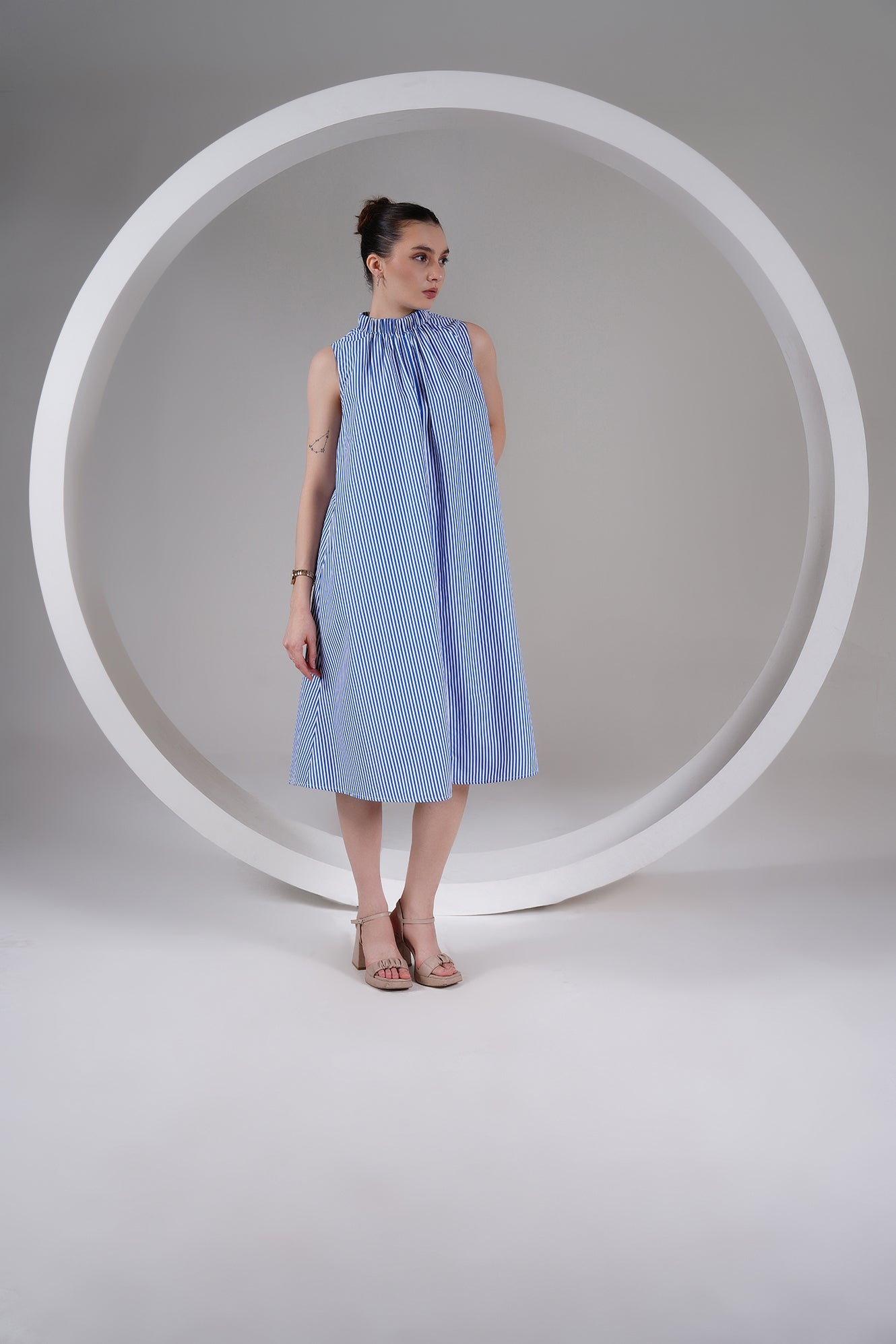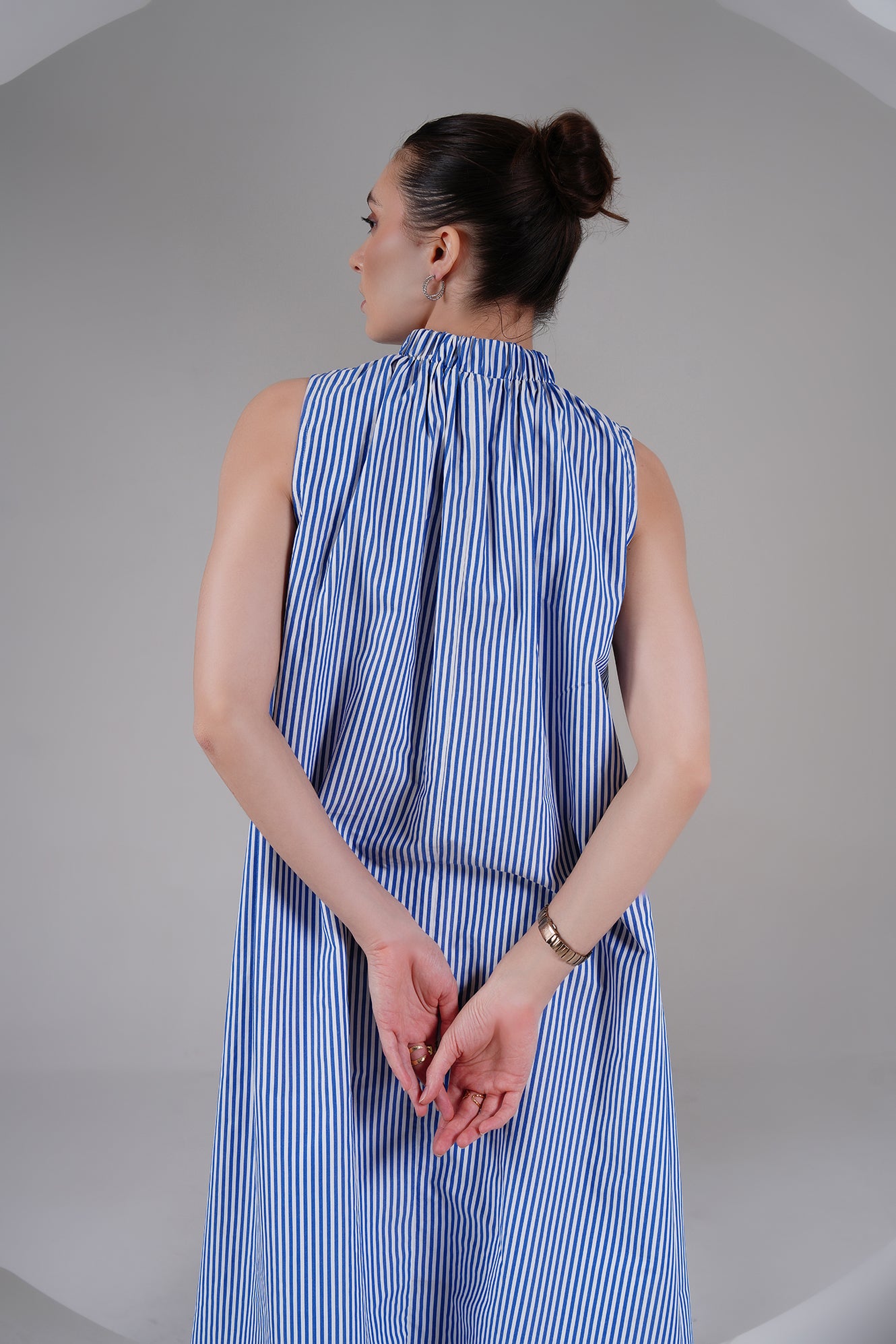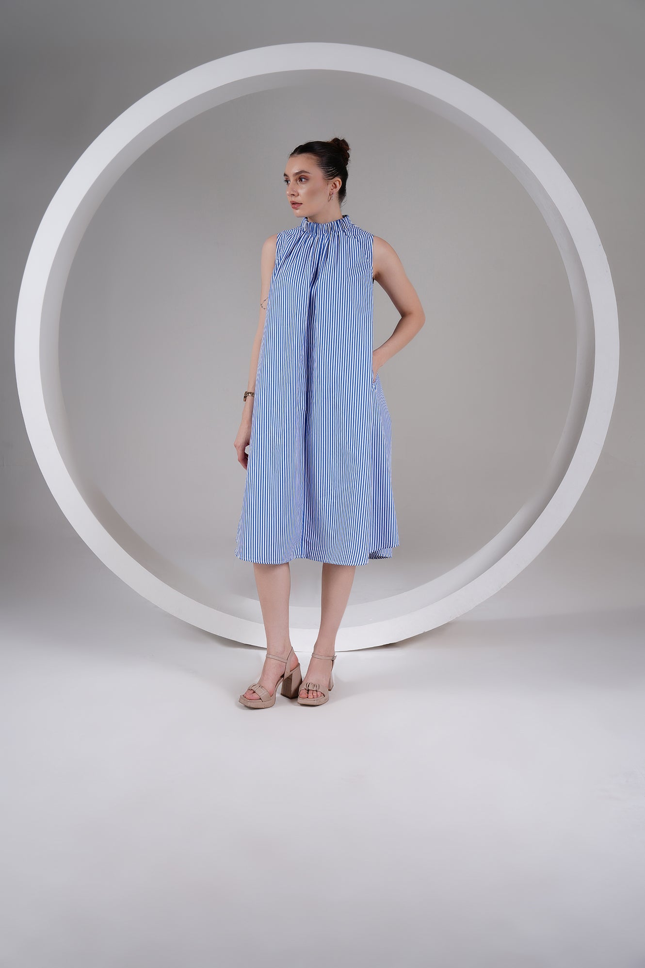 A timeless blend of ease and elegance — this Blue Striped High Neck A-Line Dress is designed for slow, breathable living. Crafted from 100% cotton poplin, it features a gathered neckline, roomy silhouette, and side pockets for everyday comfort. The flowy shape moves with you, keeping you cool and effortless through the day.