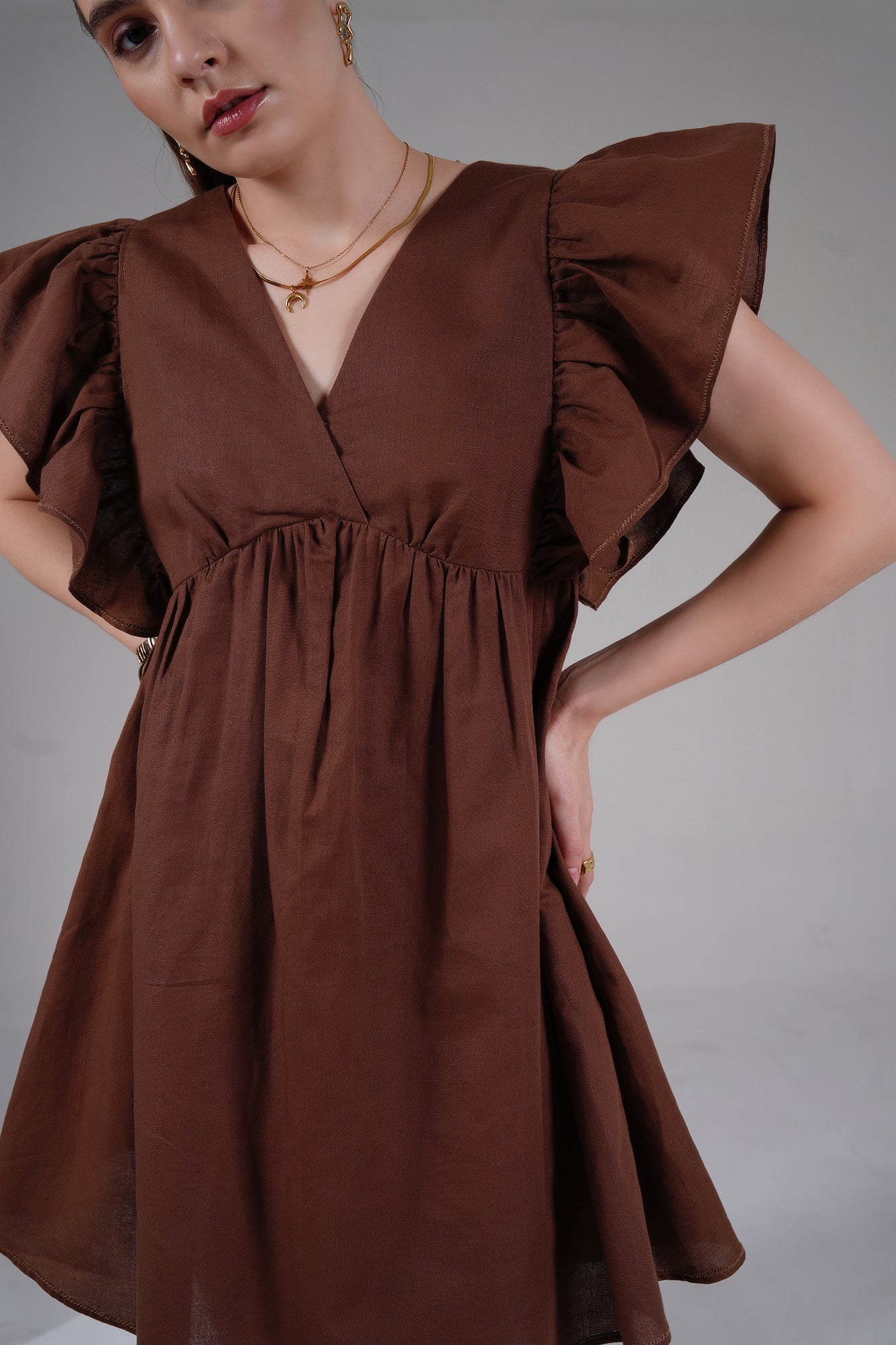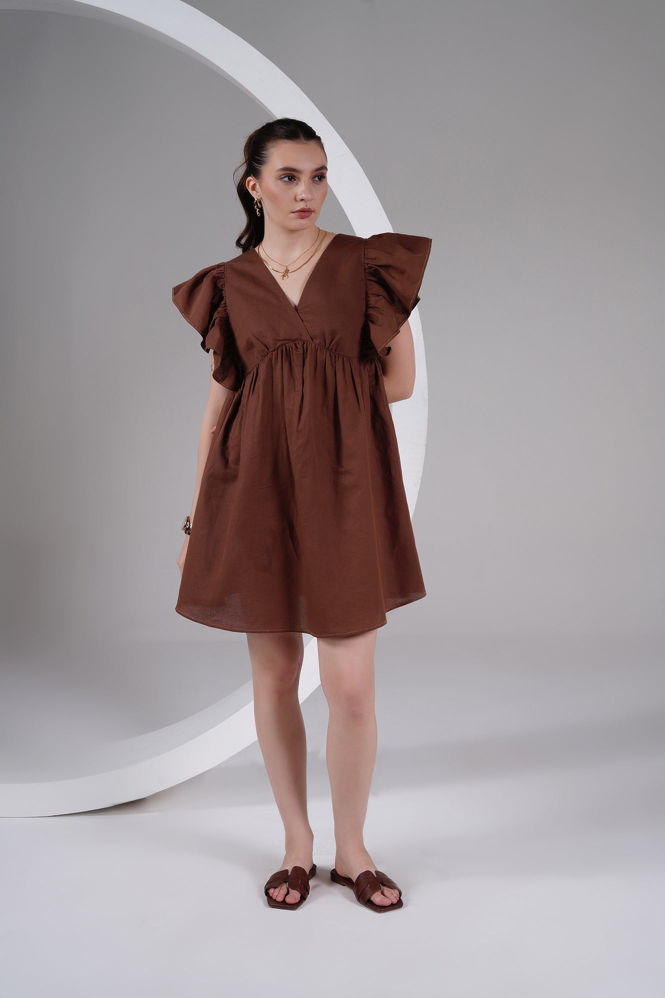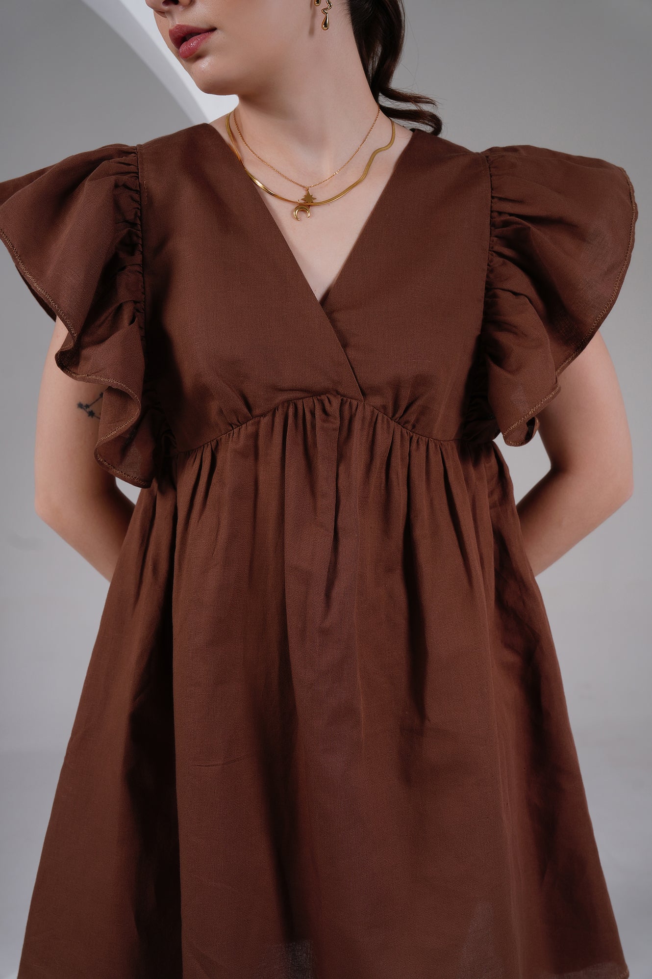 Brown Linen Ruffle Sleeve Mini Dress