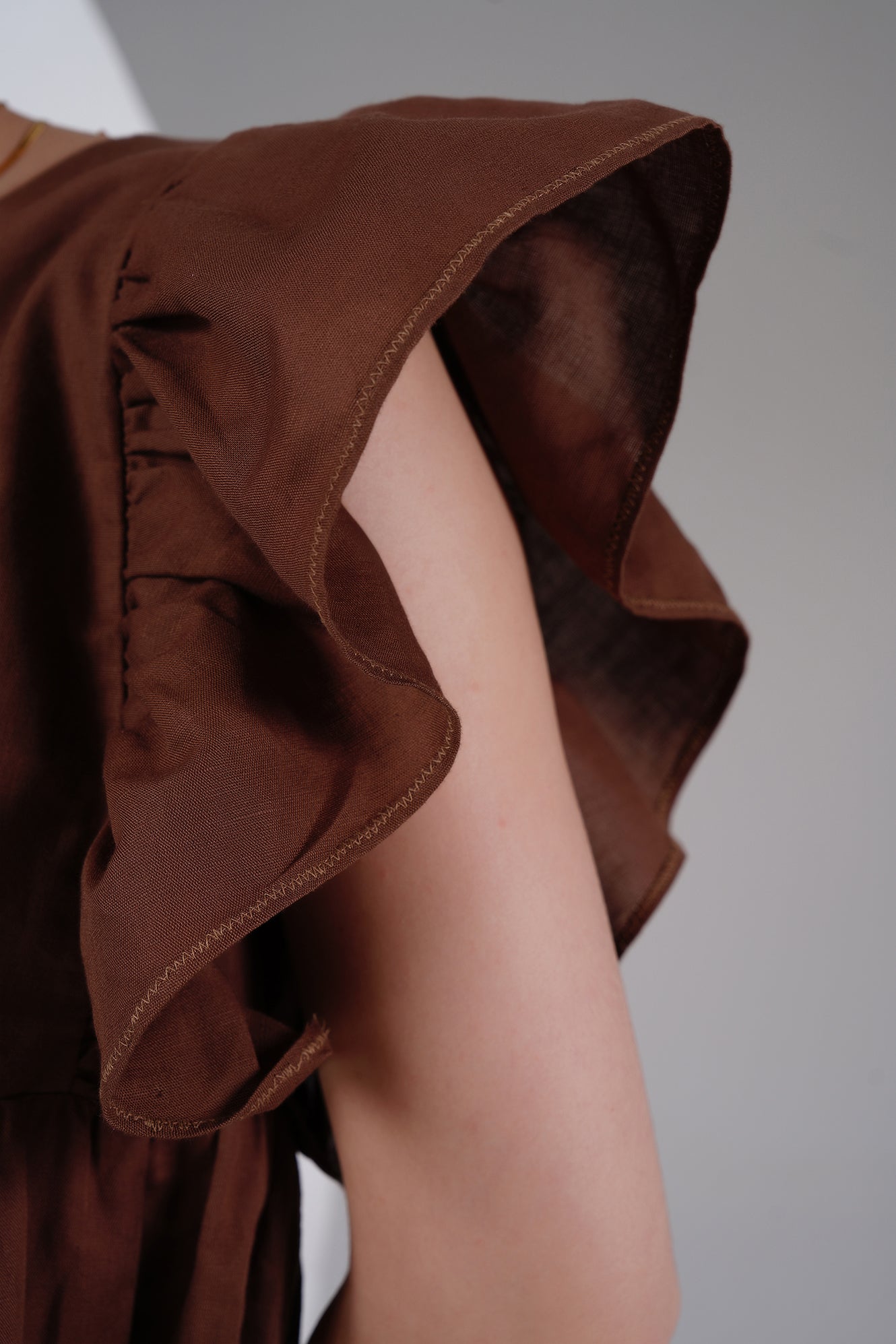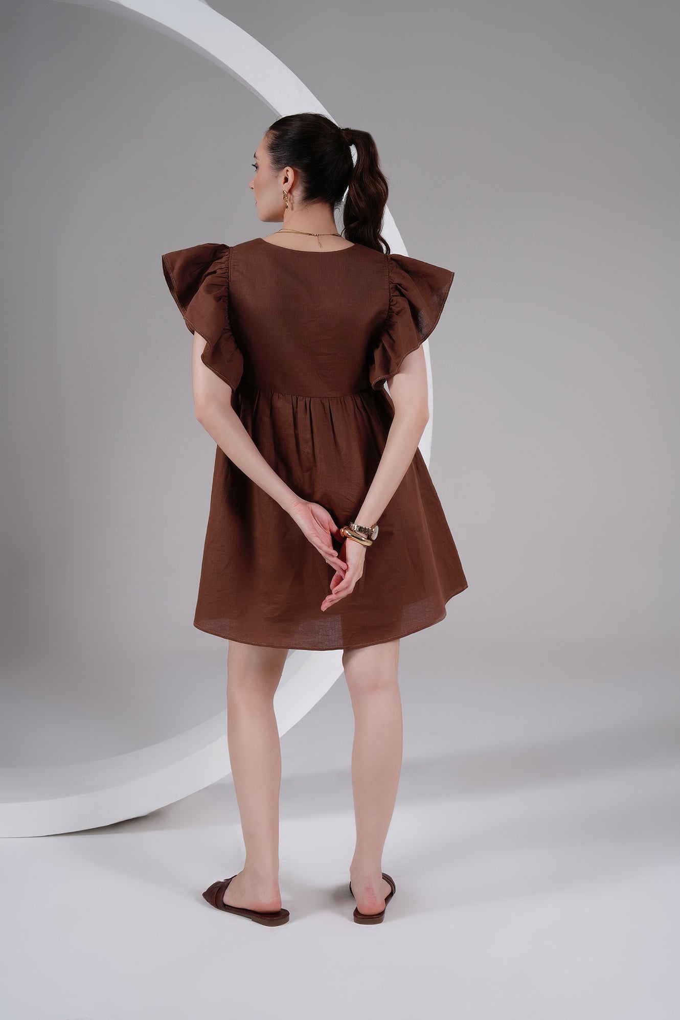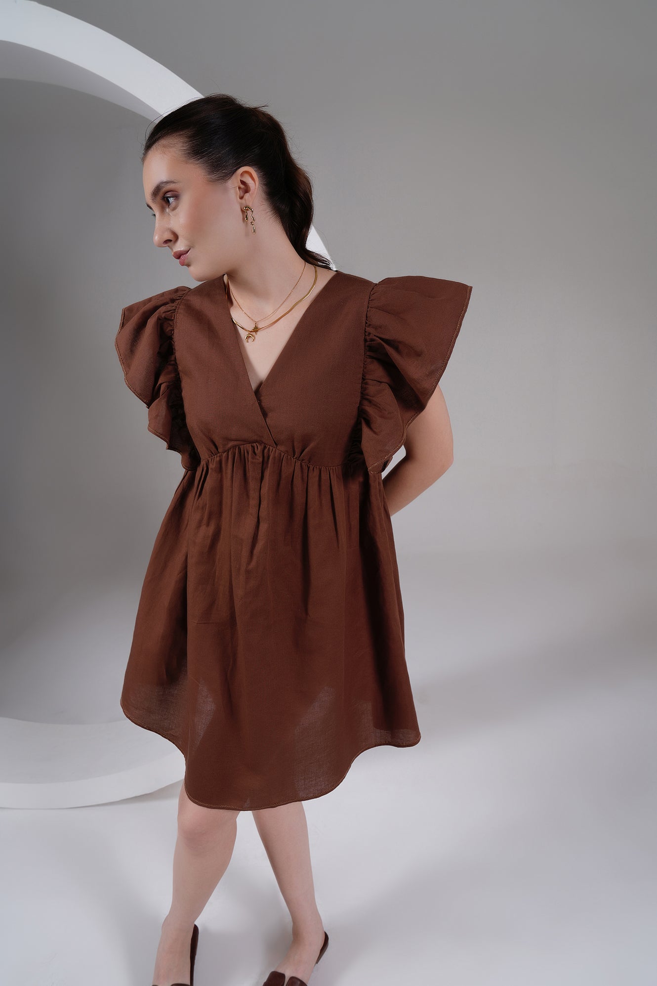 Brown Linen Ruffle Sleeve Mini Dress