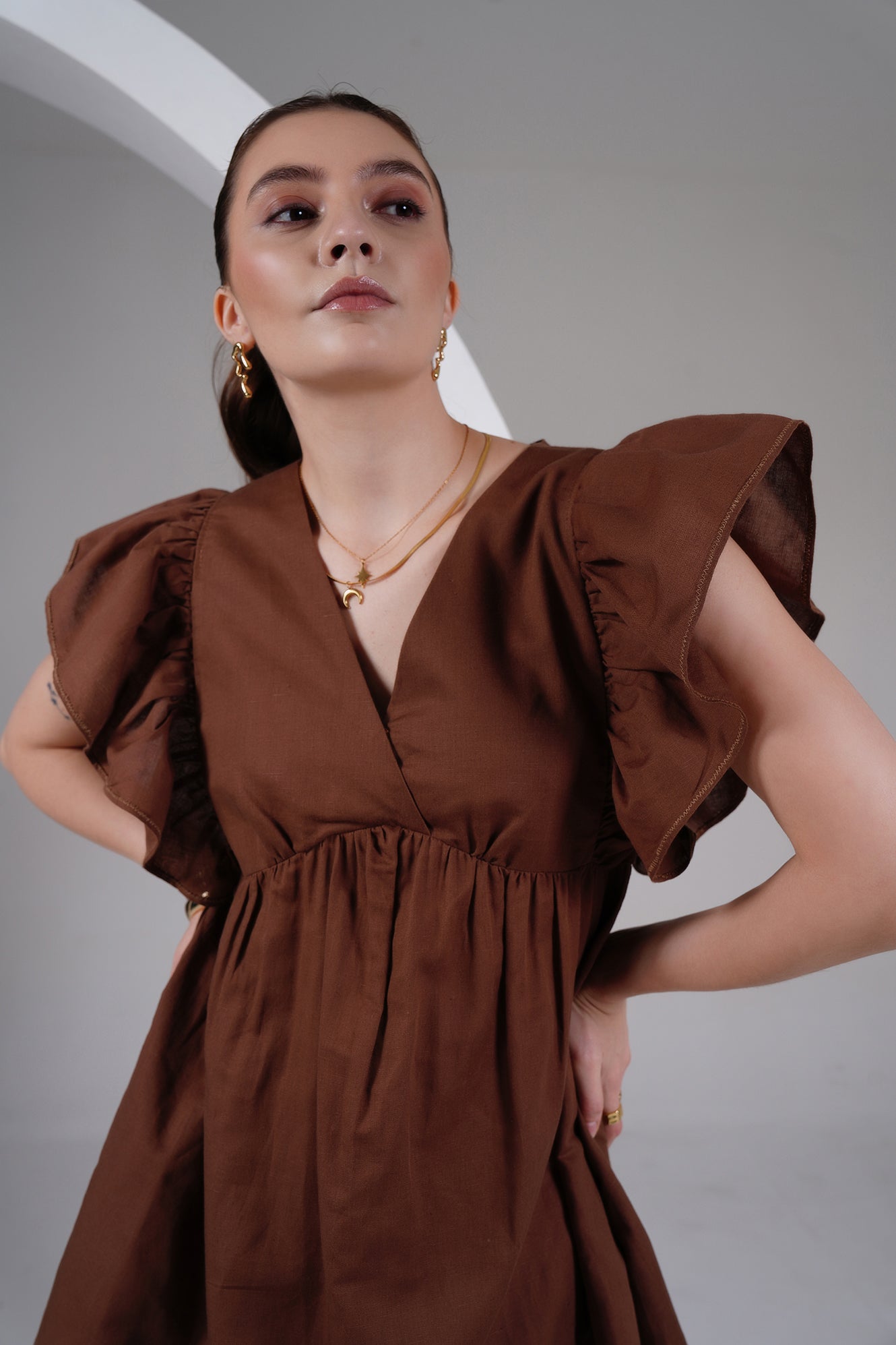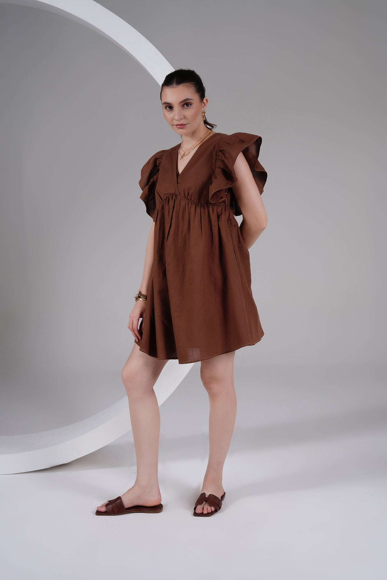 Effortless everyday dressing in a minimal dress you’ll return to all season. Crafted from soft, breathable 100% Linen, this rich chocolate brown mini dress features a voluminous, easy silhouette with a flattering V-neck, cinched empire waist, and dramatic ruffle sleeves for versatile styling. Light, airy, and elevated — perfect for casual dates, weekend brunches, resort wear, or slow afternoons.