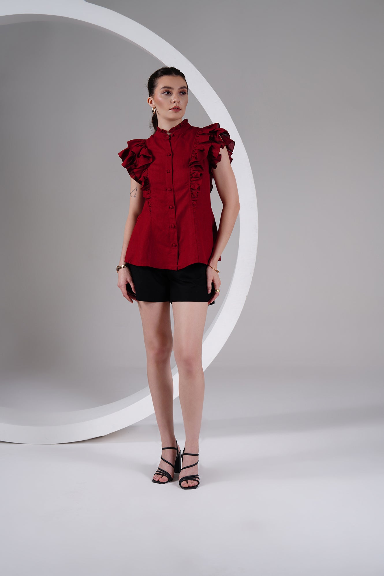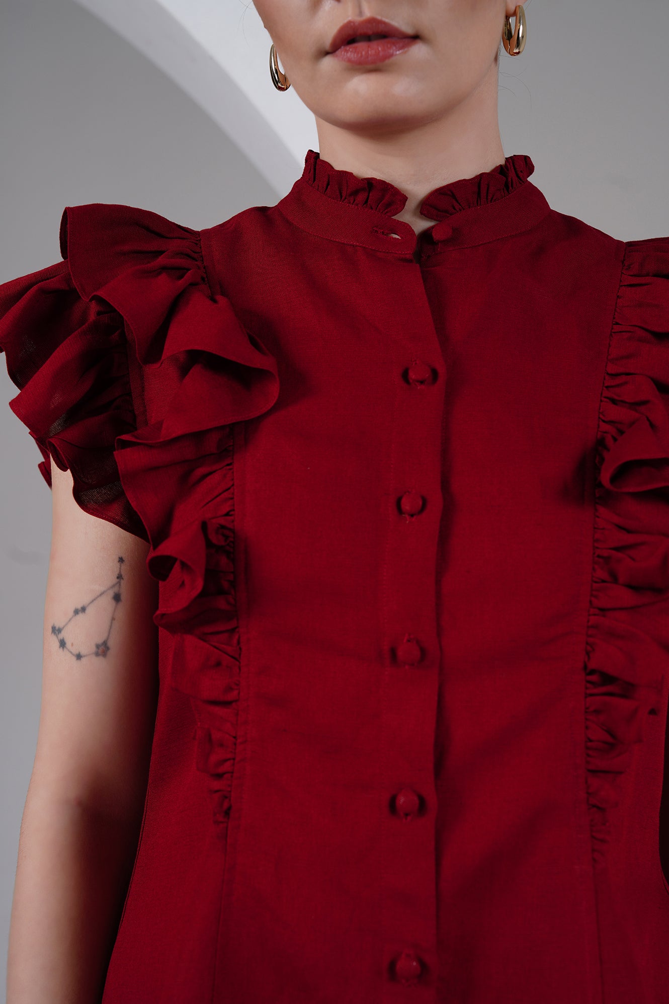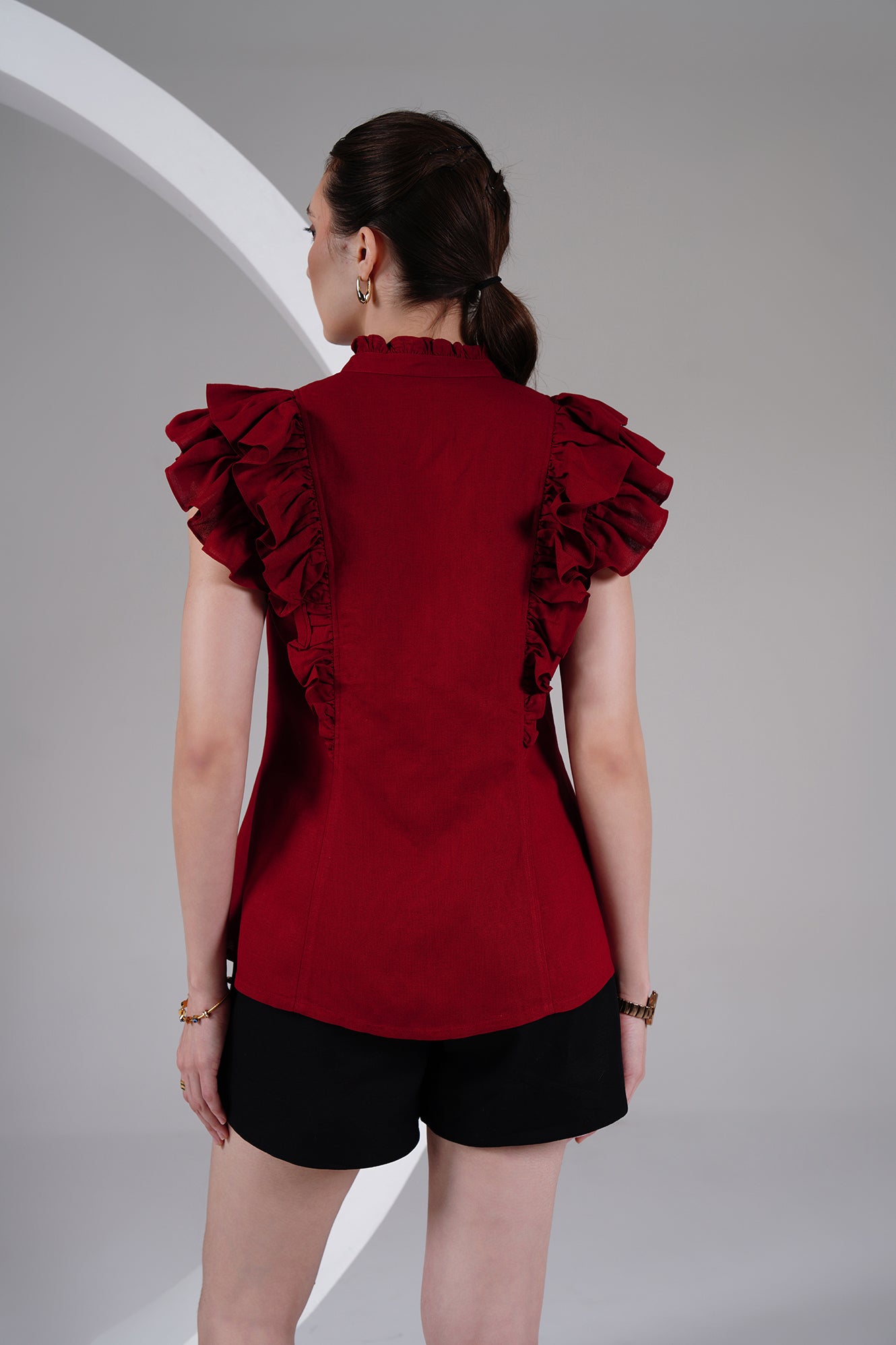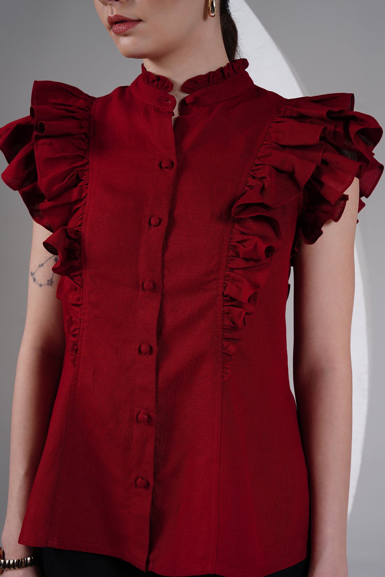 Statement-making yet timeless — this burgundy cotton-linen top brings a bold, romantic edge to your everyday wardrobe. Designed with ruffled cap sleeves, a ruffled high neckline, and a front button placket with fabric-covered buttons, it balances structure with feminine detailing.