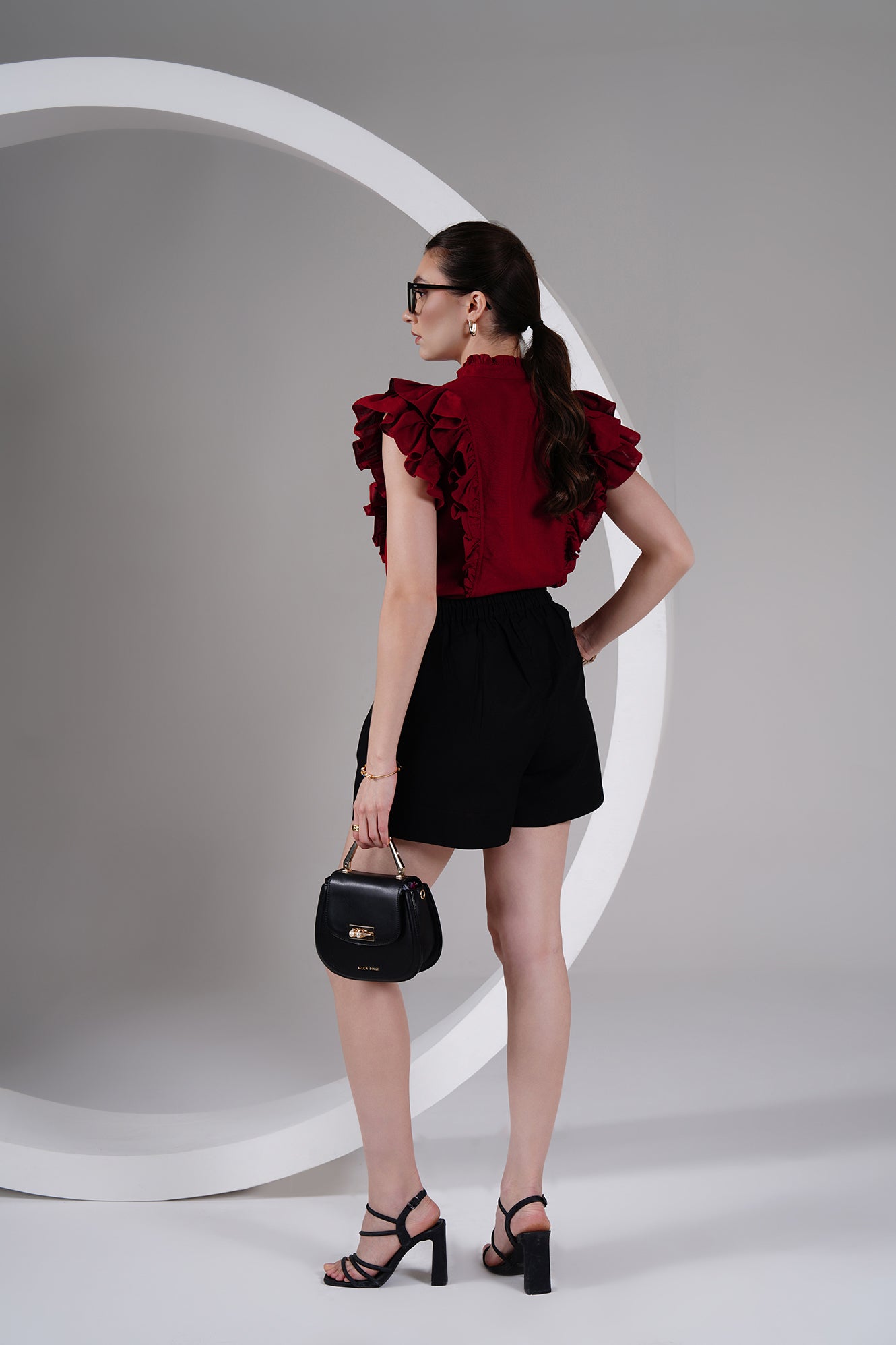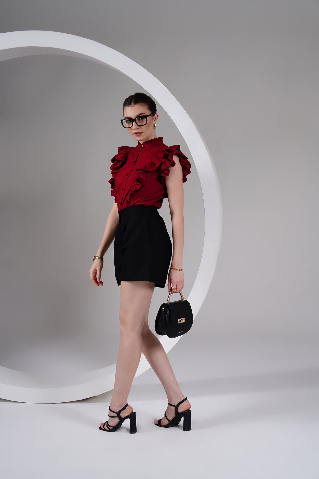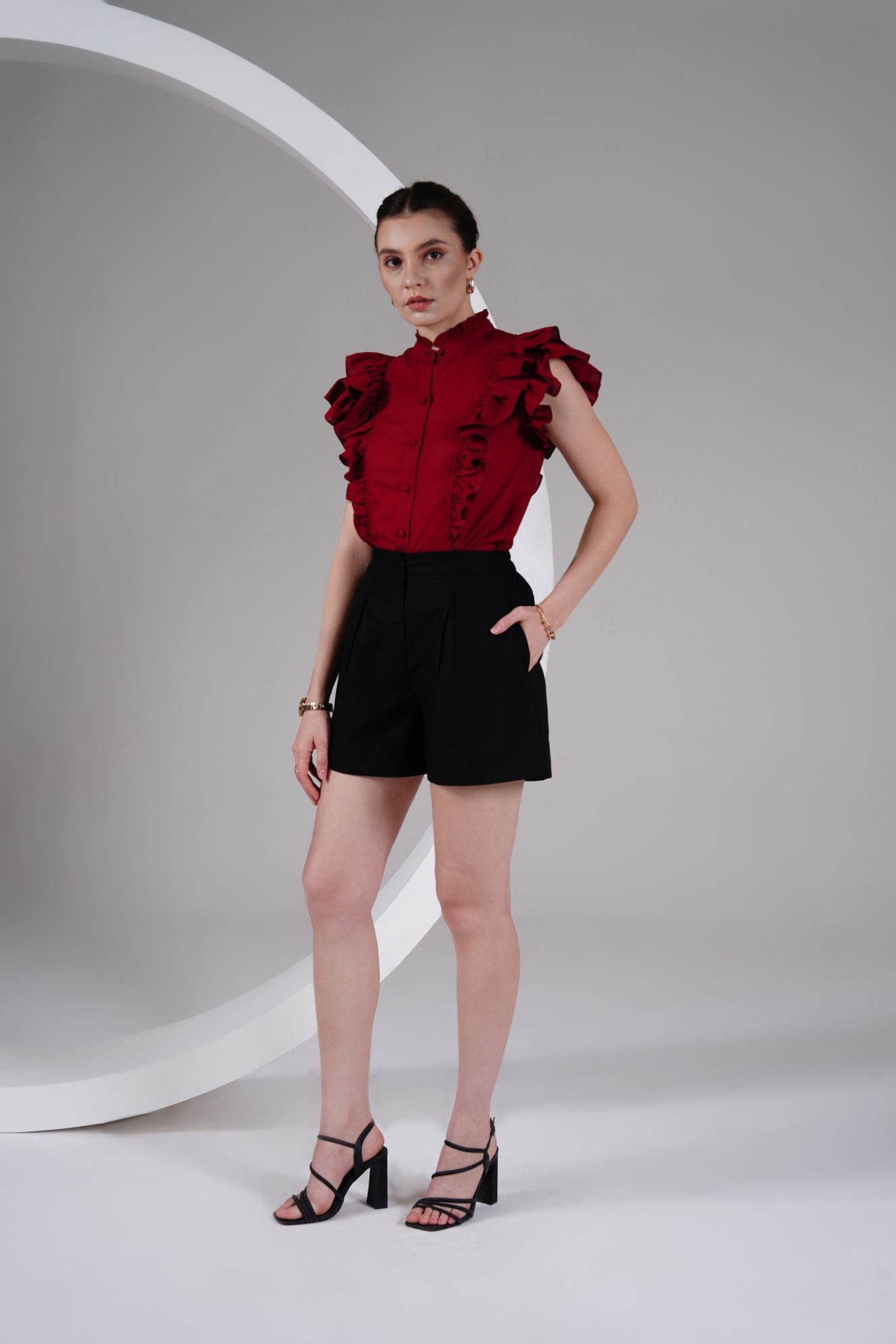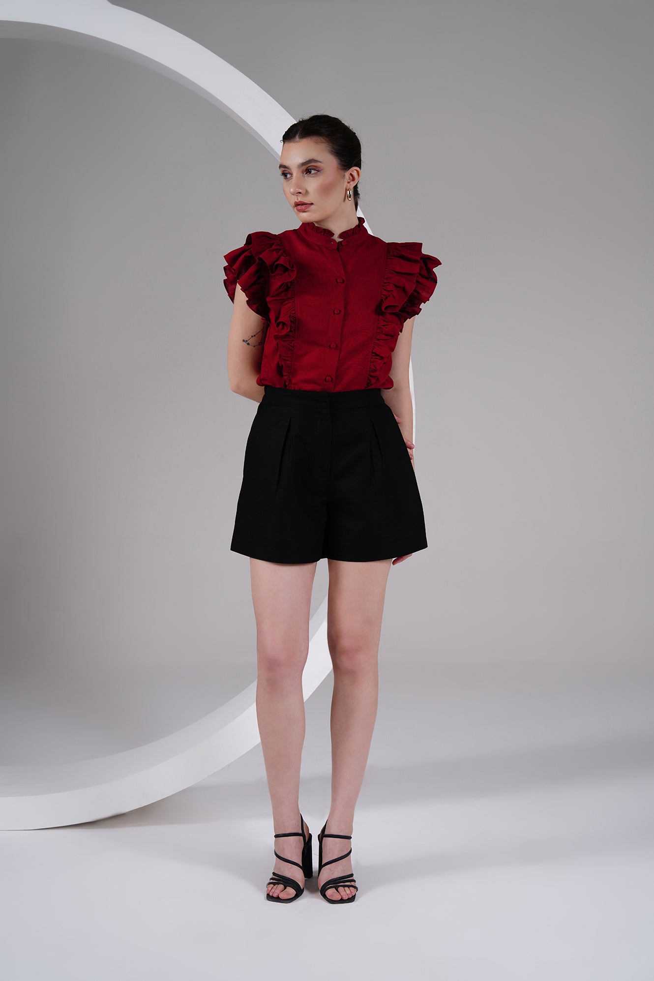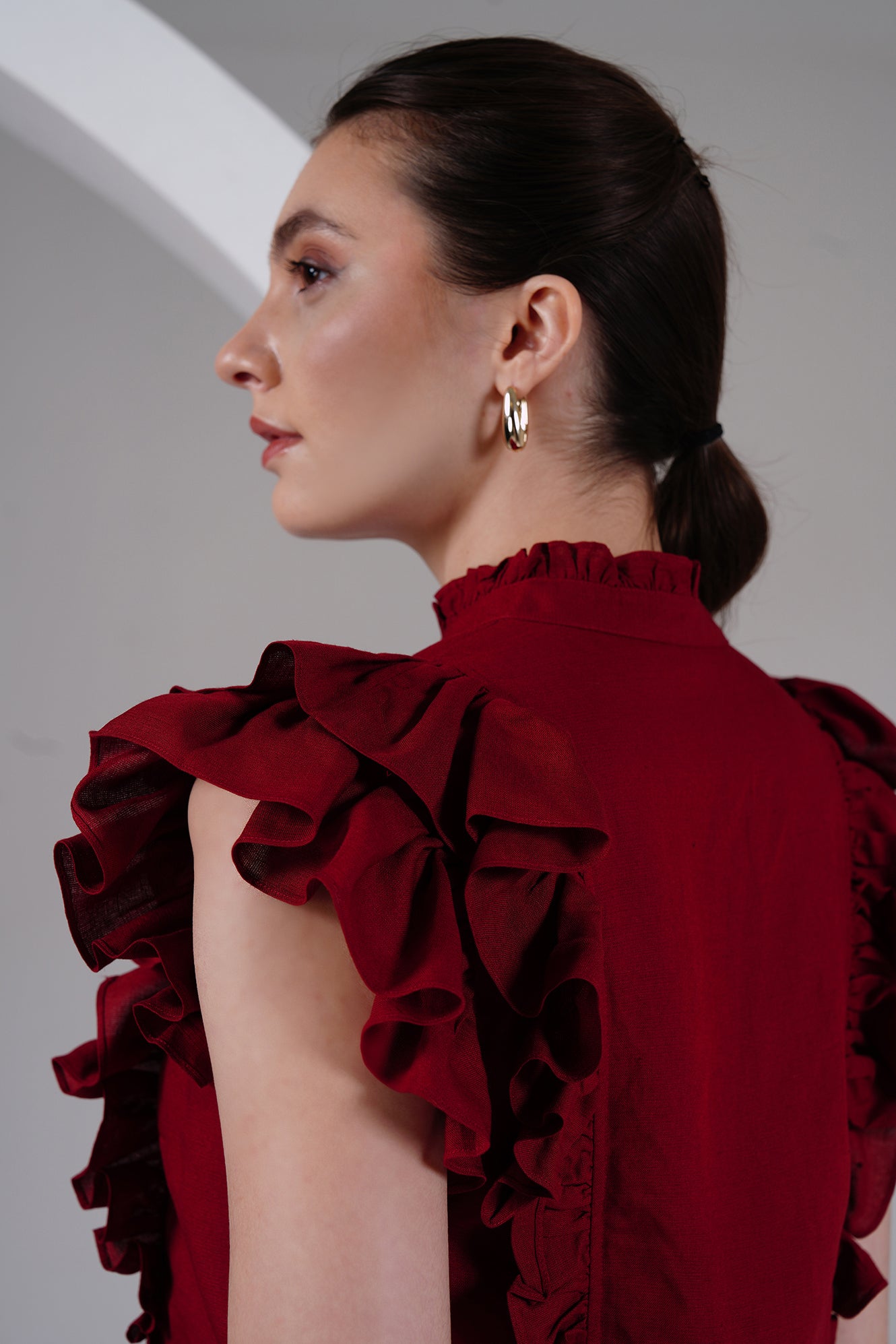 Statement-making yet timeless — this burgundy cotton-linen top brings a bold, romantic edge to your everyday wardrobe. Designed with ruffled cap sleeves, a ruffled high neckline, and a front button placket with fabric-covered buttons, it balances structure with feminine detailing.