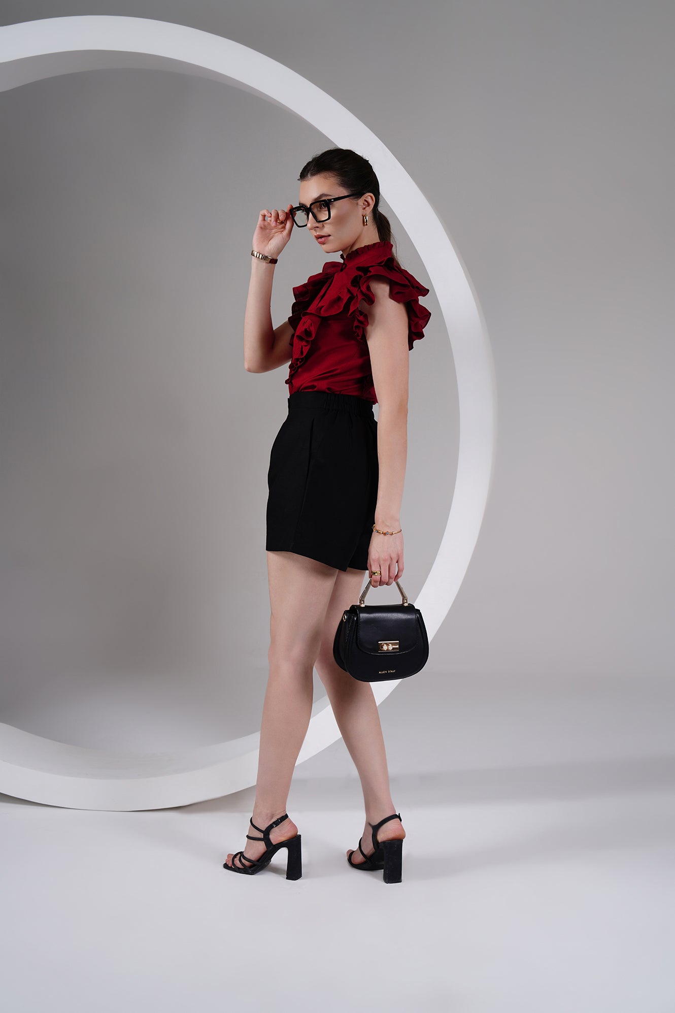 Neckline: Ruffled high neck