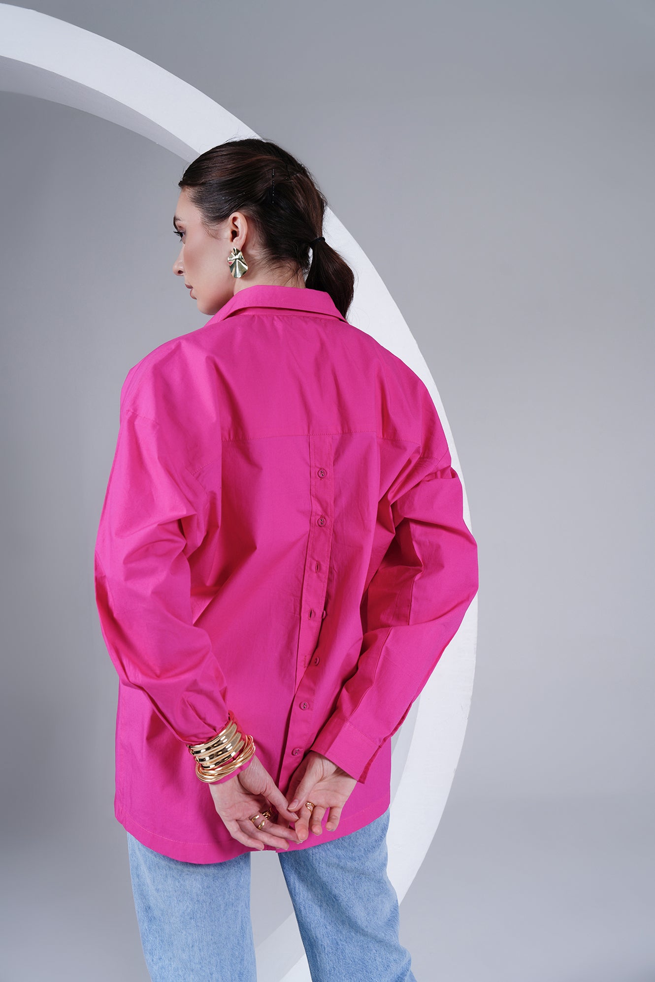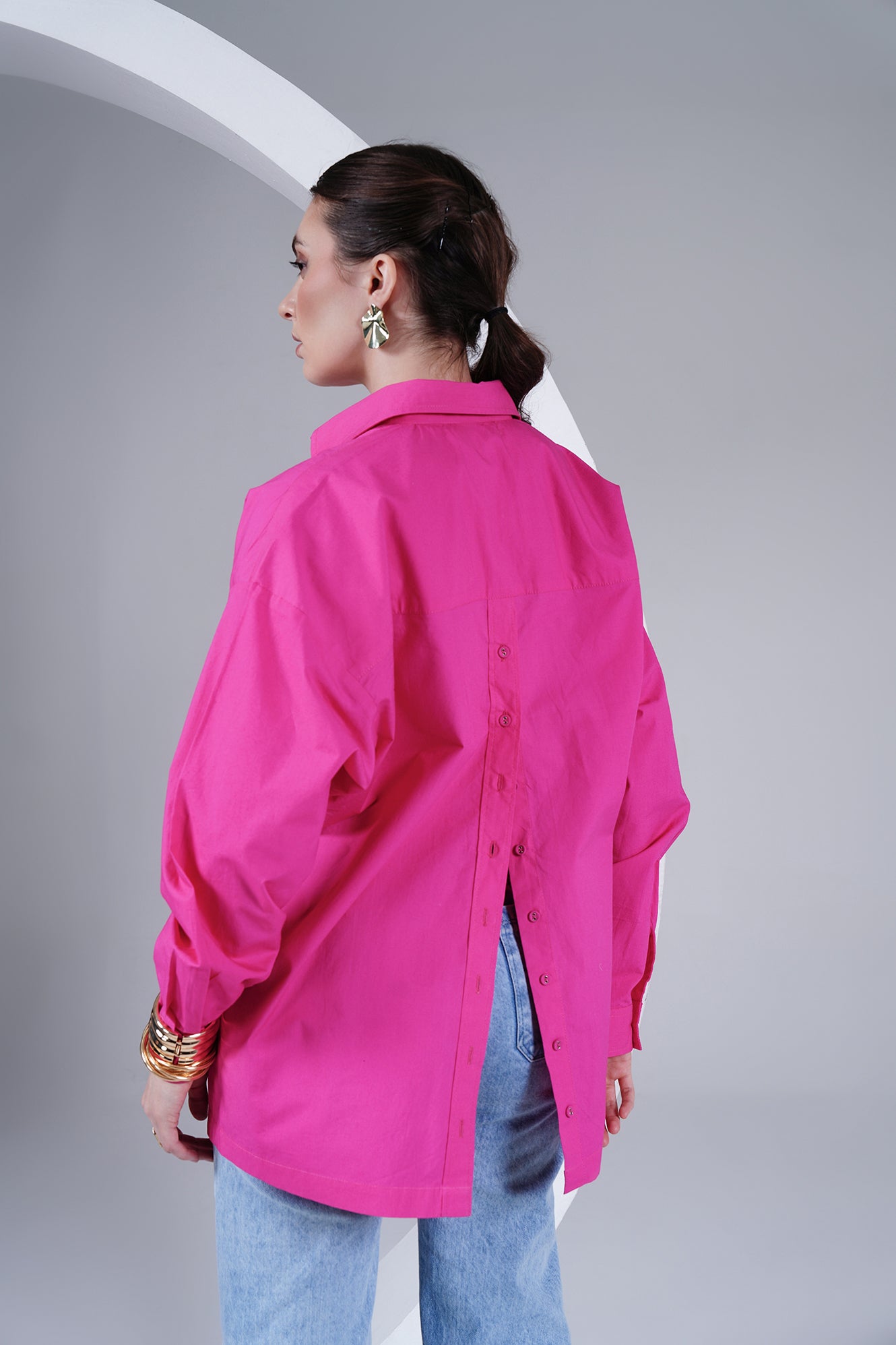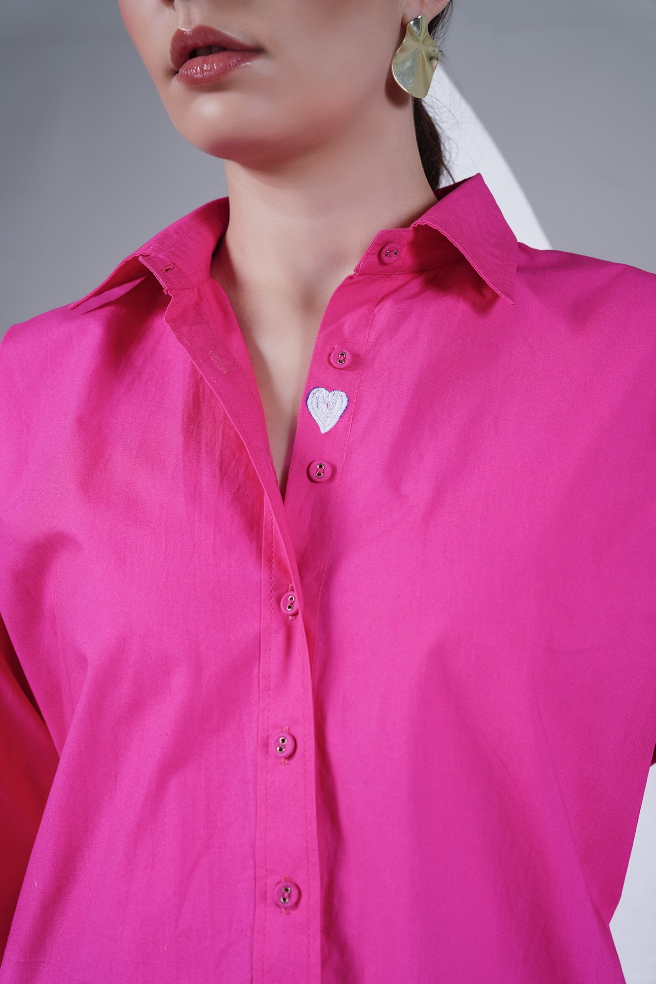 A playful twist on a classic silhouette – this oversized shirt in vibrant hot pink brings comfort and boldness together. Crafted in 100% cotton poplin, it drapes effortlessly while keeping you cool and easy all day. Designed with a button-down front, back-button detailing, and a subtle embroidered heart on the placket, it’s a piece that makes a statement while staying minimal.