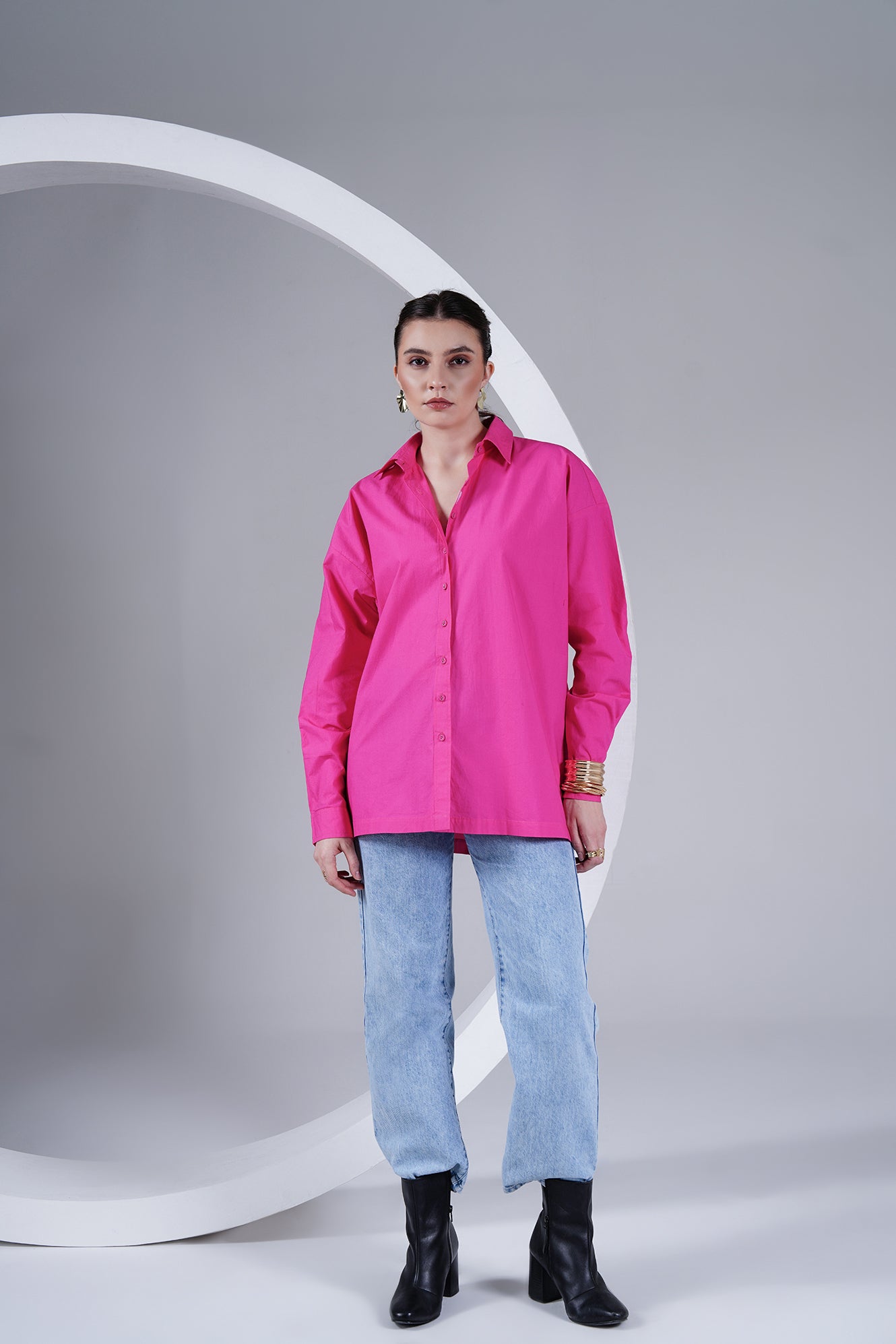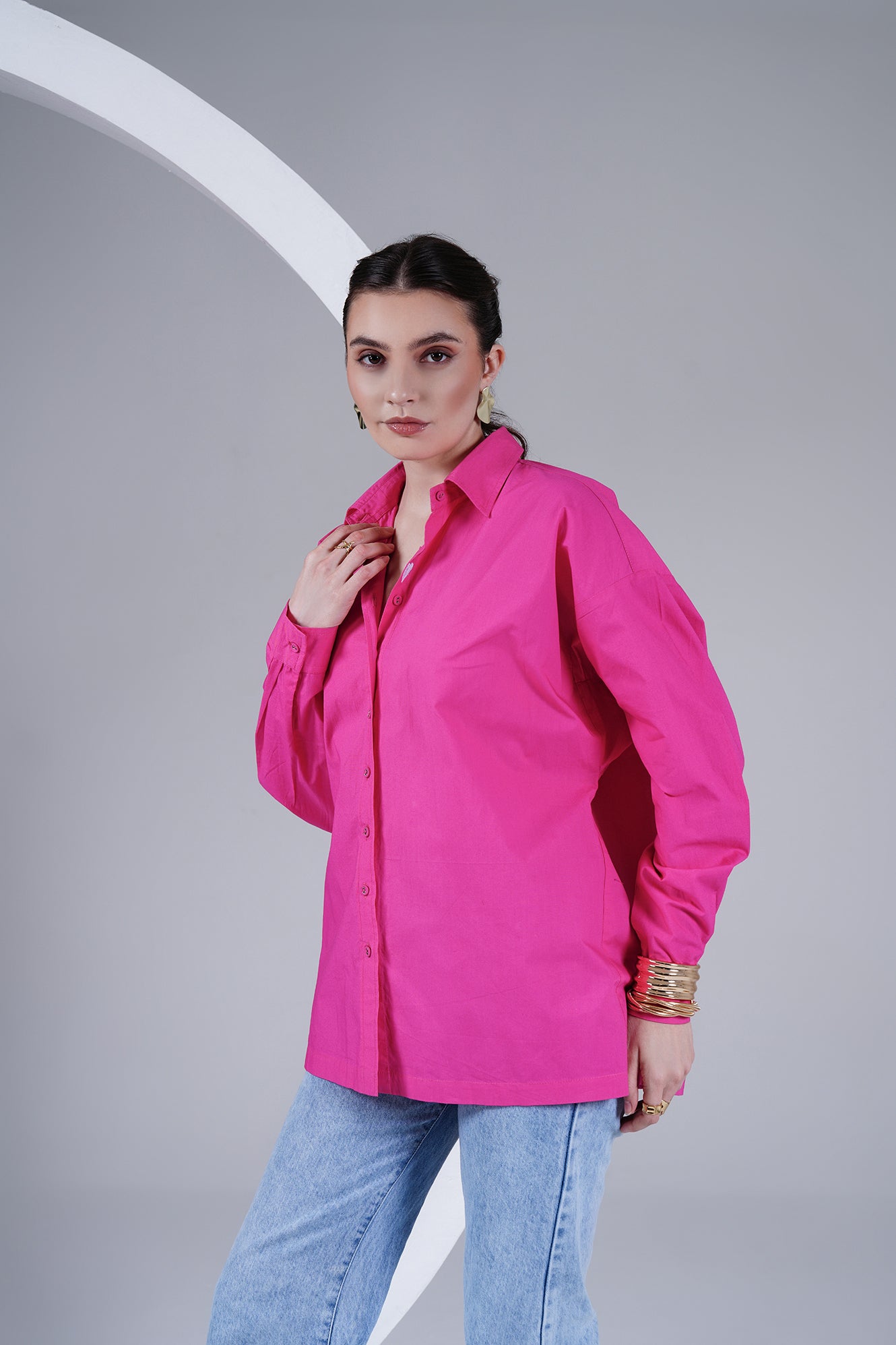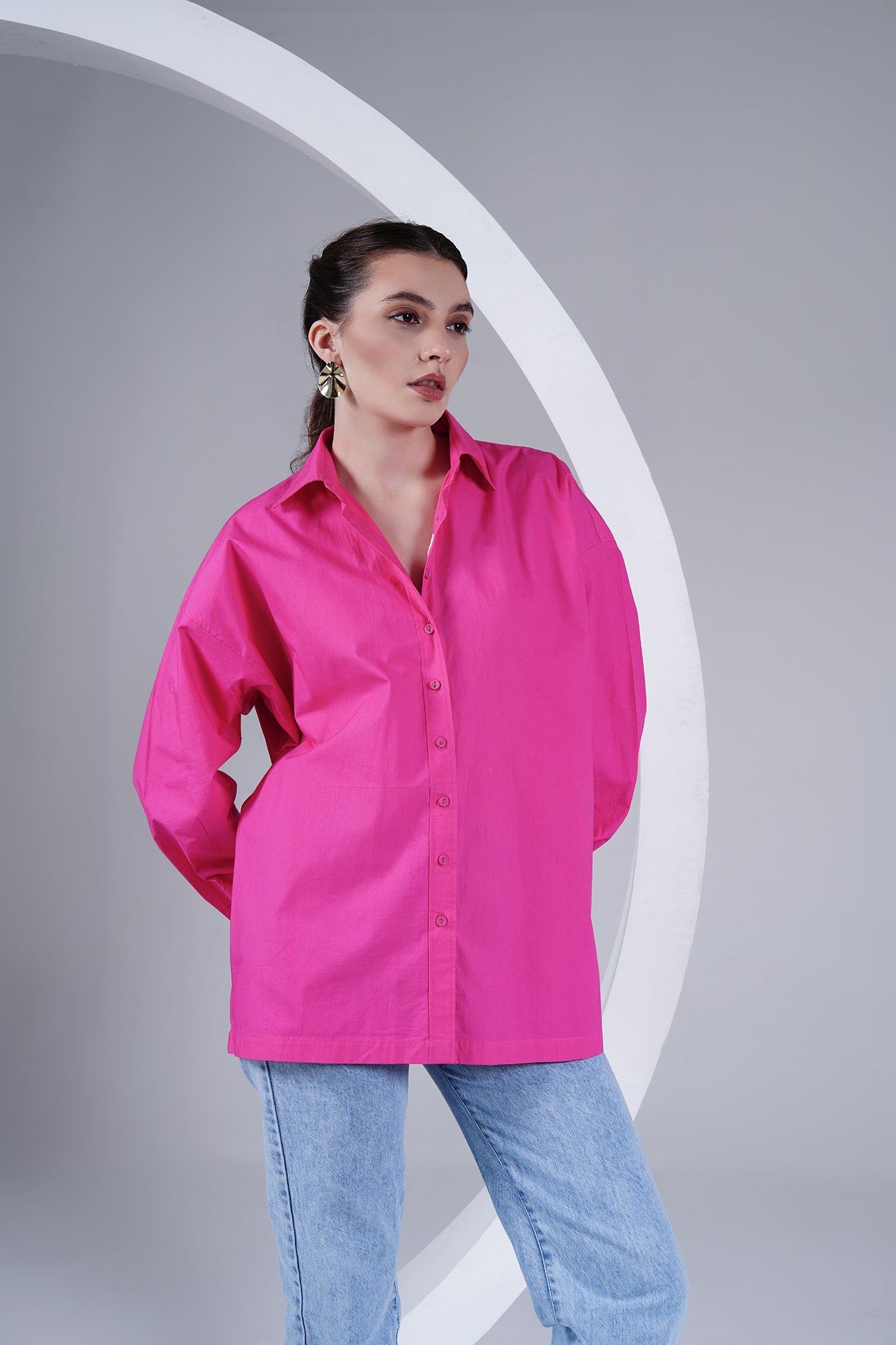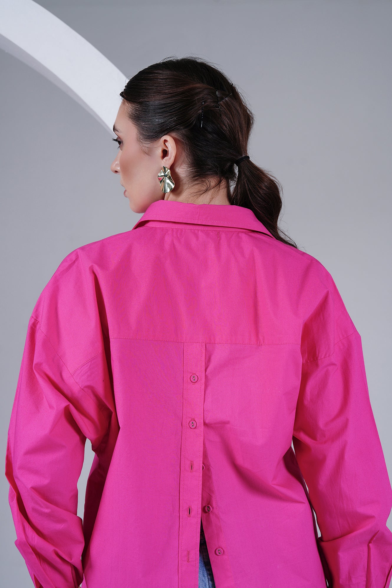 A playful twist on a classic silhouette – this oversized shirt in vibrant hot pink brings comfort and boldness together. Crafted in 100% cotton poplin, it drapes effortlessly while keeping you cool and easy all day. Designed with a button-down front, back-button detailing, and a subtle embroidered heart on the placket, it’s a piece that makes a statement while staying minimal.