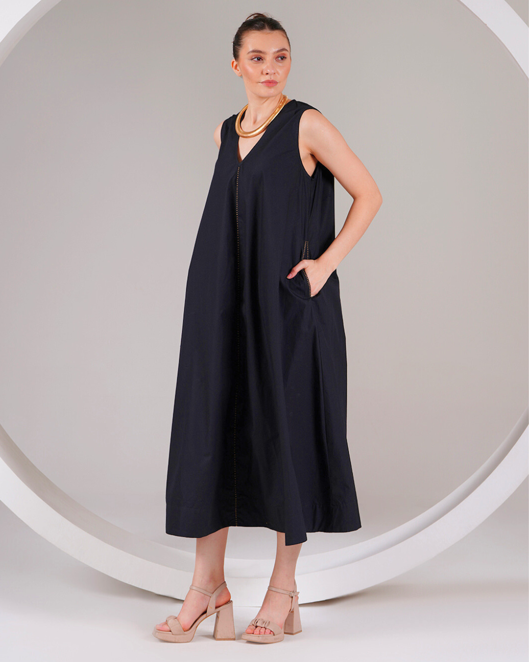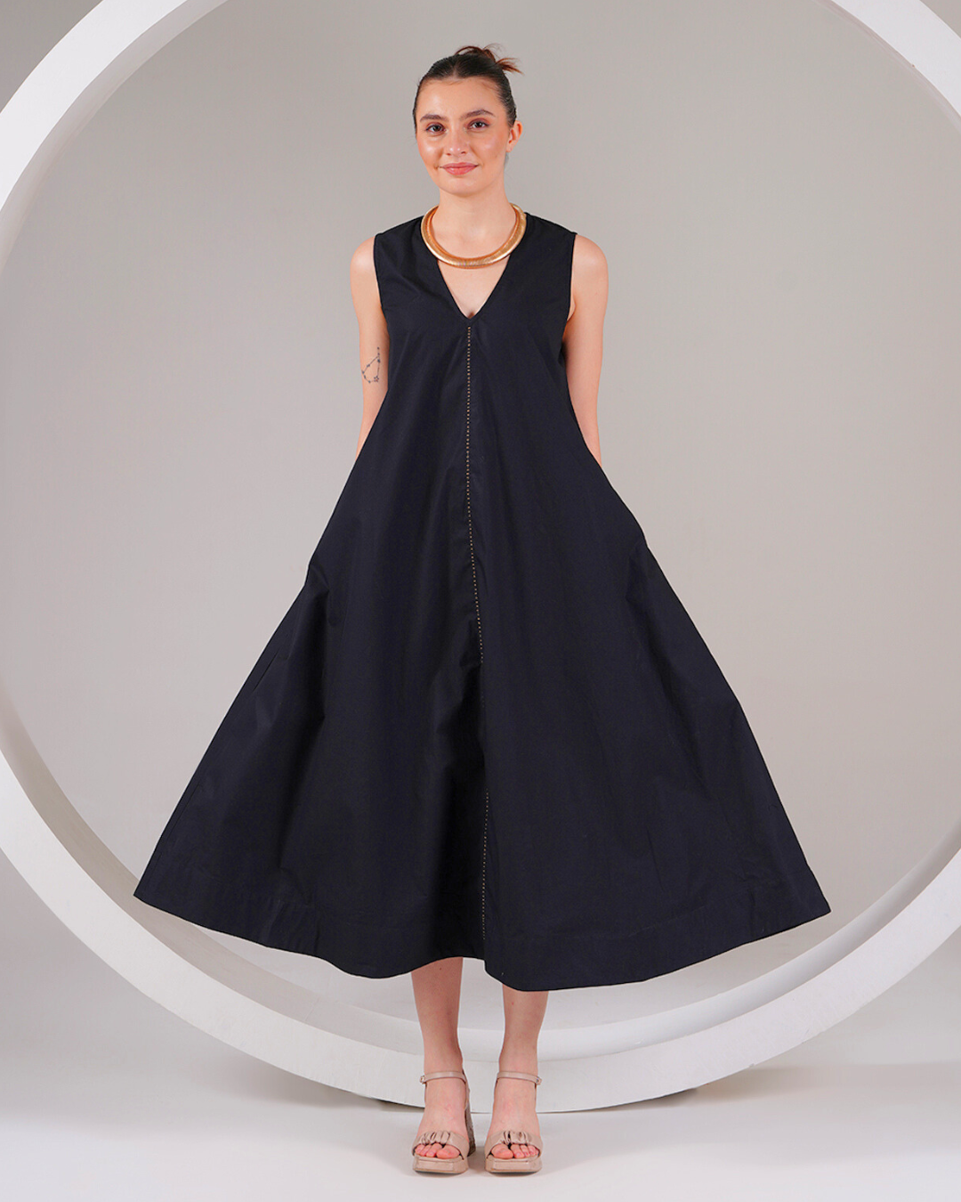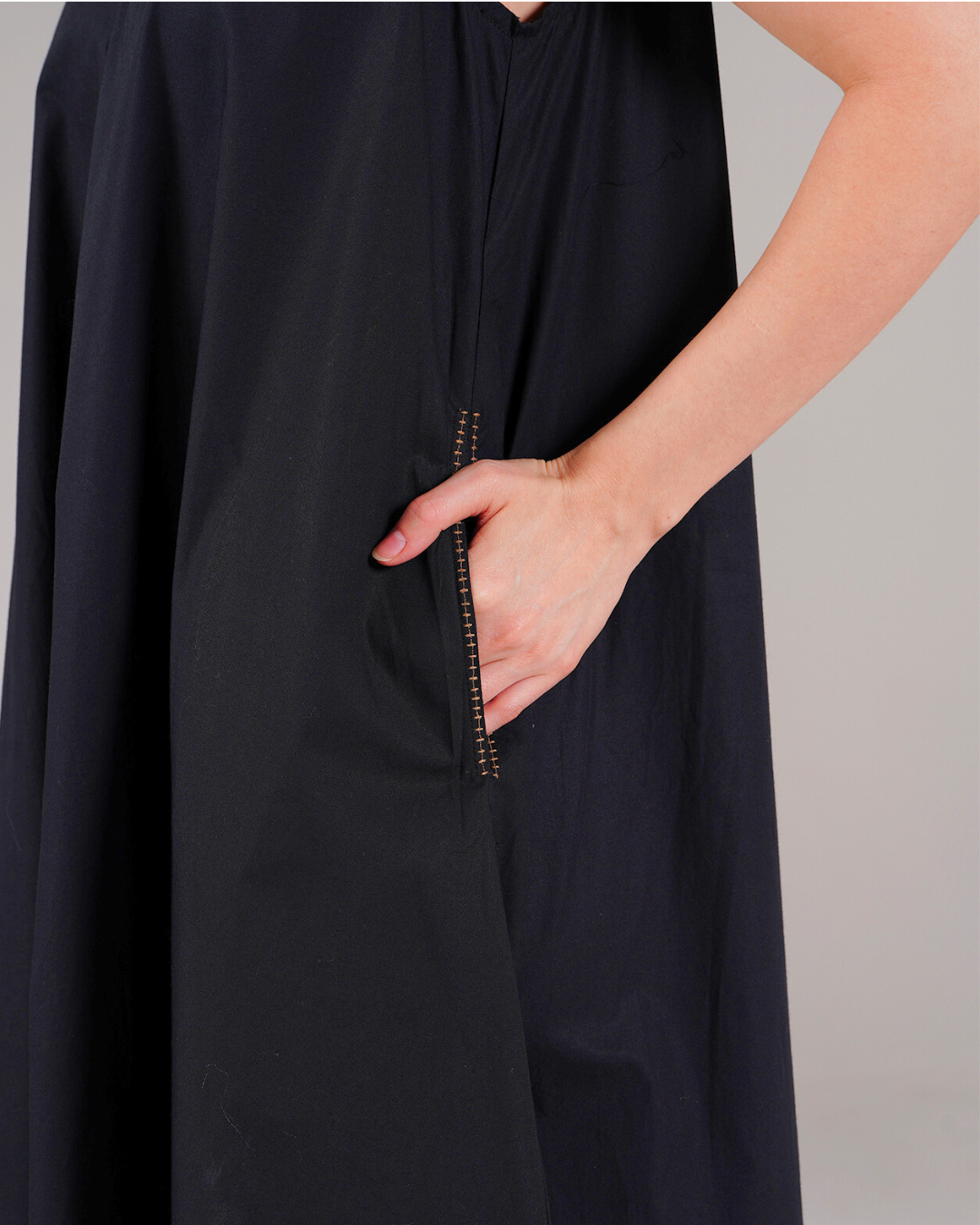 This sleeveless black dress features a fluid A-line silhouette that gently flows with the body, offering comfort without compromising structure. Thoughtful stitch detailing along the front and pockets adds a subtle handcrafted touch, while the deep V-neckline keeps the look refined and modern.