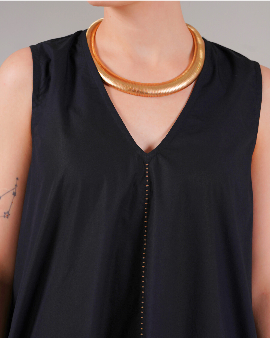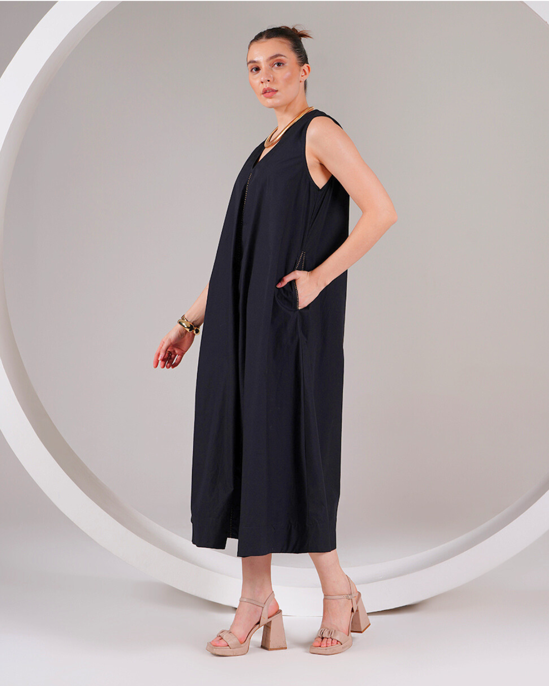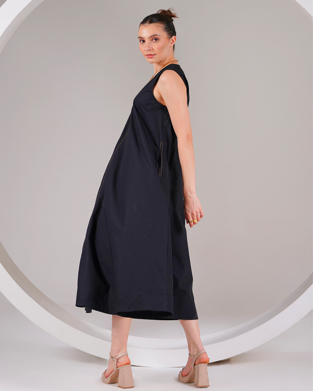 This sleeveless black dress features a fluid A-line silhouette that gently flows with the body, offering comfort without compromising structure. Thoughtful stitch detailing along the front and pockets adds a subtle handcrafted touch, while the deep V-neckline keeps the look refined and modern.
