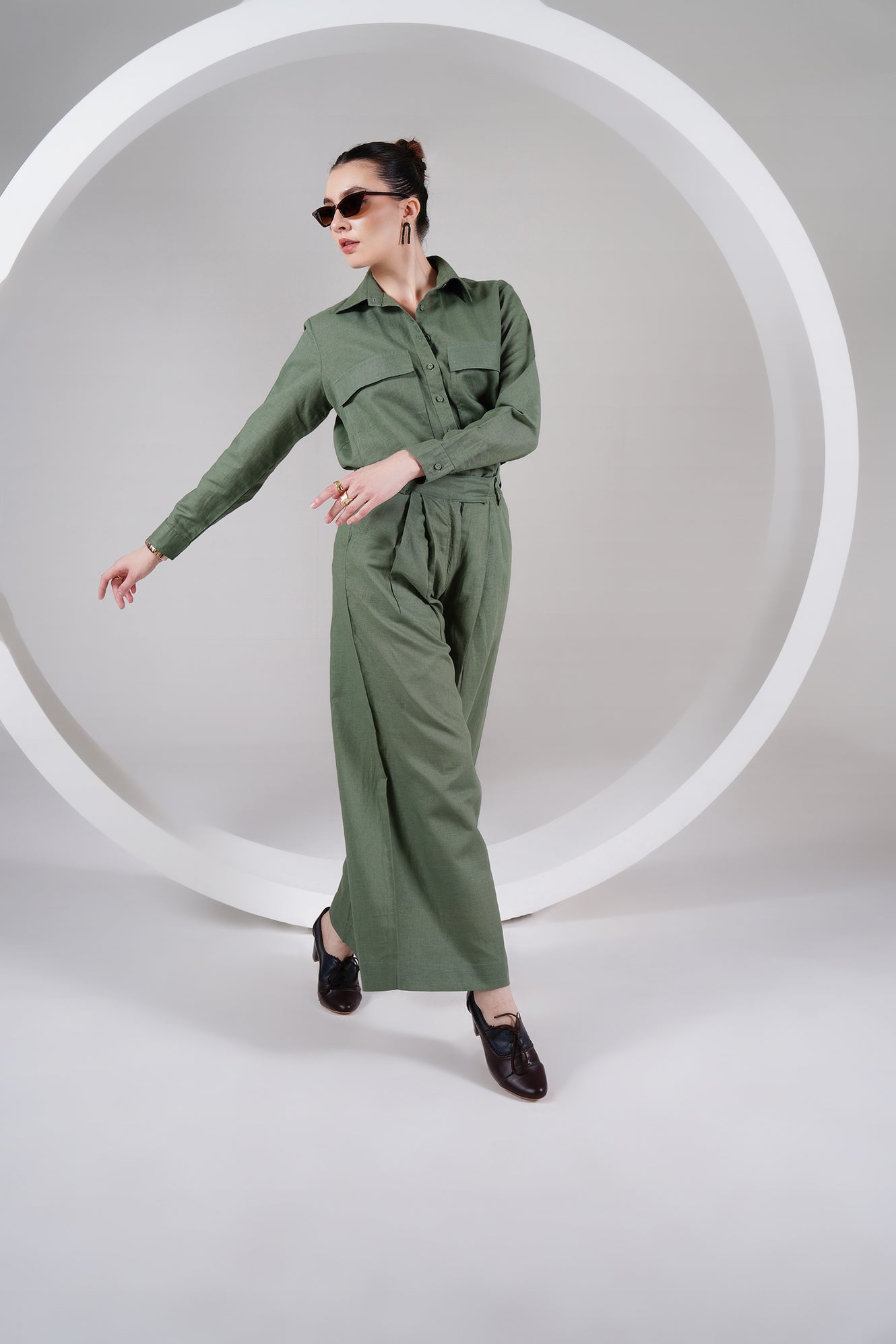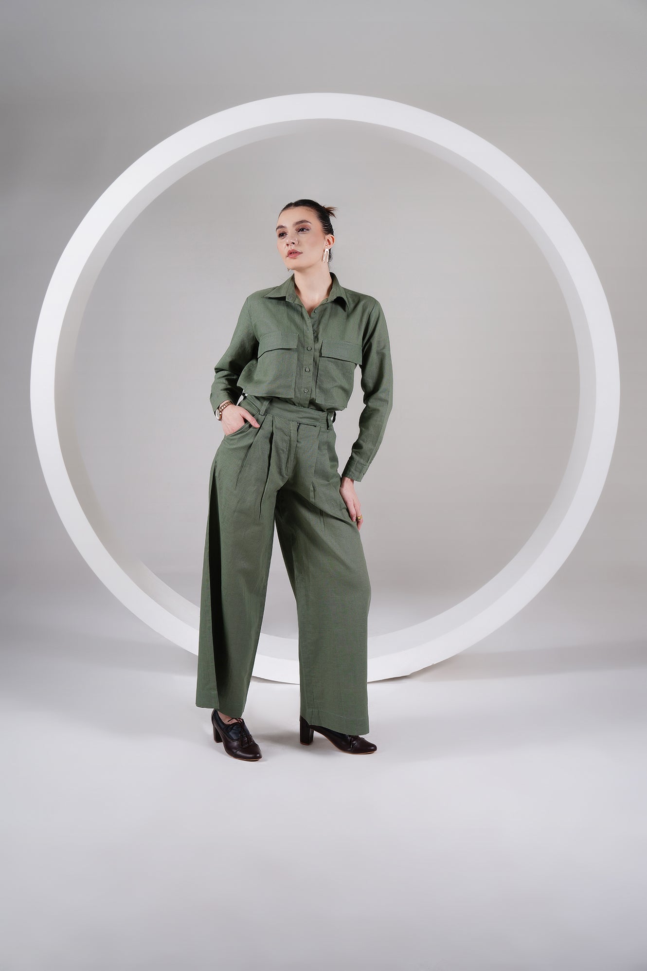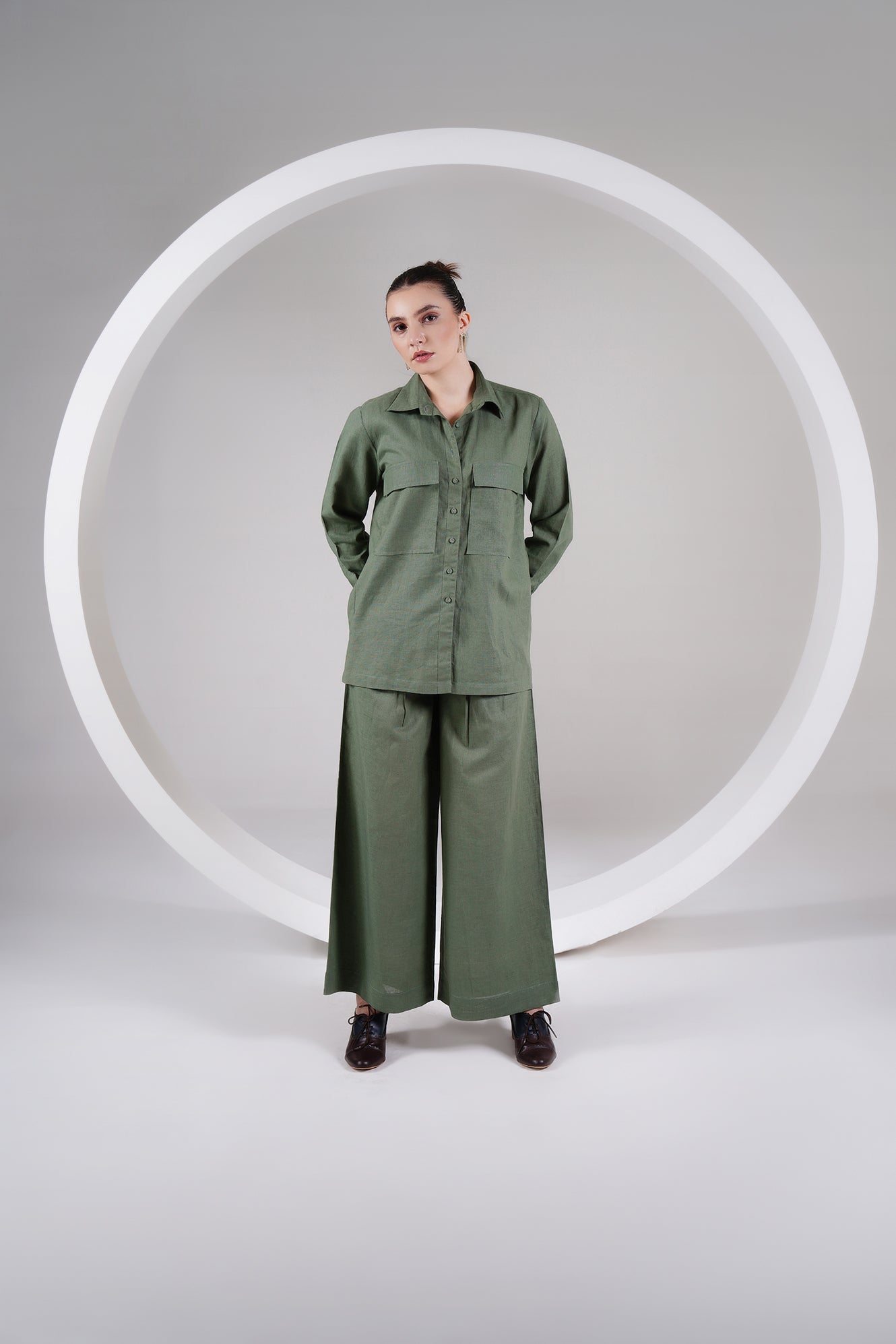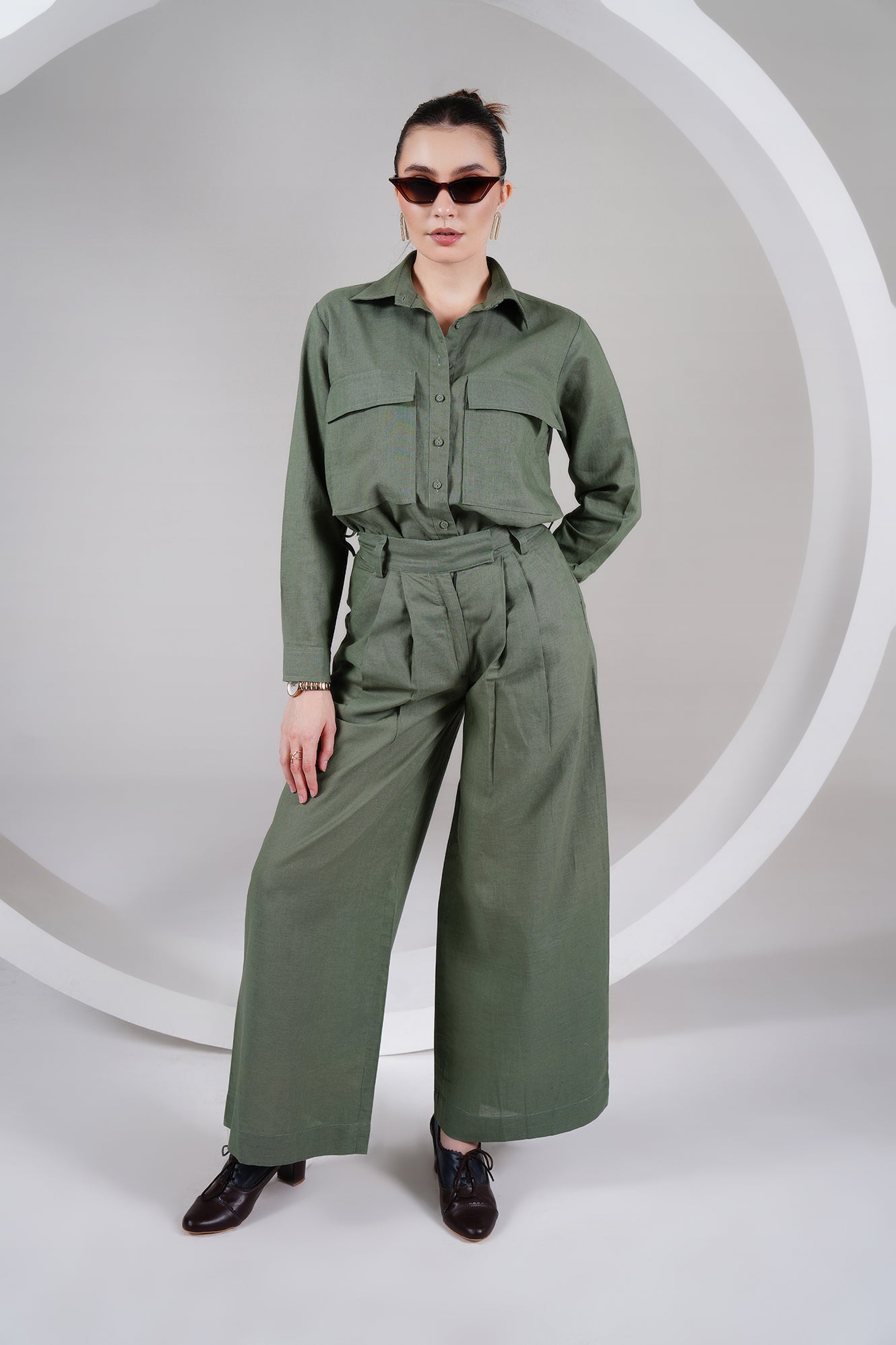 Effortless and refined, this olive green co-ord set features a structured utility shirt paired with relaxed wide-leg trousers. Crafted from a breathable cotton-linen blend, it offers a clean, minimal silhouette with all-day comfort. Perfect for work hours, travel days, or everyday elevated style.