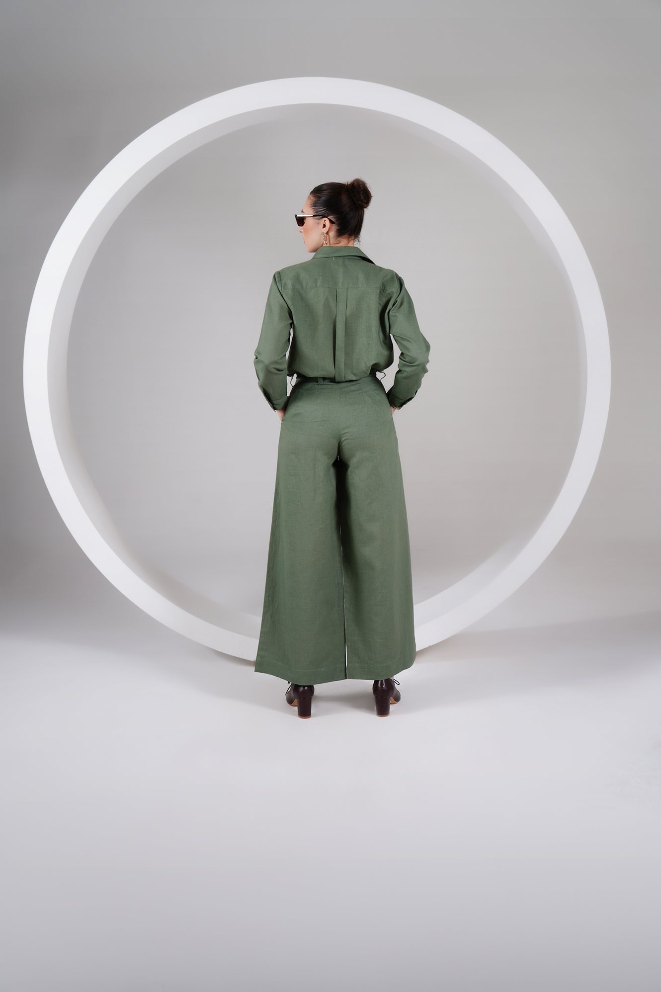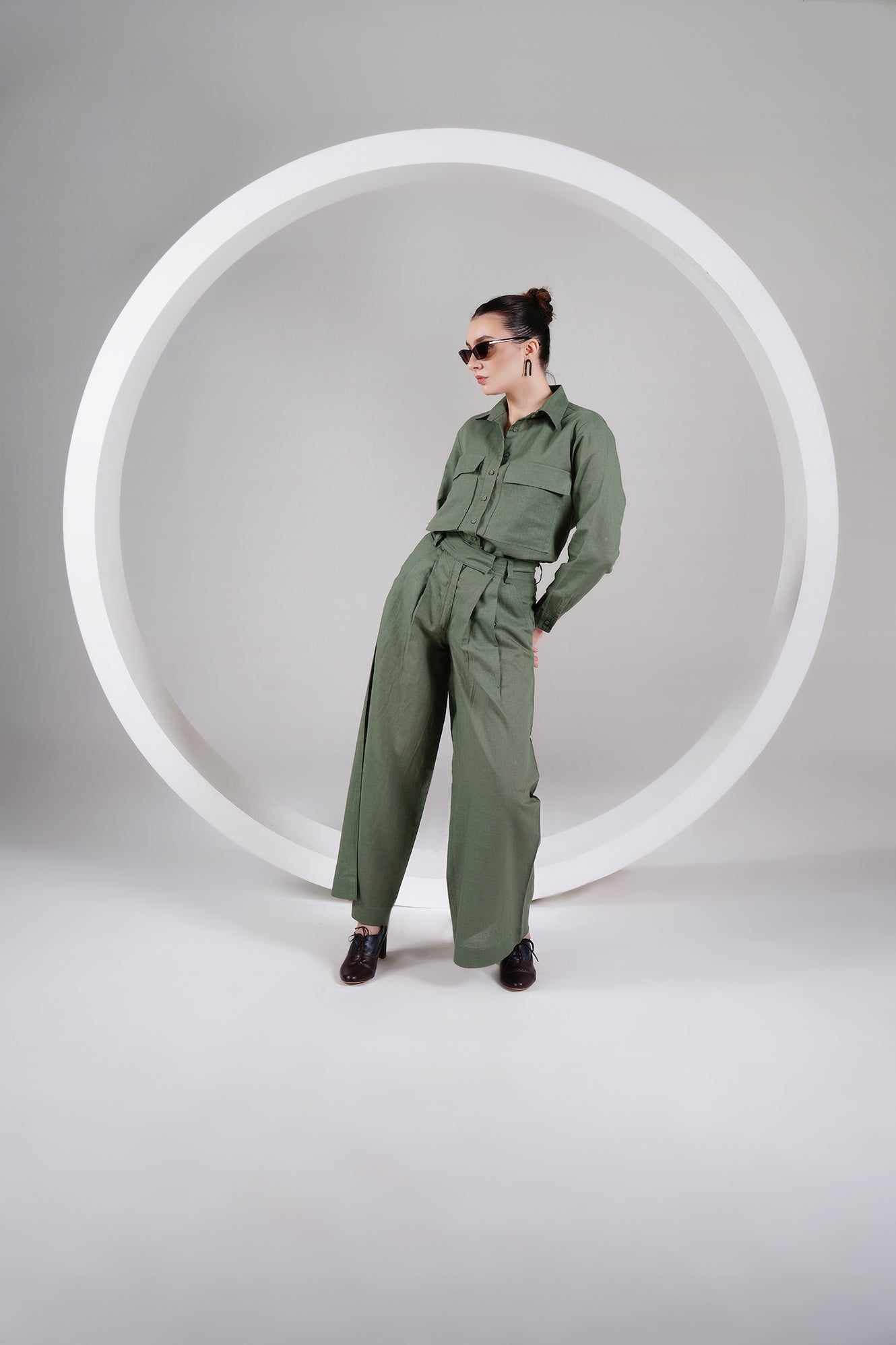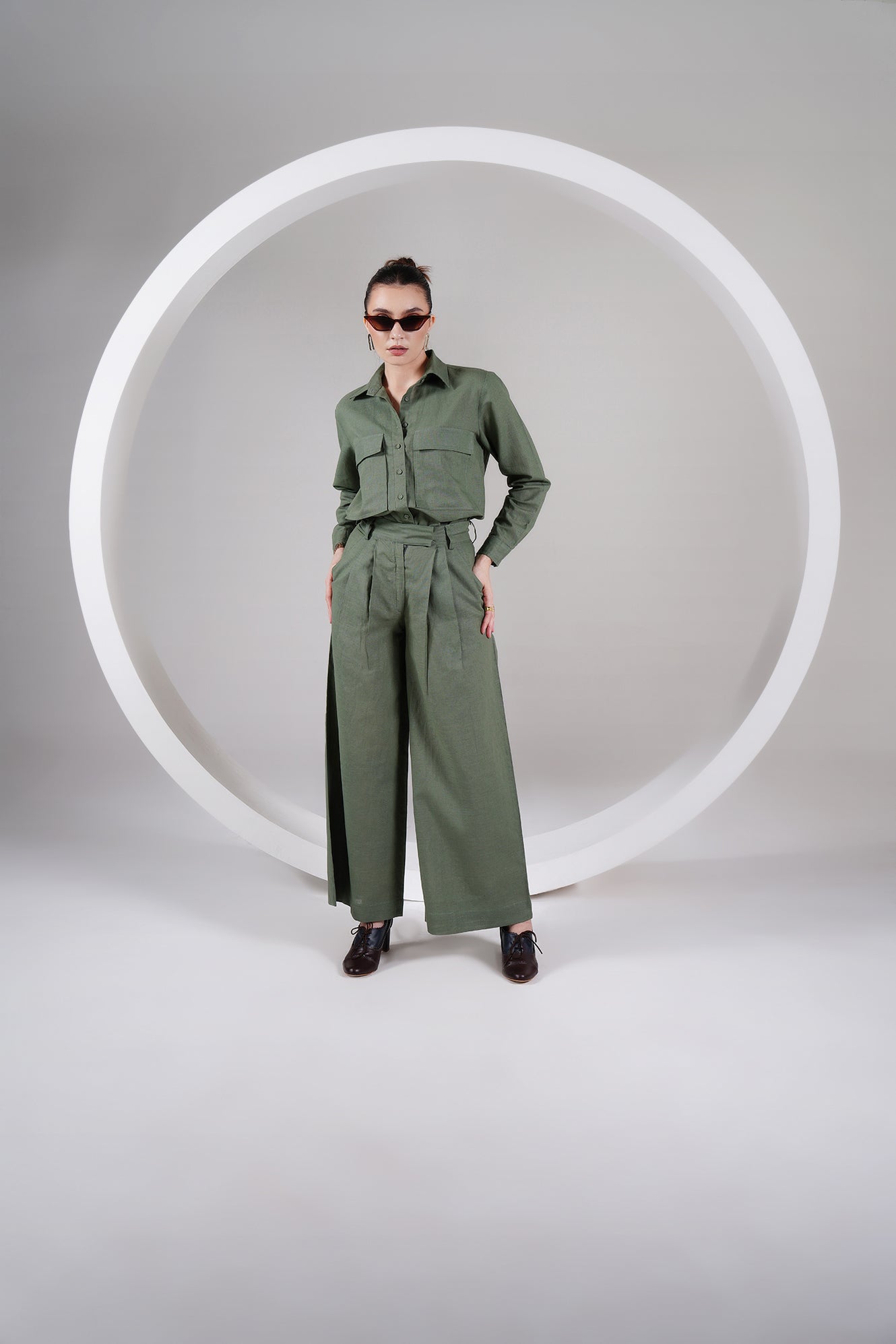 Effortless and refined, this olive green co-ord set features a structured utility shirt paired with relaxed wide-leg trousers. Crafted from a breathable cotton-linen blend, it offers a clean, minimal silhouette with all-day comfort. Perfect for work hours, travel days, or everyday elevated style.