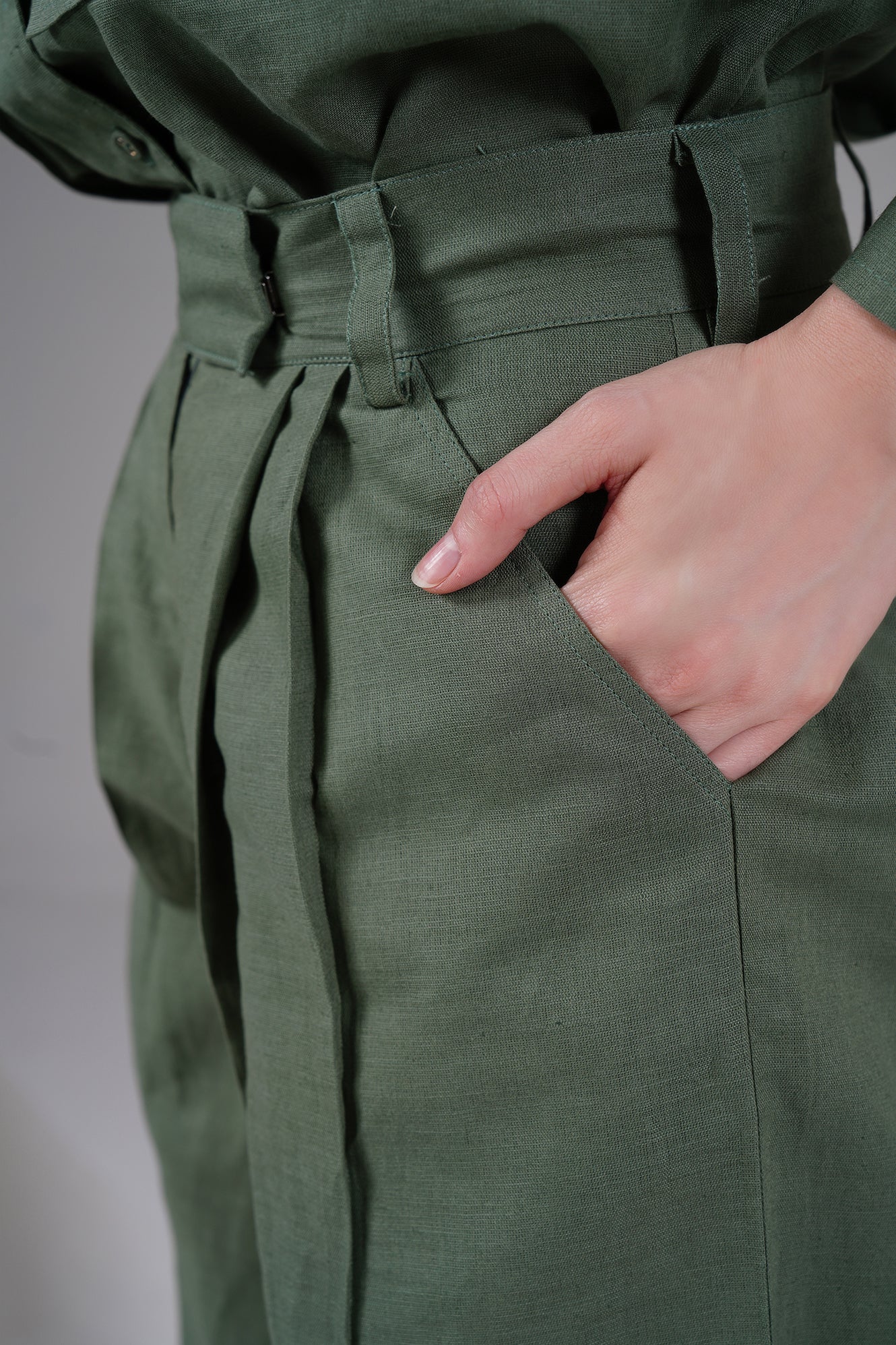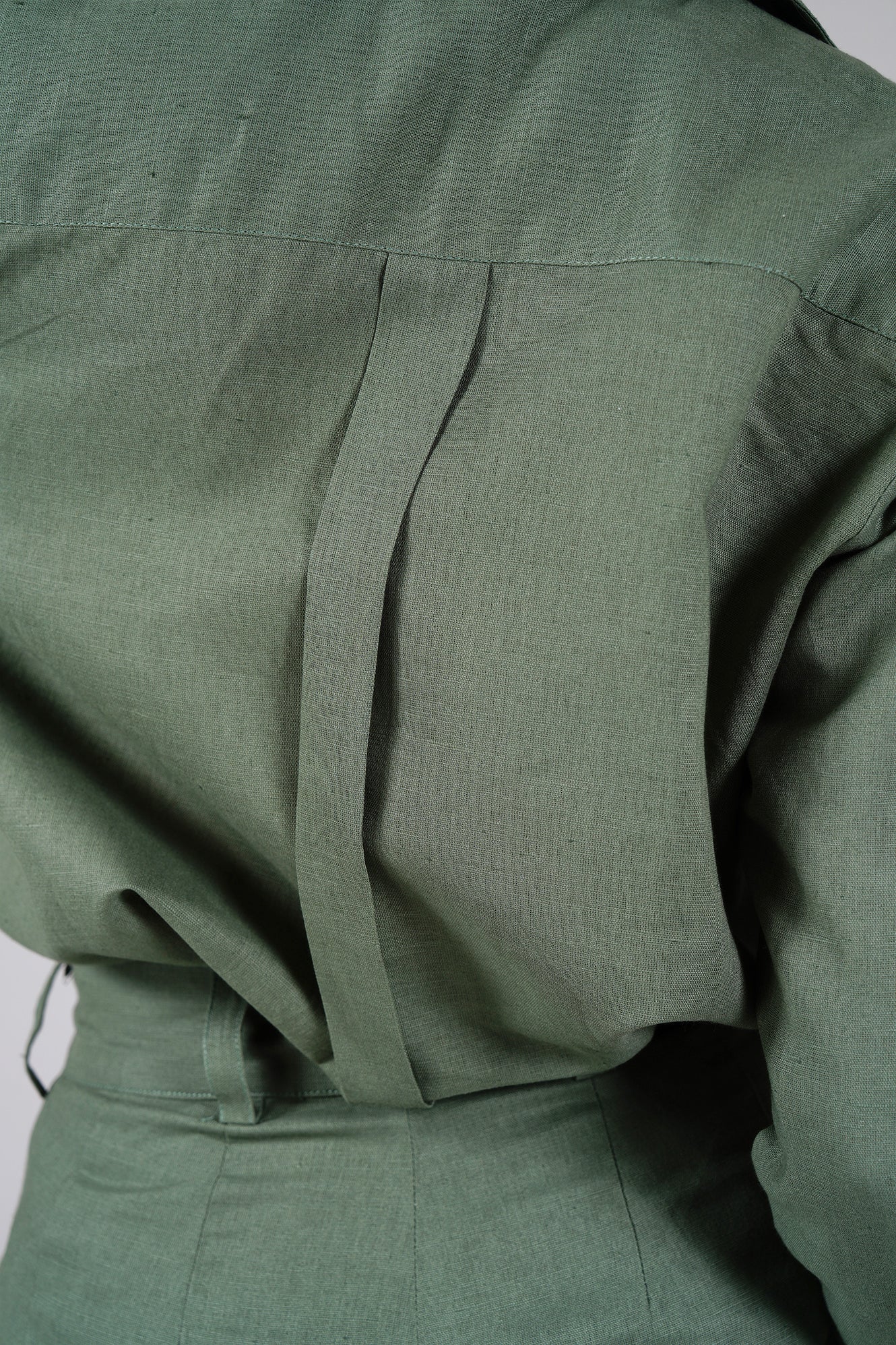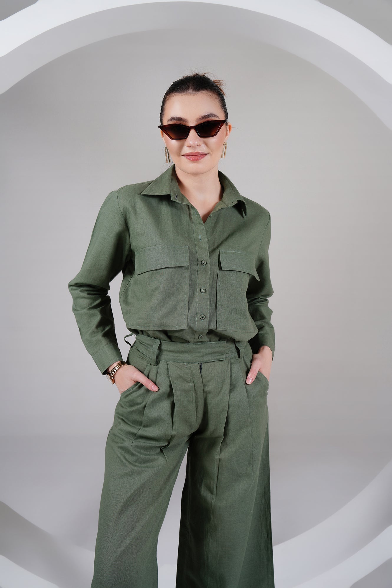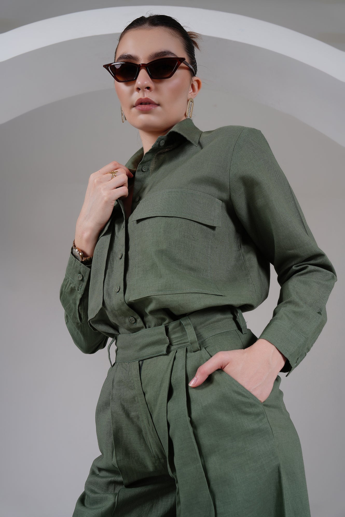 Effortless and refined, this olive green co-ord set features a structured utility shirt paired with relaxed wide-leg trousers. Crafted from a breathable cotton-linen blend, it offers a clean, minimal silhouette with all-day comfort. Perfect for work hours, travel days, or everyday elevated style.