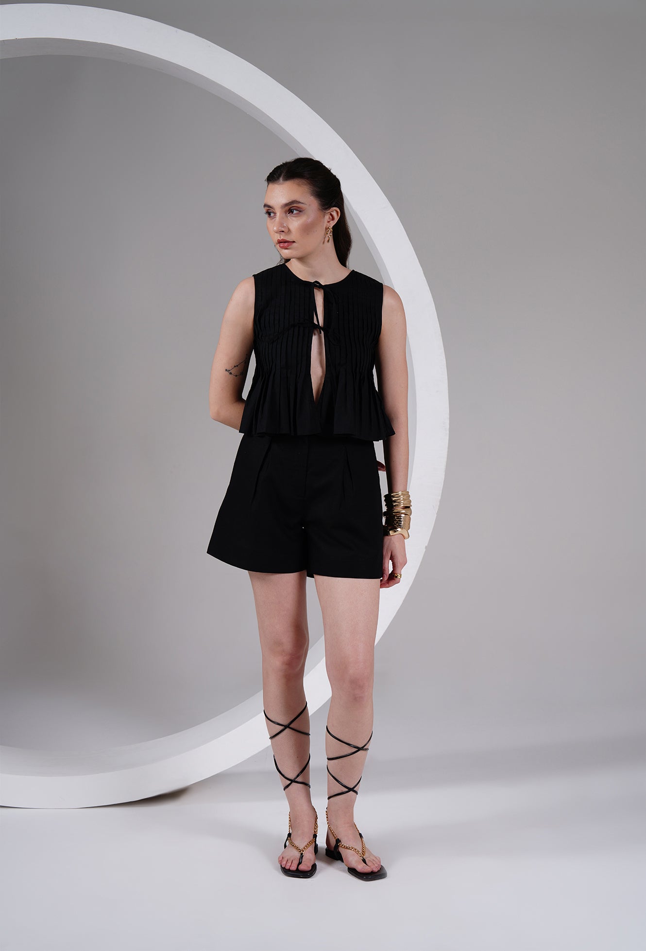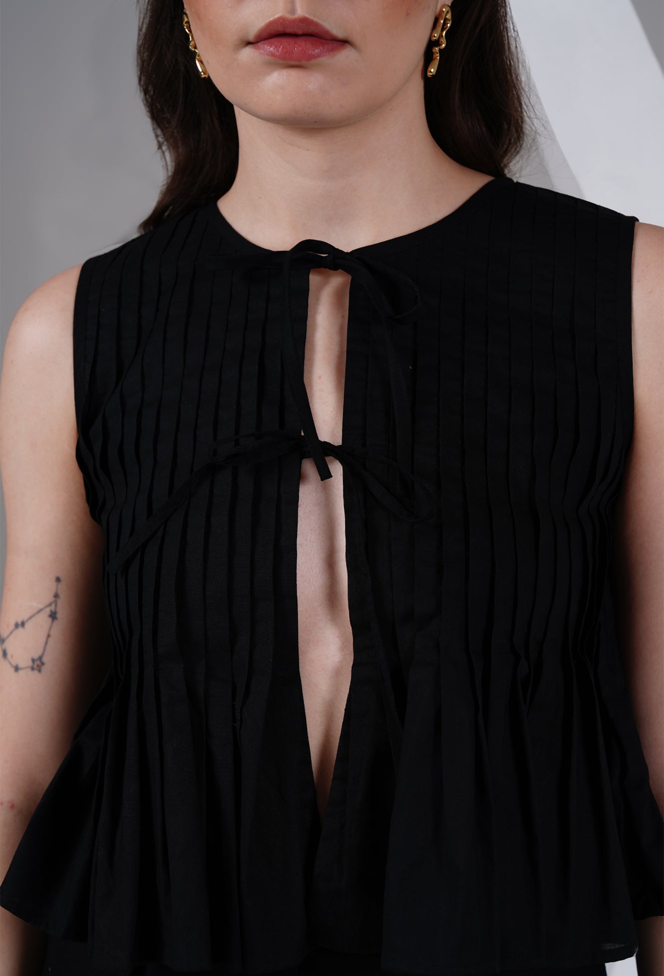 Pleated Tie-Front Black Top