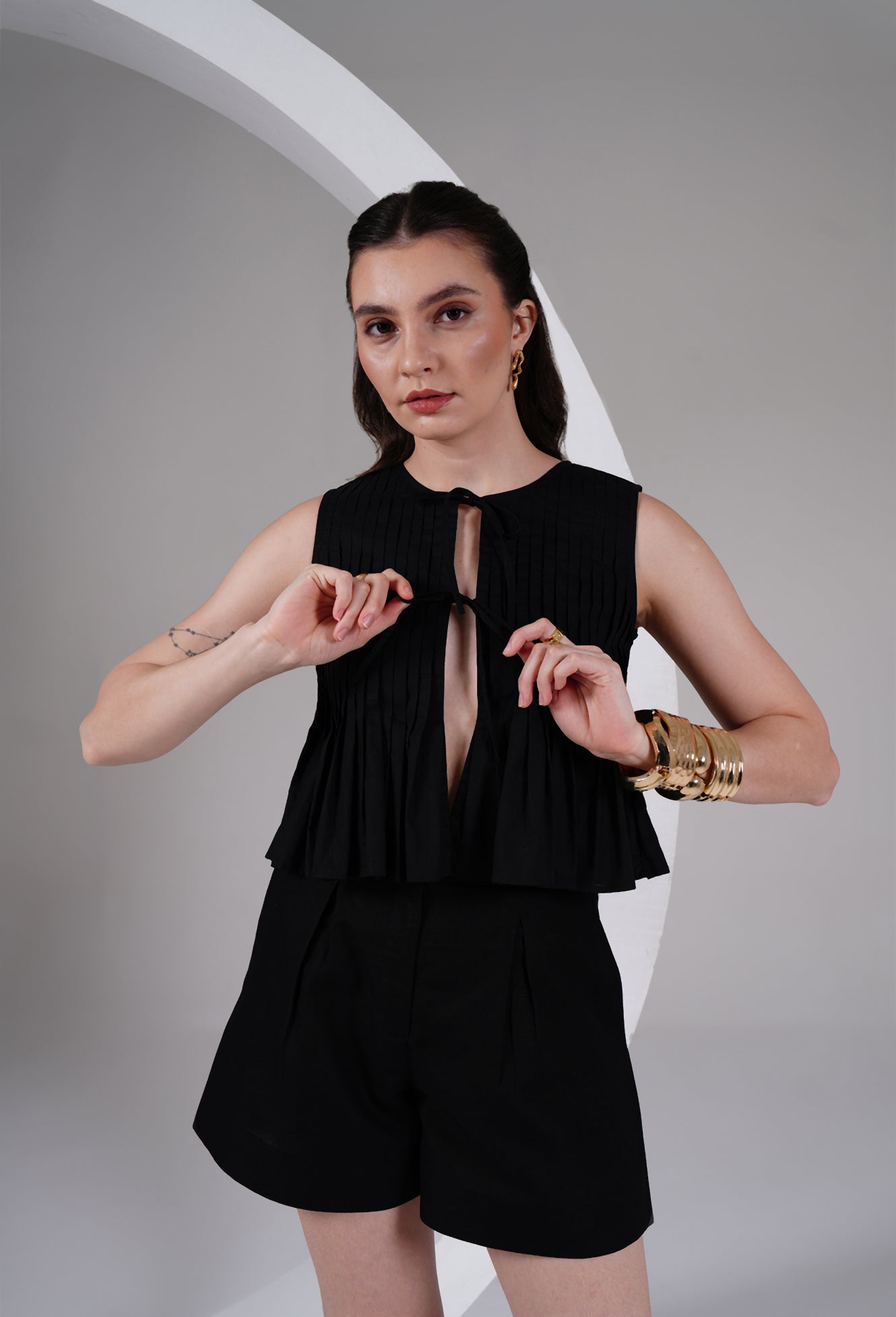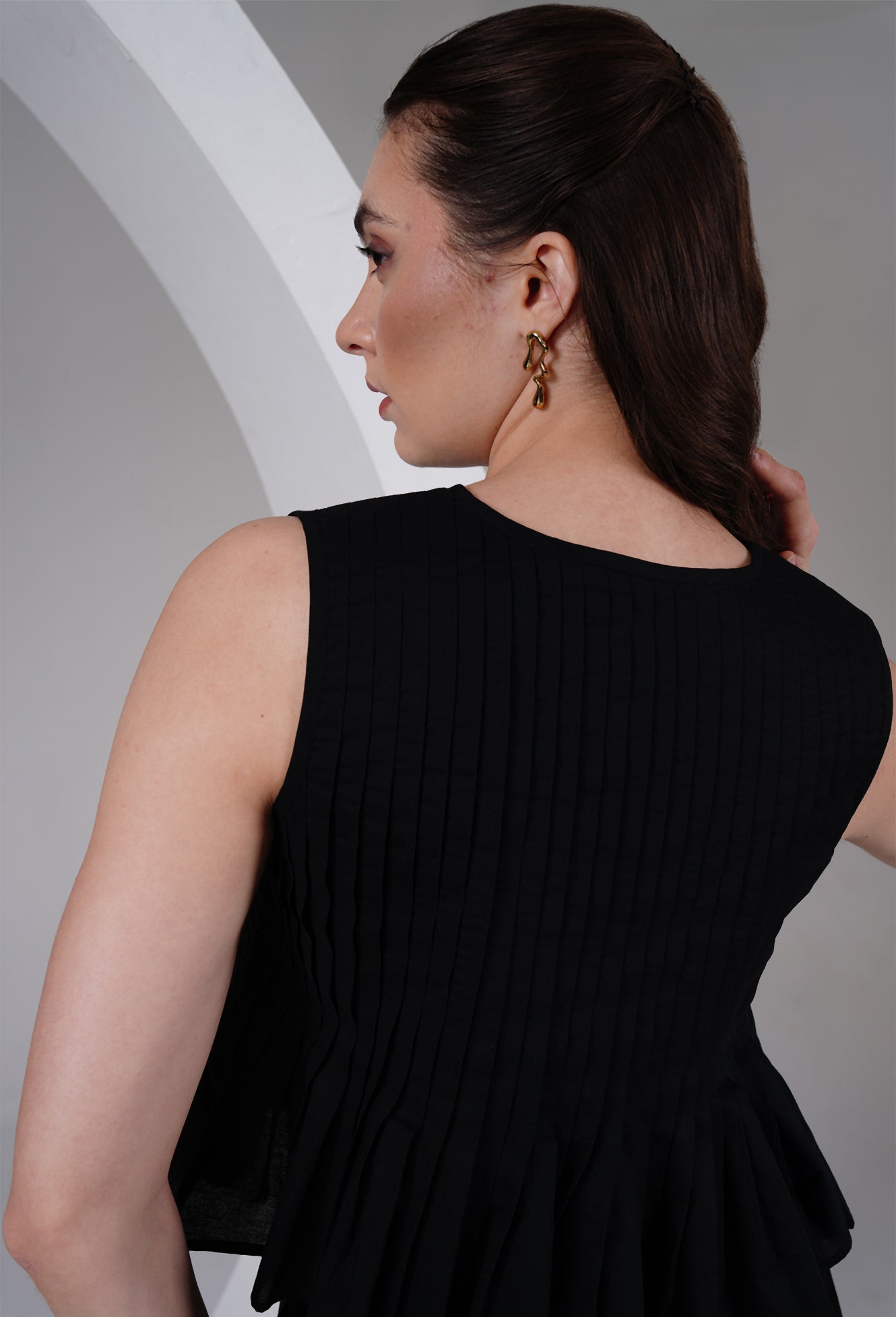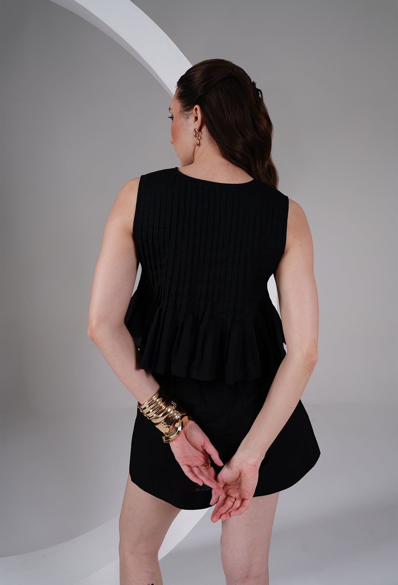 Effortless, minimal, and quietly bold — this sleeveless black top is crafted for days when you want comfort with a touch of drama. Designed with fine vertical pleats and a soft flared hem, the silhouette feels light, breathable, and elevated.