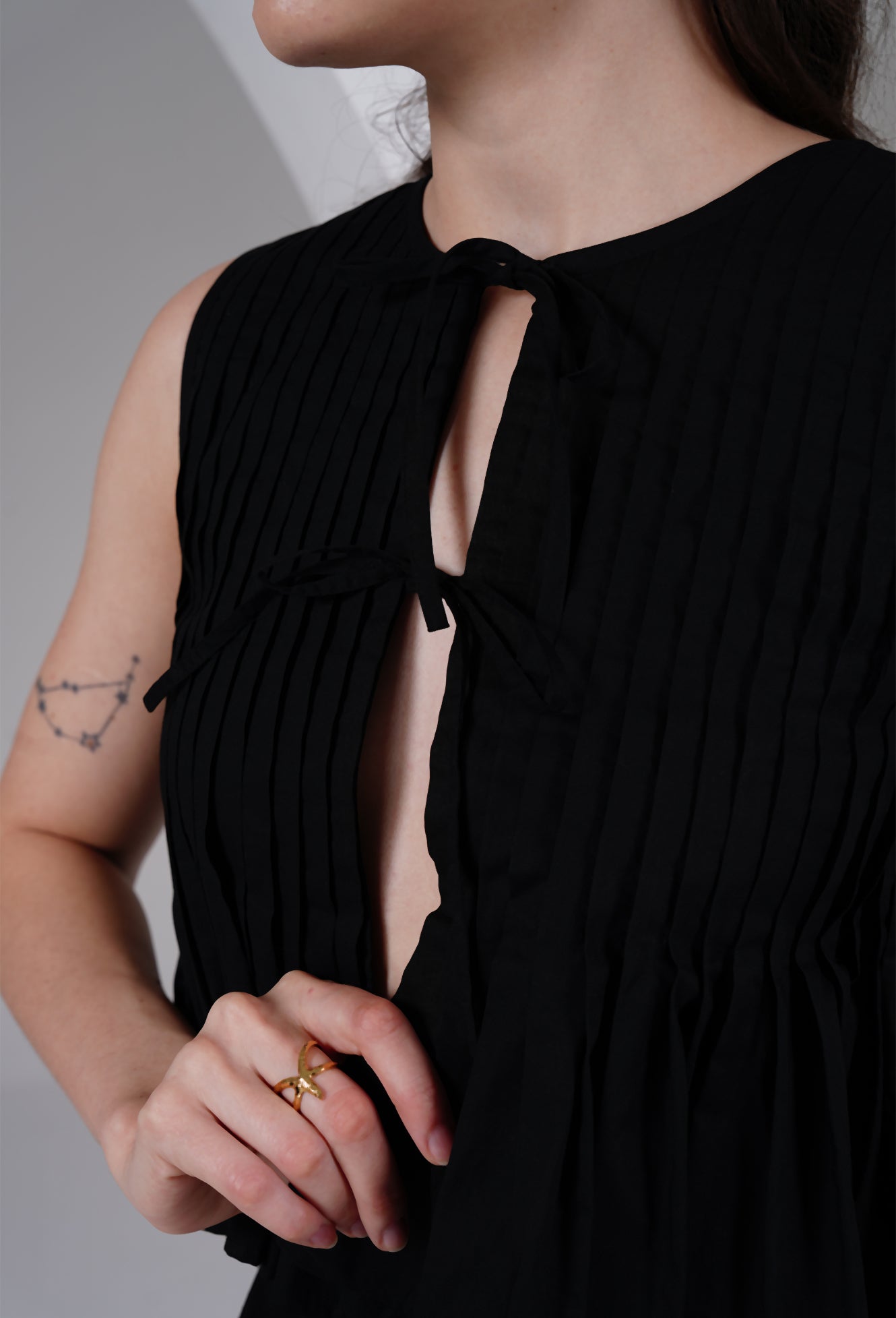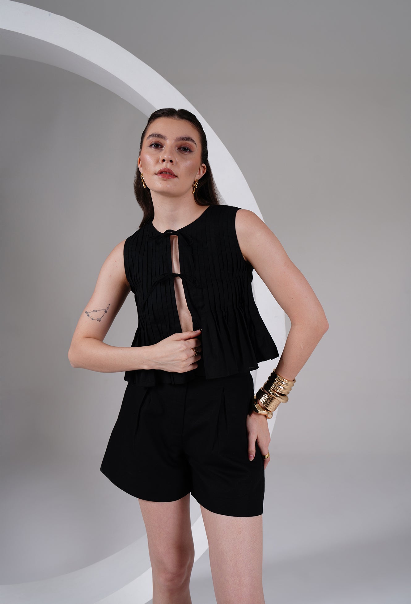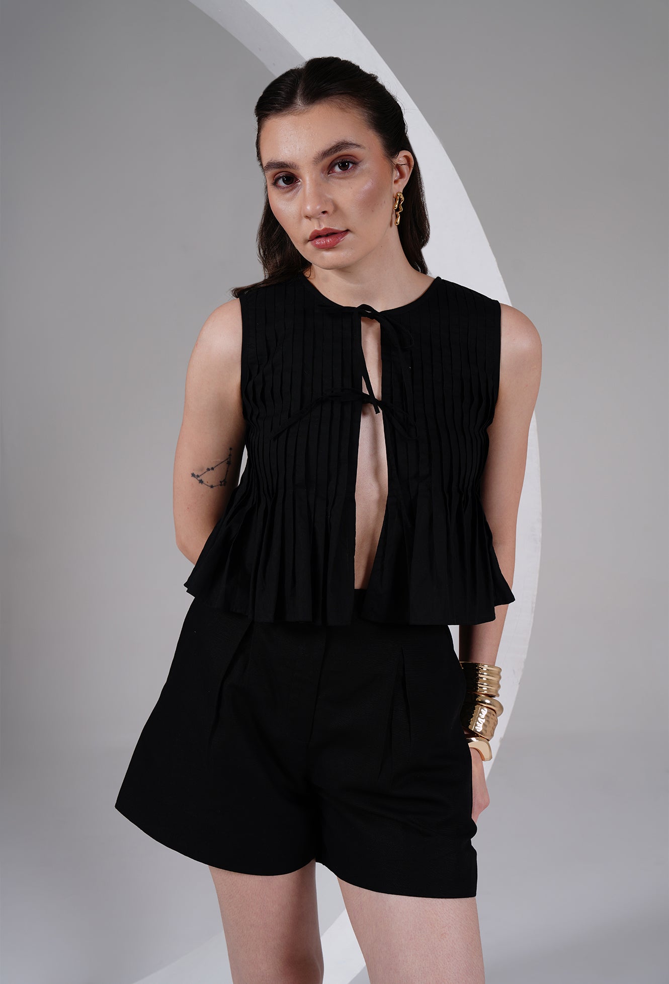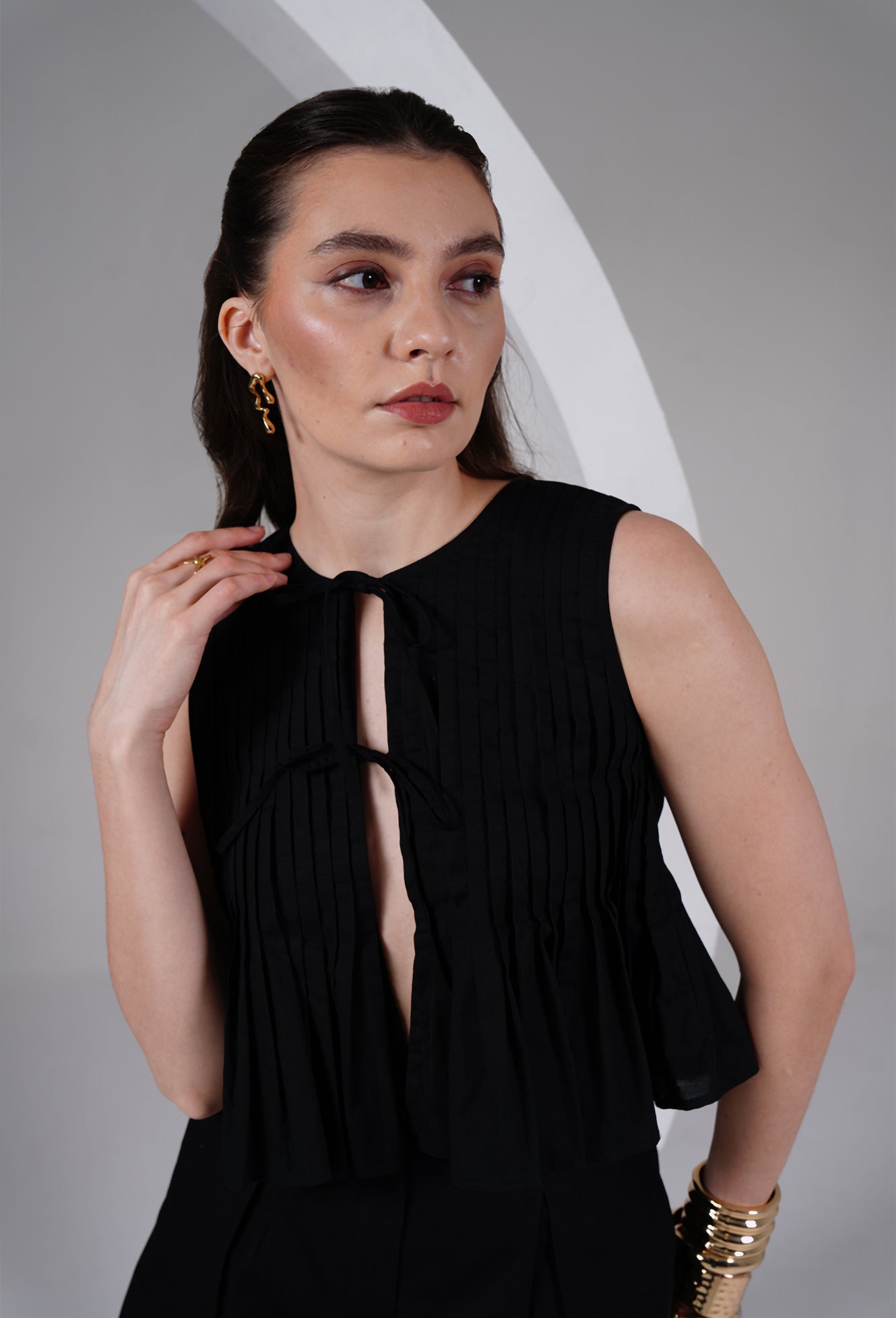 Effortless, minimal, and quietly bold — this sleeveless black top is crafted for days when you want comfort with a touch of drama. Designed with fine vertical pleats and a soft flared hem, the silhouette feels light, breathable, and elevated.