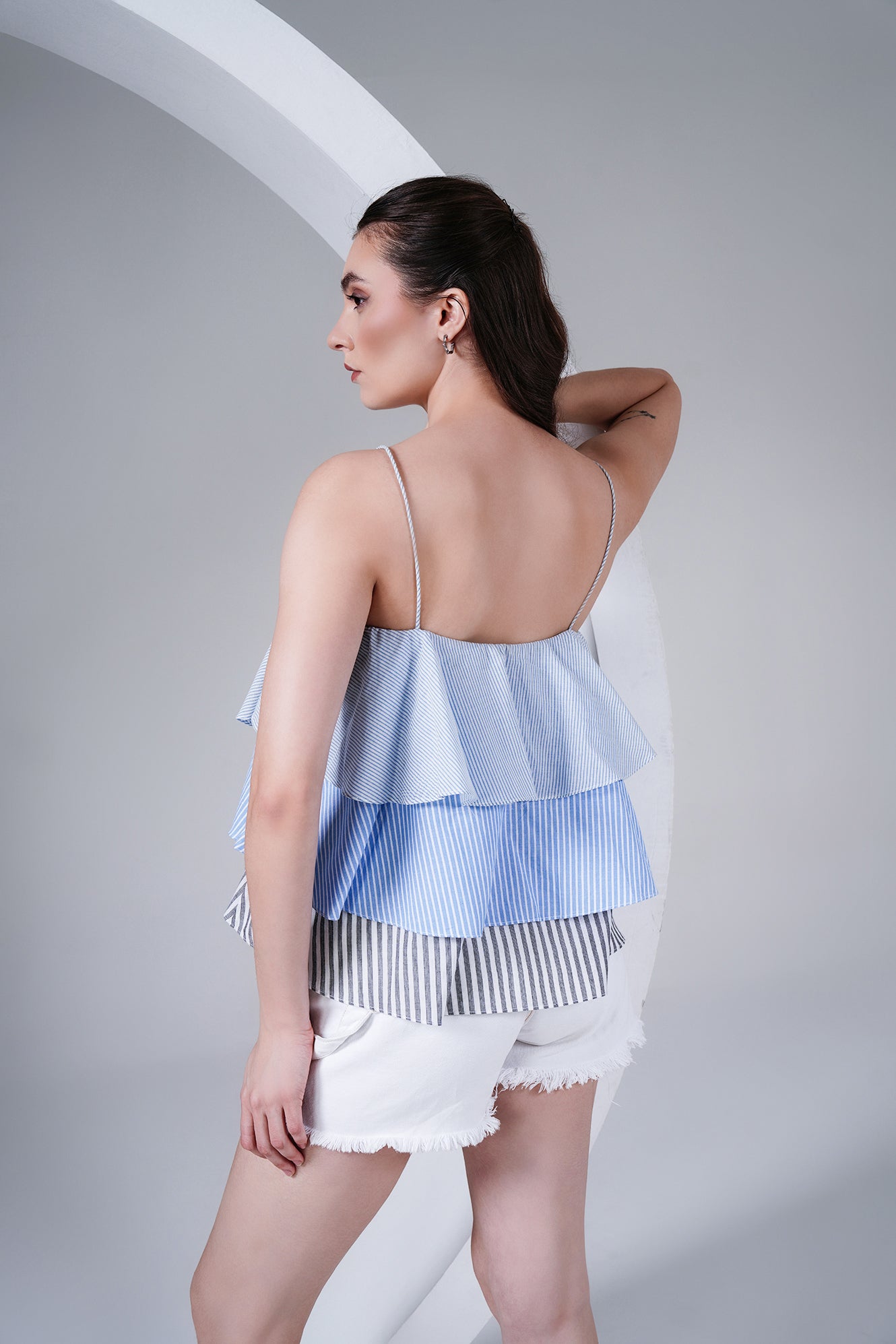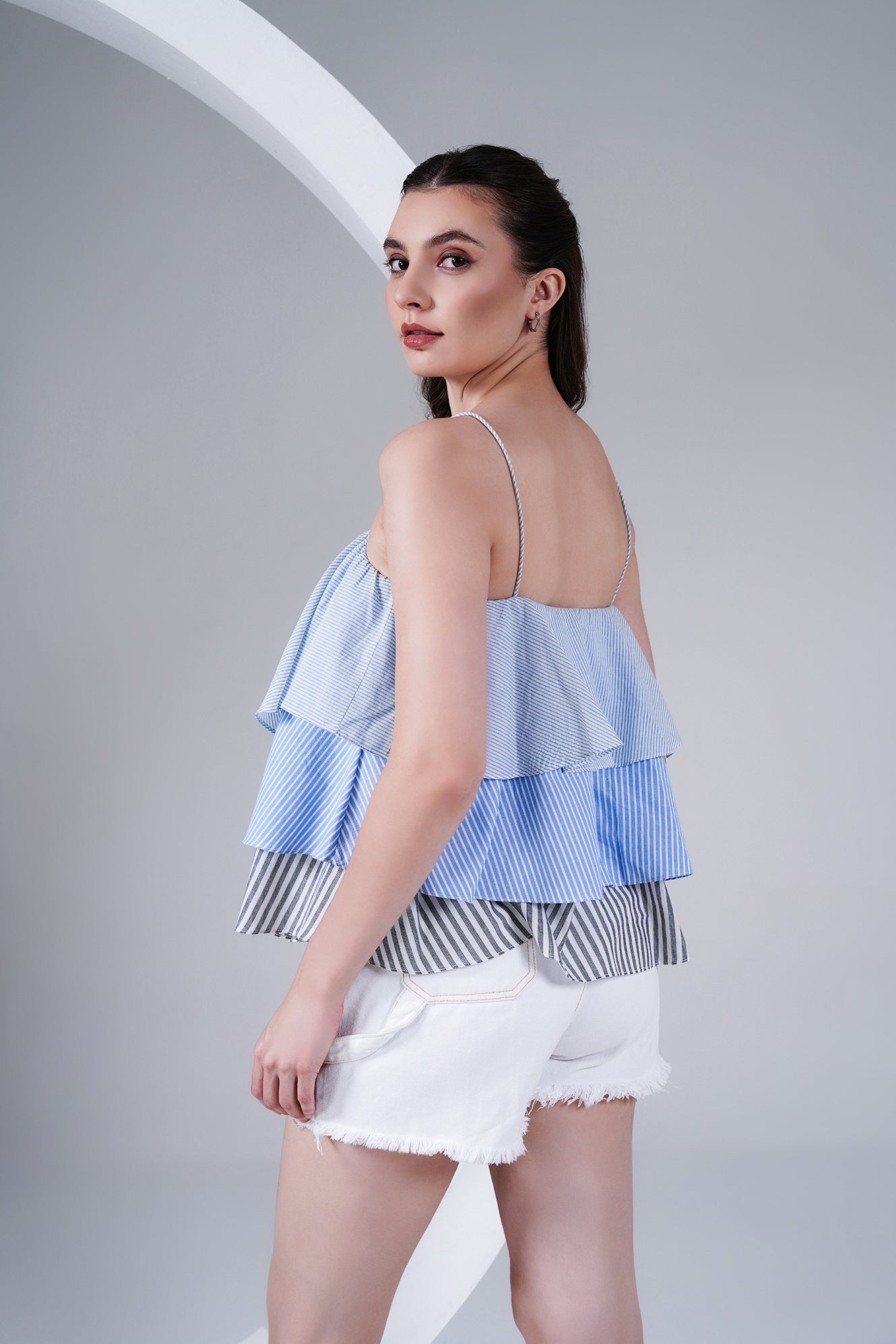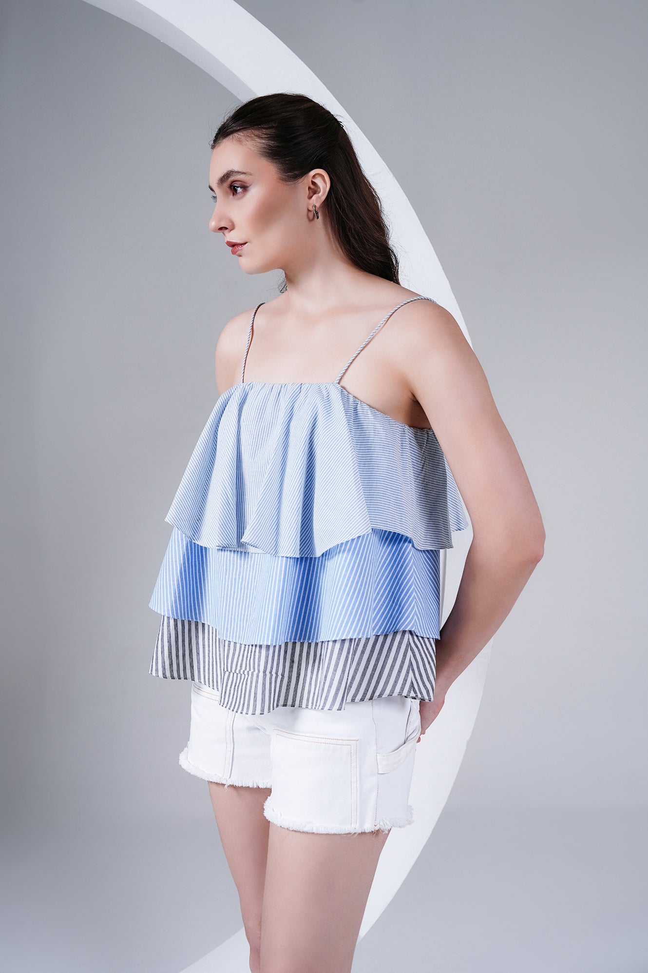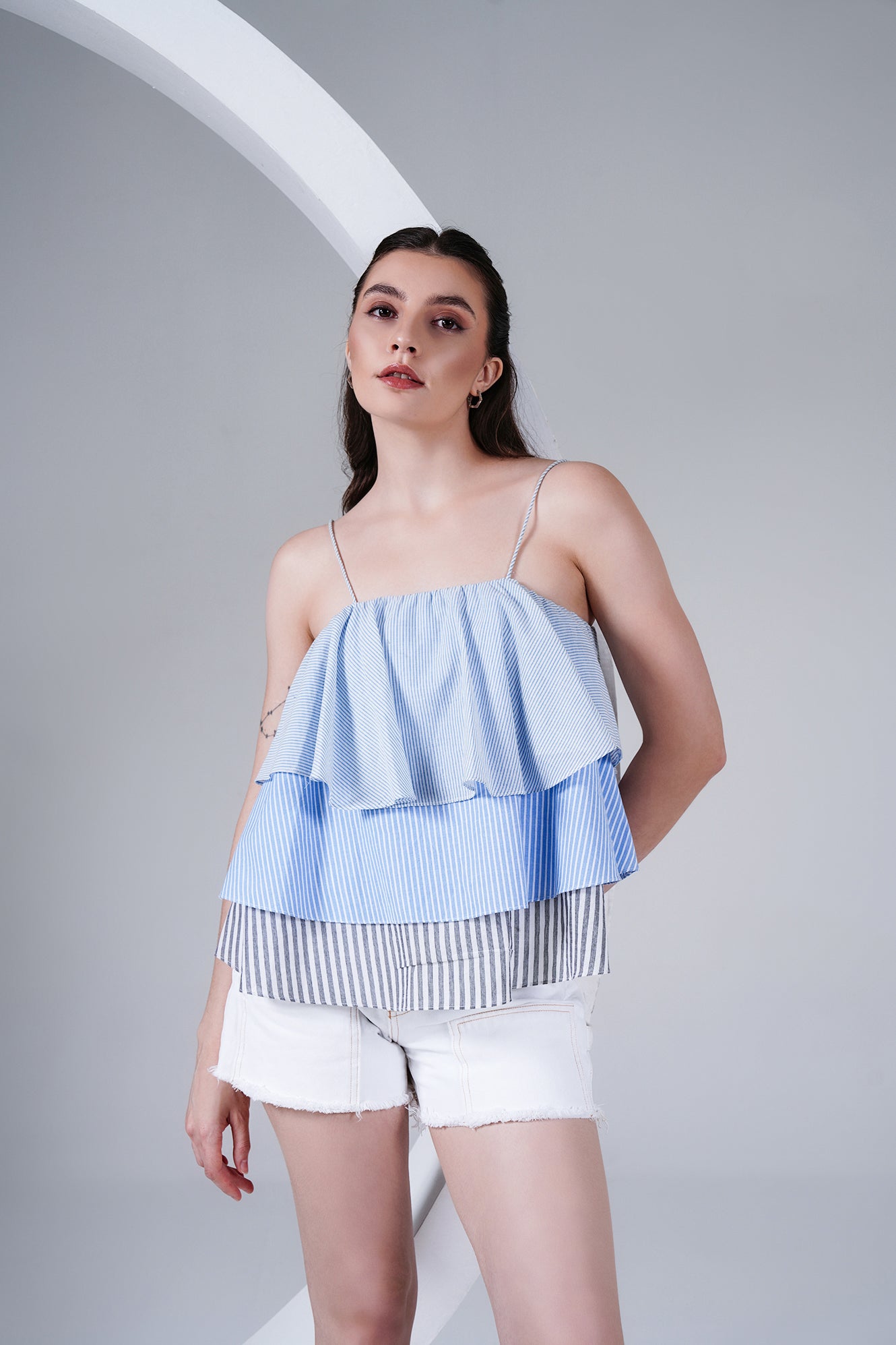 Fresh, breezy, and playful — this layered striped cotton poplin camisole is designed to make summer dressing effortless. Featuring thin rope-style straps and tiered panels in shades of blue and grey stripes, it brings a fun, flowy silhouette that’s both comfortable and chic.