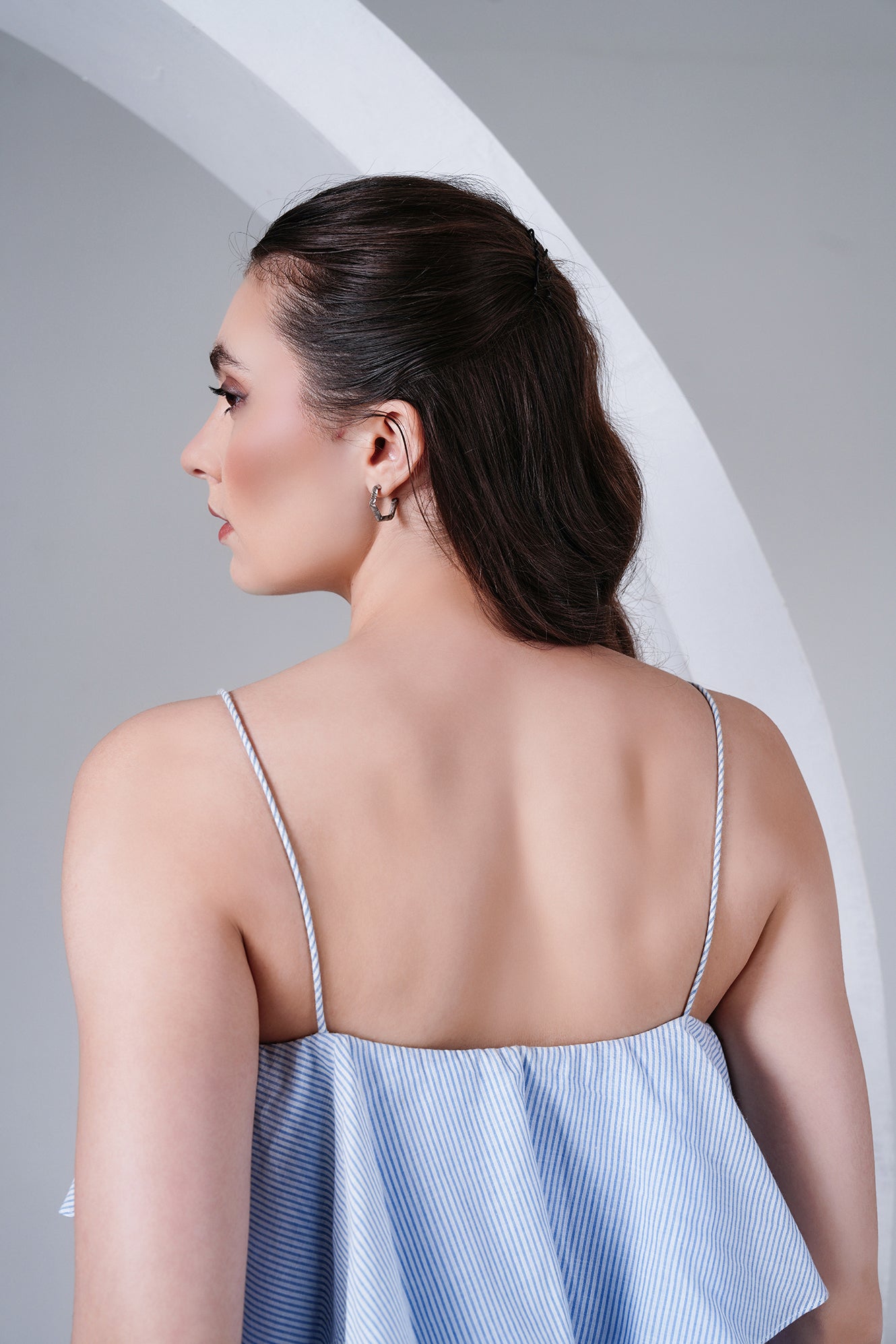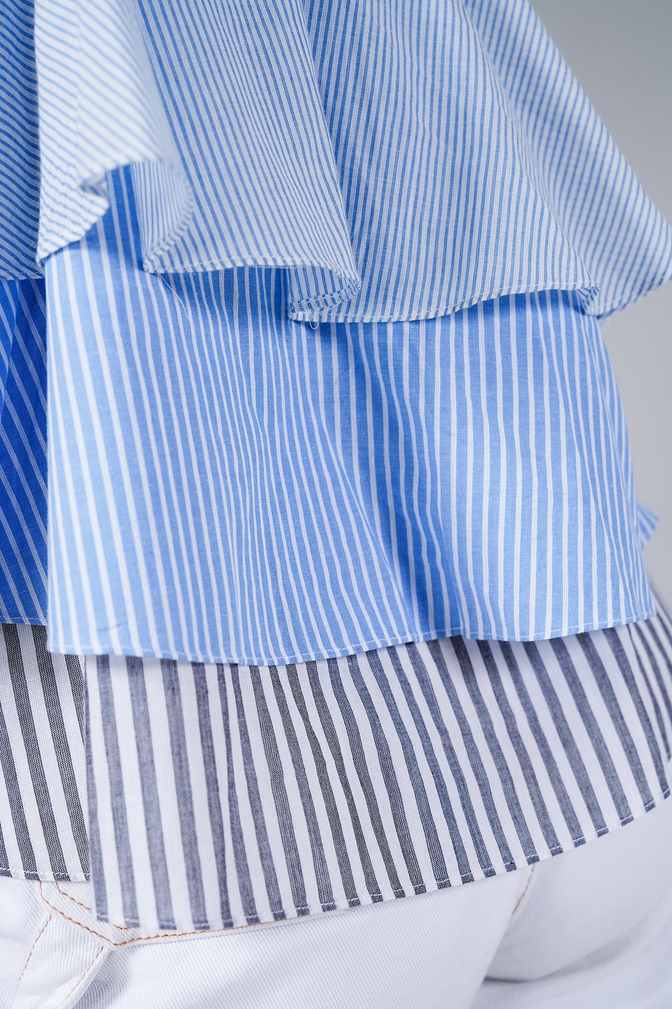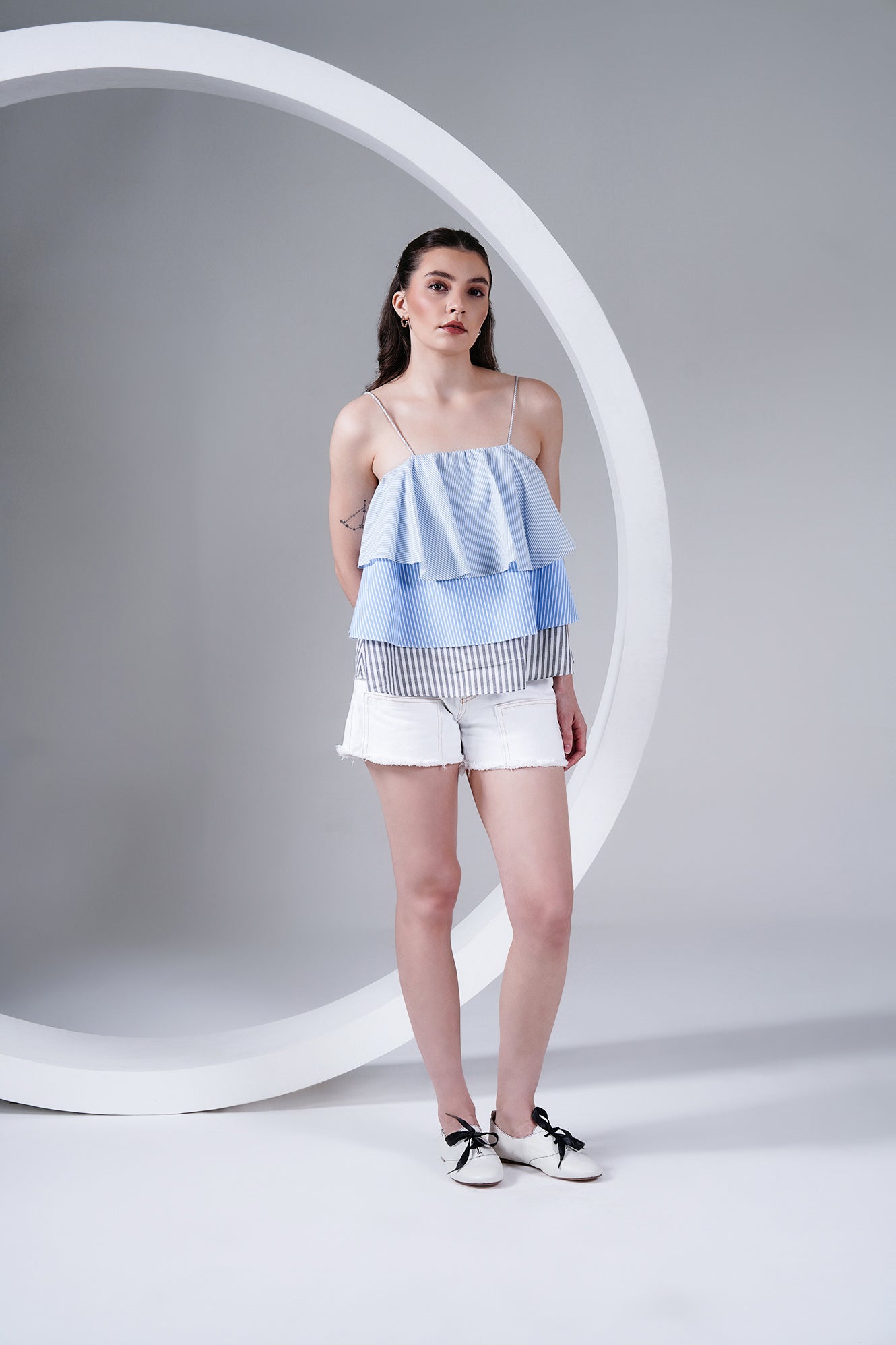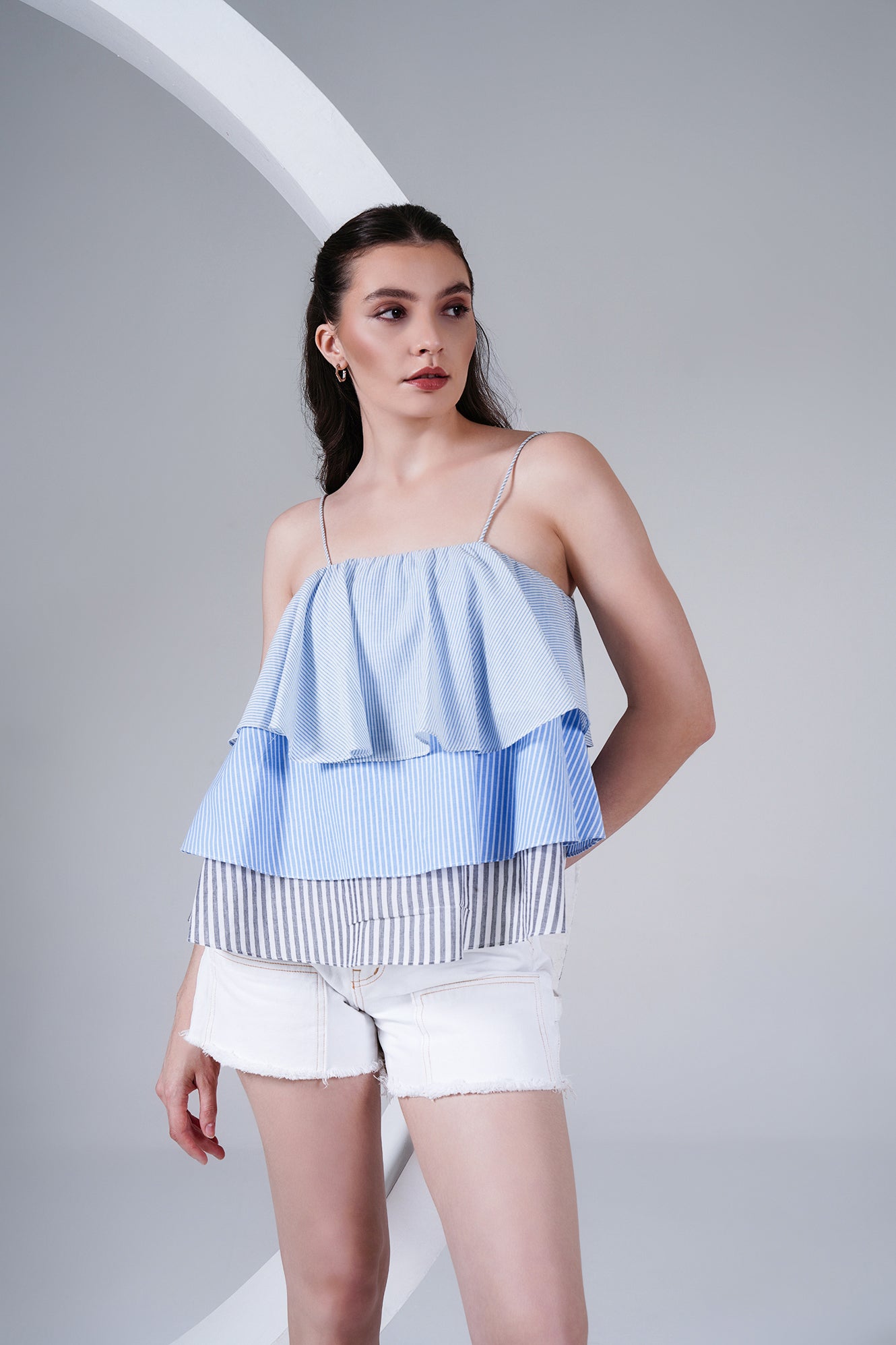Fresh, breezy, and playful — this layered striped cotton poplin camisole is designed to make summer dressing effortless. Featuring thin rope-style straps and tiered panels in shades of blue and grey stripes, it brings a fun, flowy silhouette that’s both comfortable and chic.
