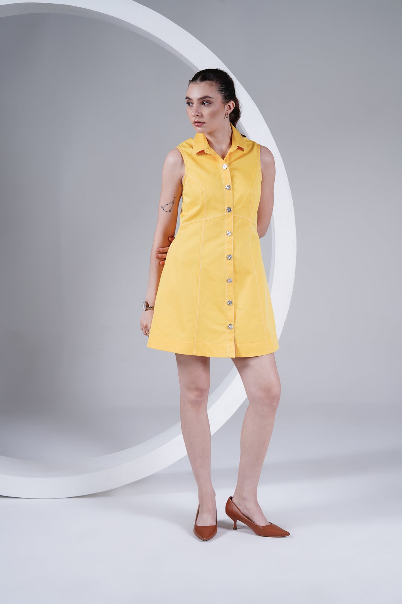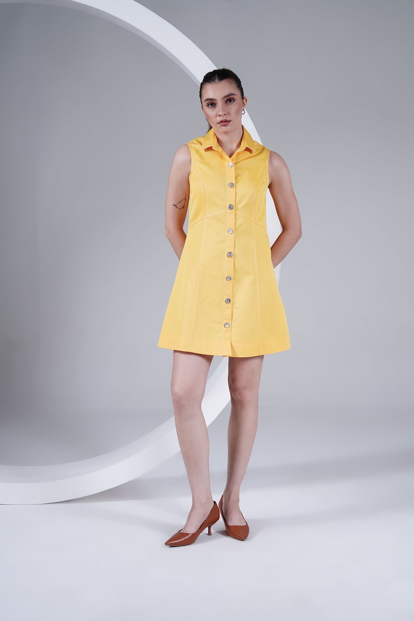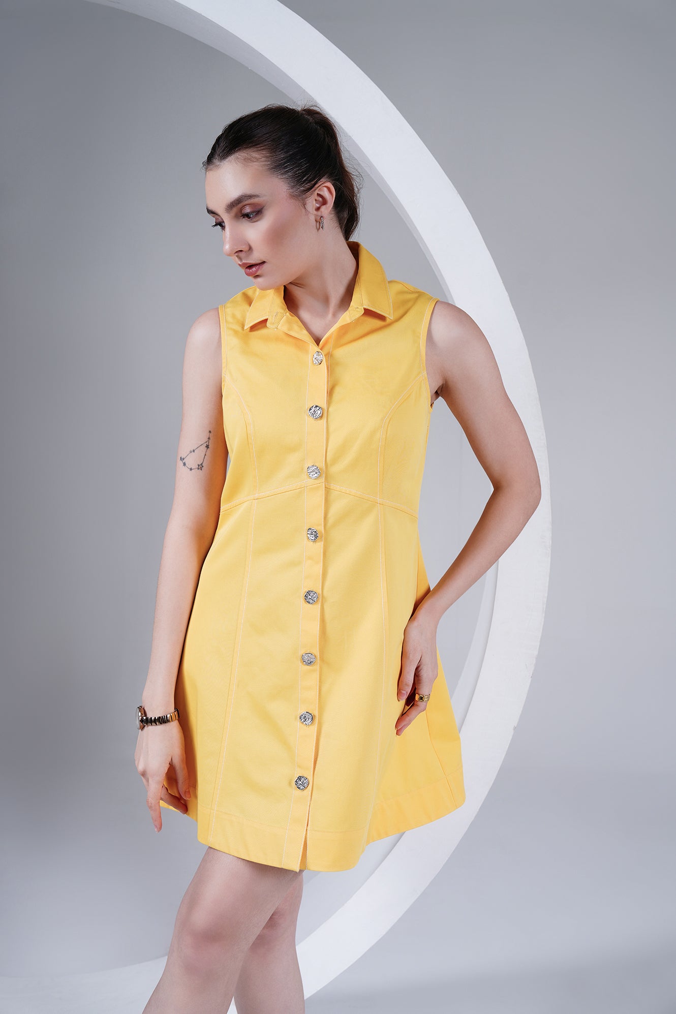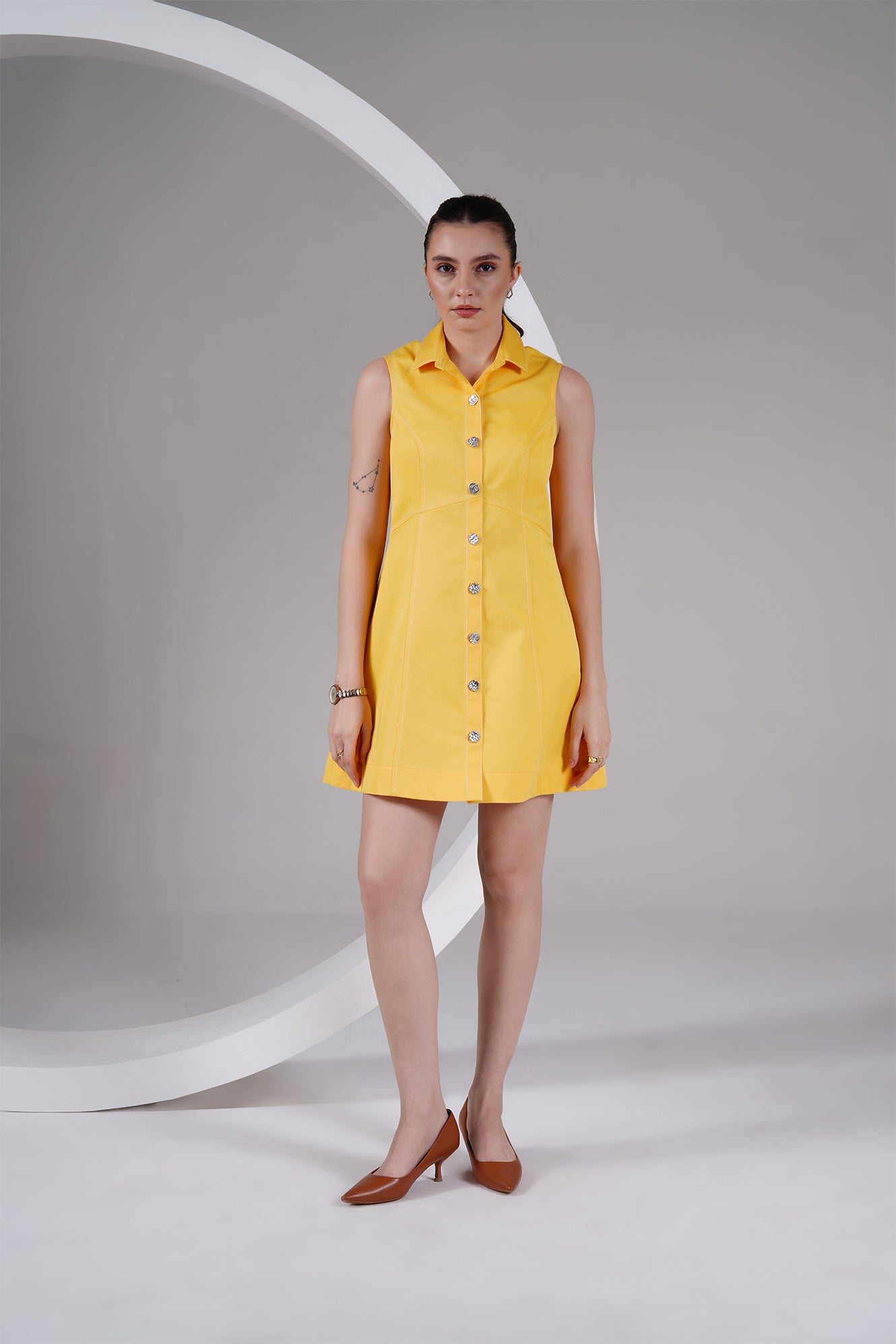 Brighten up your wardrobe with this sleeveless yellow dress, crafted in a structured cotton blend for comfort and style. Featuring a sharp shirt collar, front button-down closure with statement buttons, and panel detailing for a flattering silhouette, this dress is a perfect mix of playful and chic. Its mini length makes it a go-to for warm days, casual outings, or dressed-up evenings.