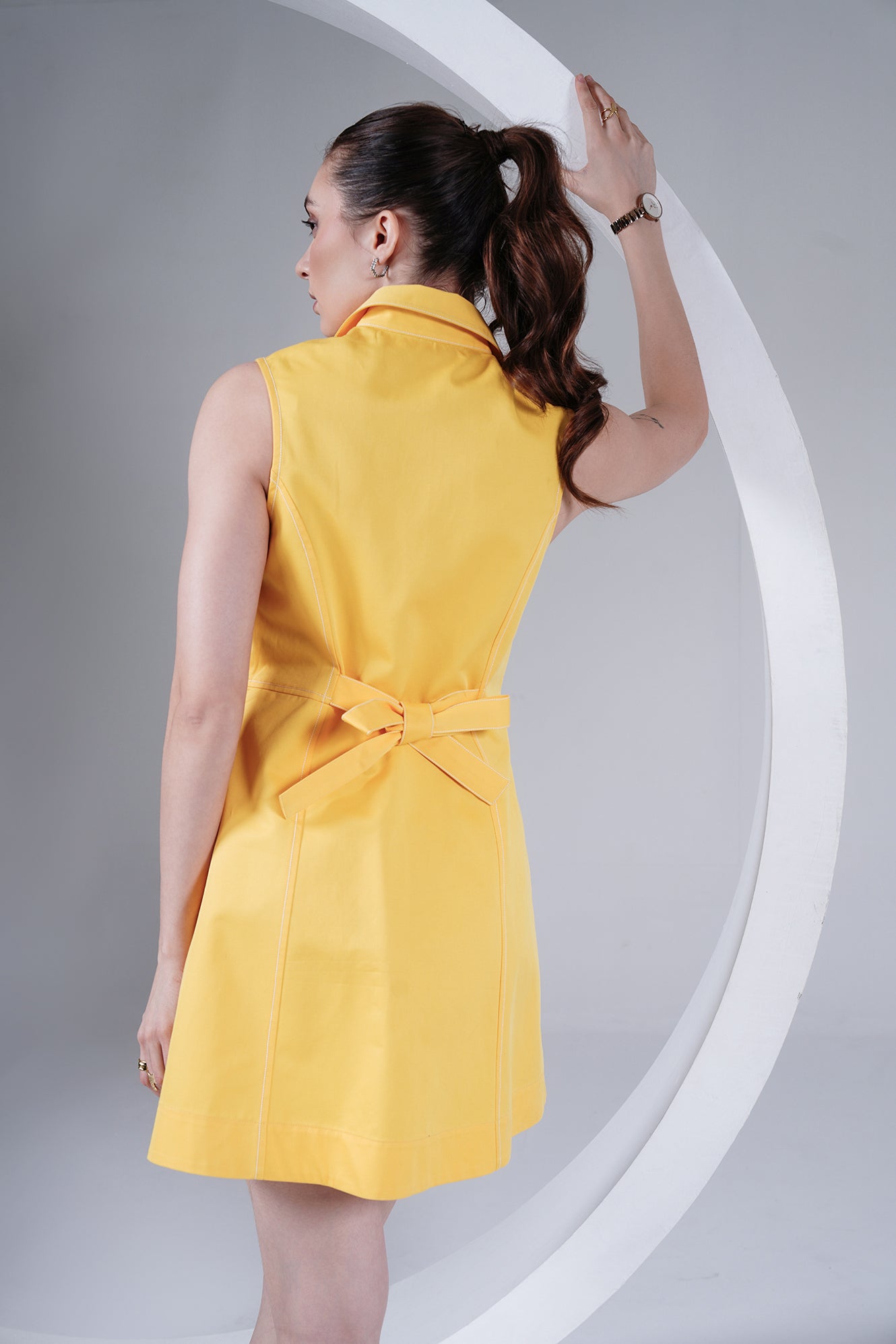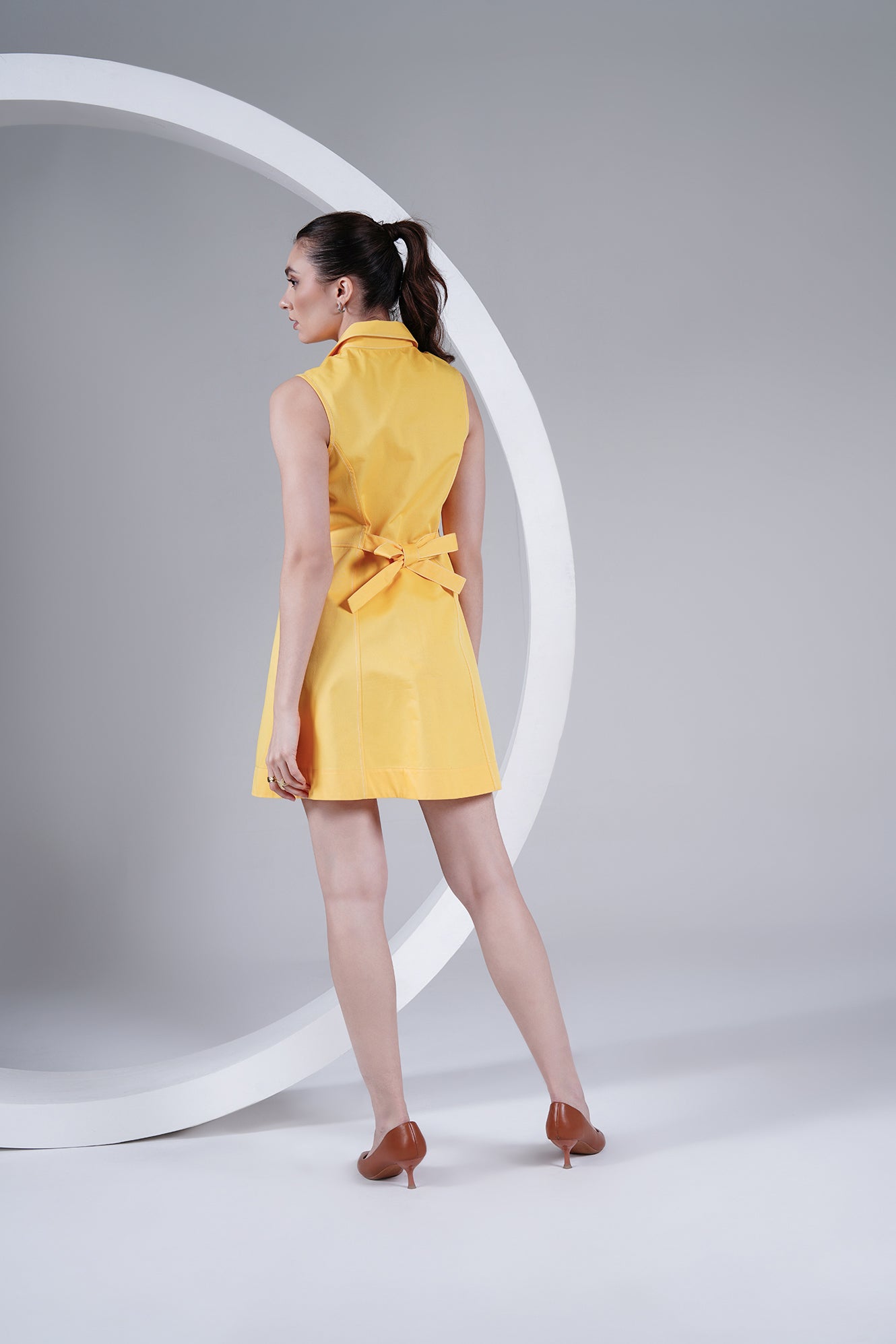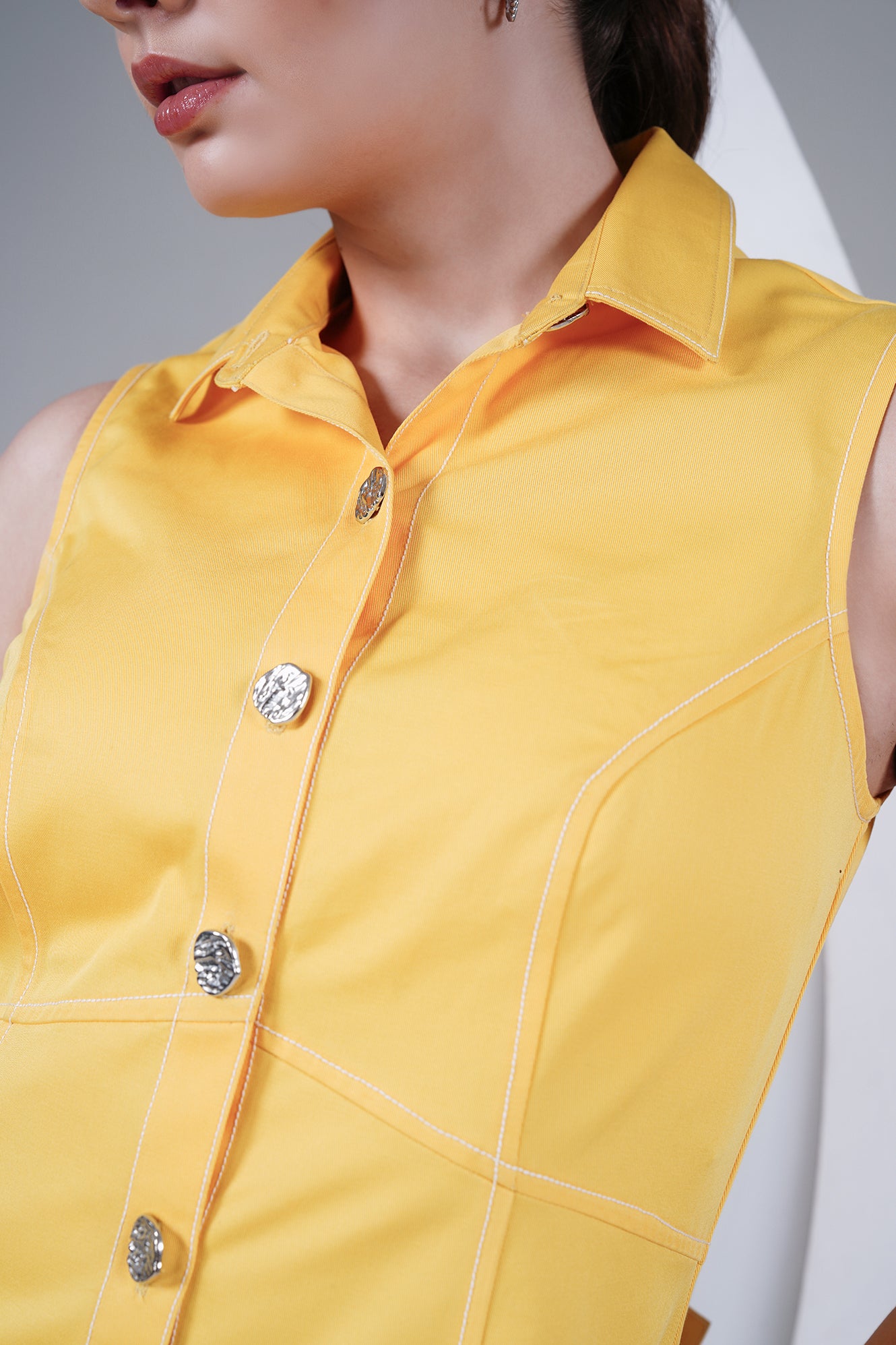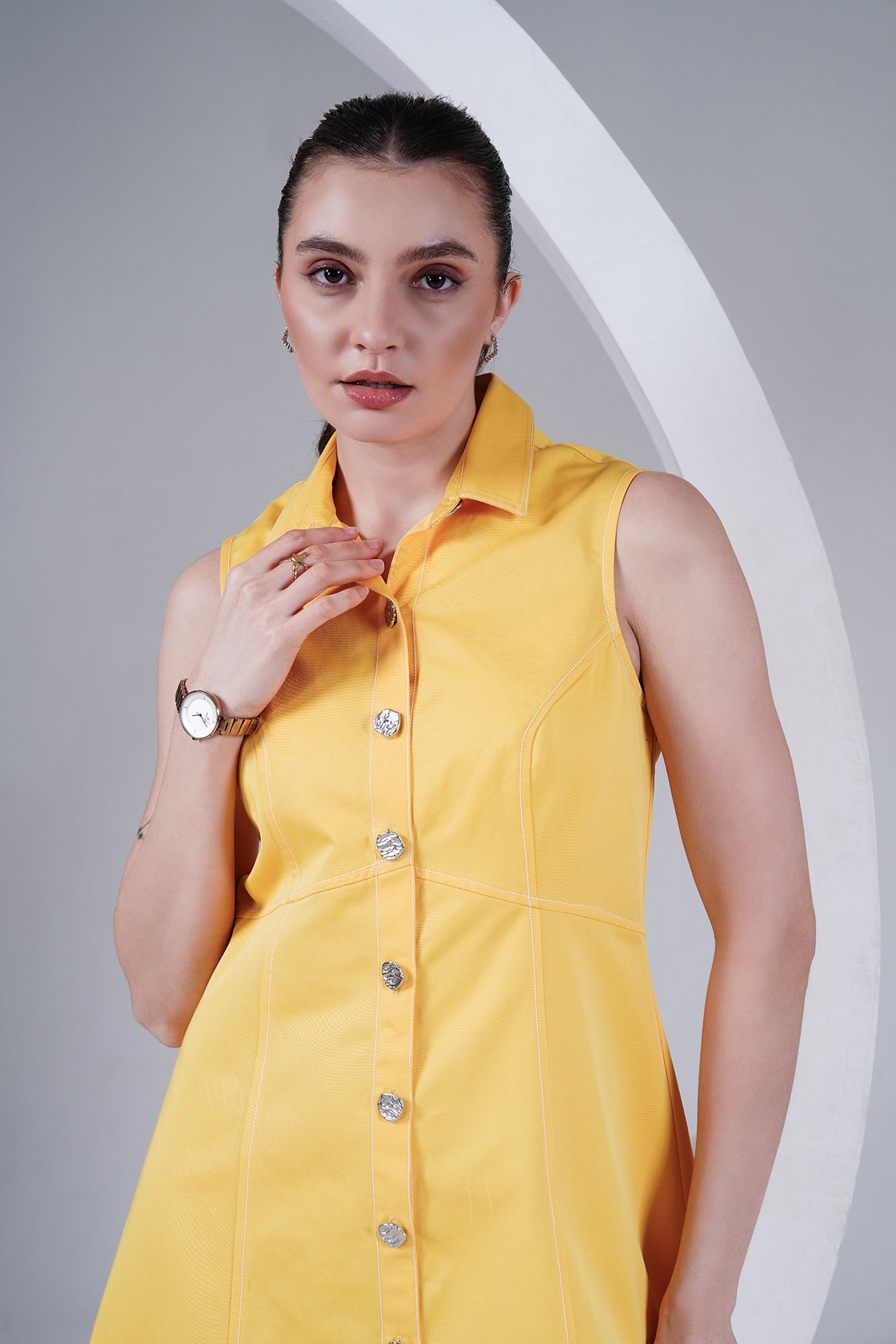Brighten up your wardrobe with this sleeveless yellow dress, crafted in a structured cotton blend for comfort and style. Featuring a sharp shirt collar, front button-down closure with statement buttons, and panel detailing for a flattering silhouette, this dress is a perfect mix of playful and chic. Its mini length makes it a go-to for warm days, casual outings, or dressed-up evenings.