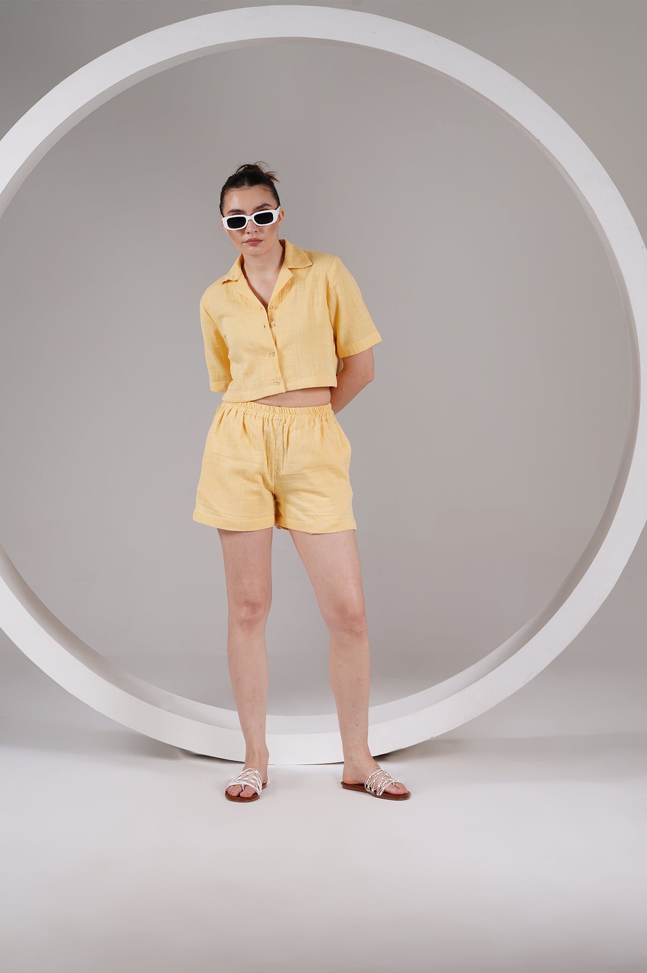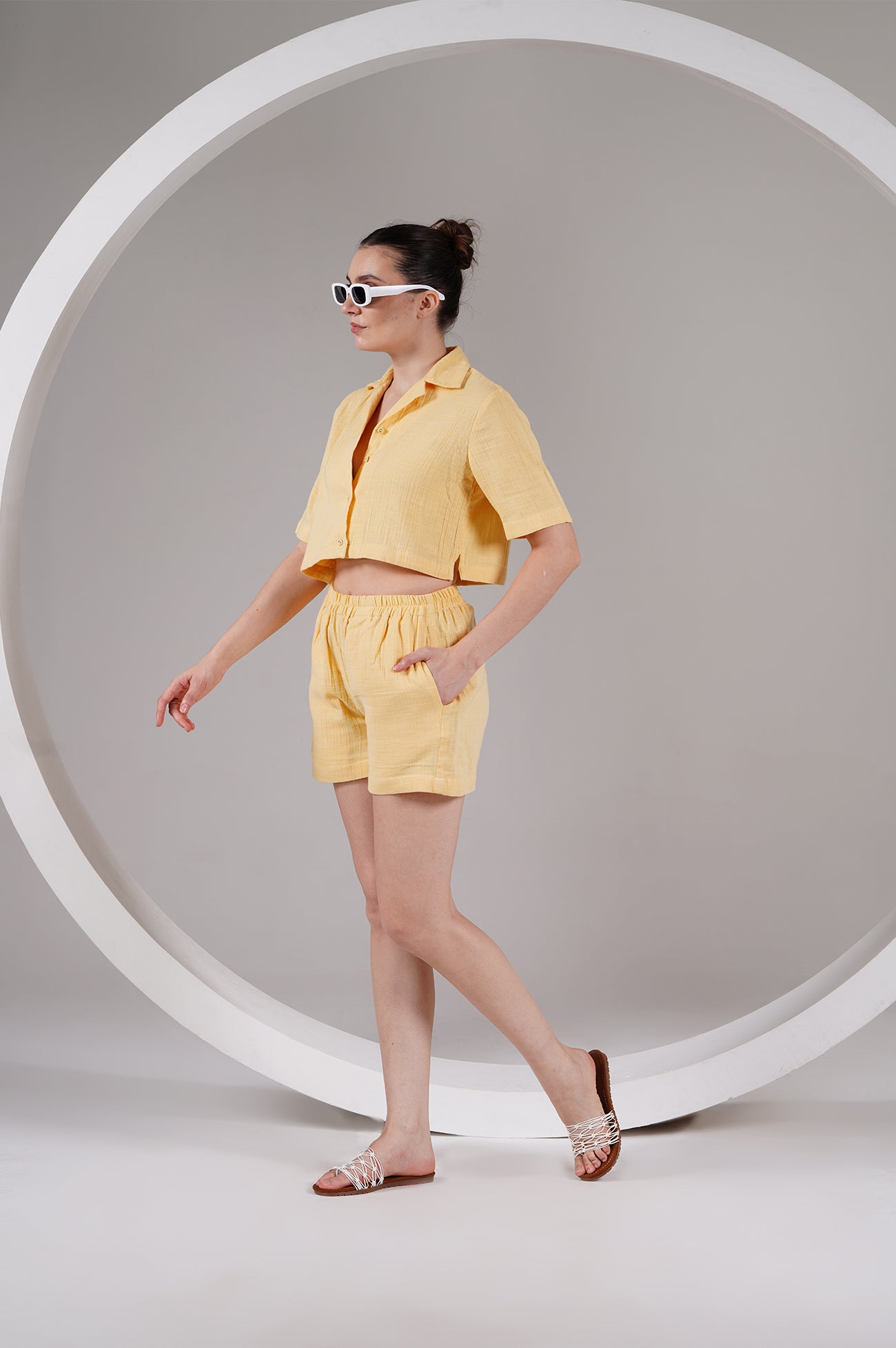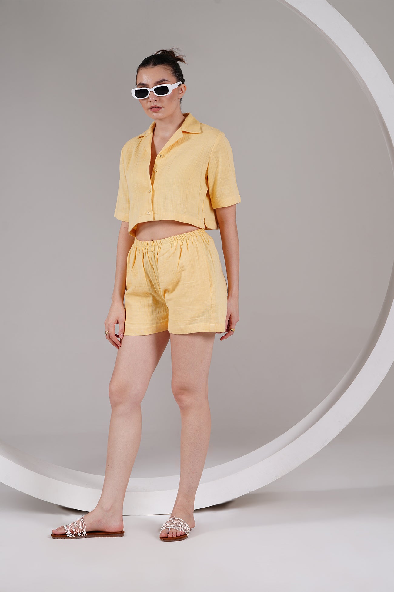 Effortless summer dressing in a co-ord you’ll live in. Crafted from soft, breathable cotton, this yellow set features a cropped short-sleeve shirt with a notched collar and button front, paired with easy-fit shorts designed for comfort and movement. Minimal, light, and versatile — perfect for lounging, traveling, or styling up for a casual day out.