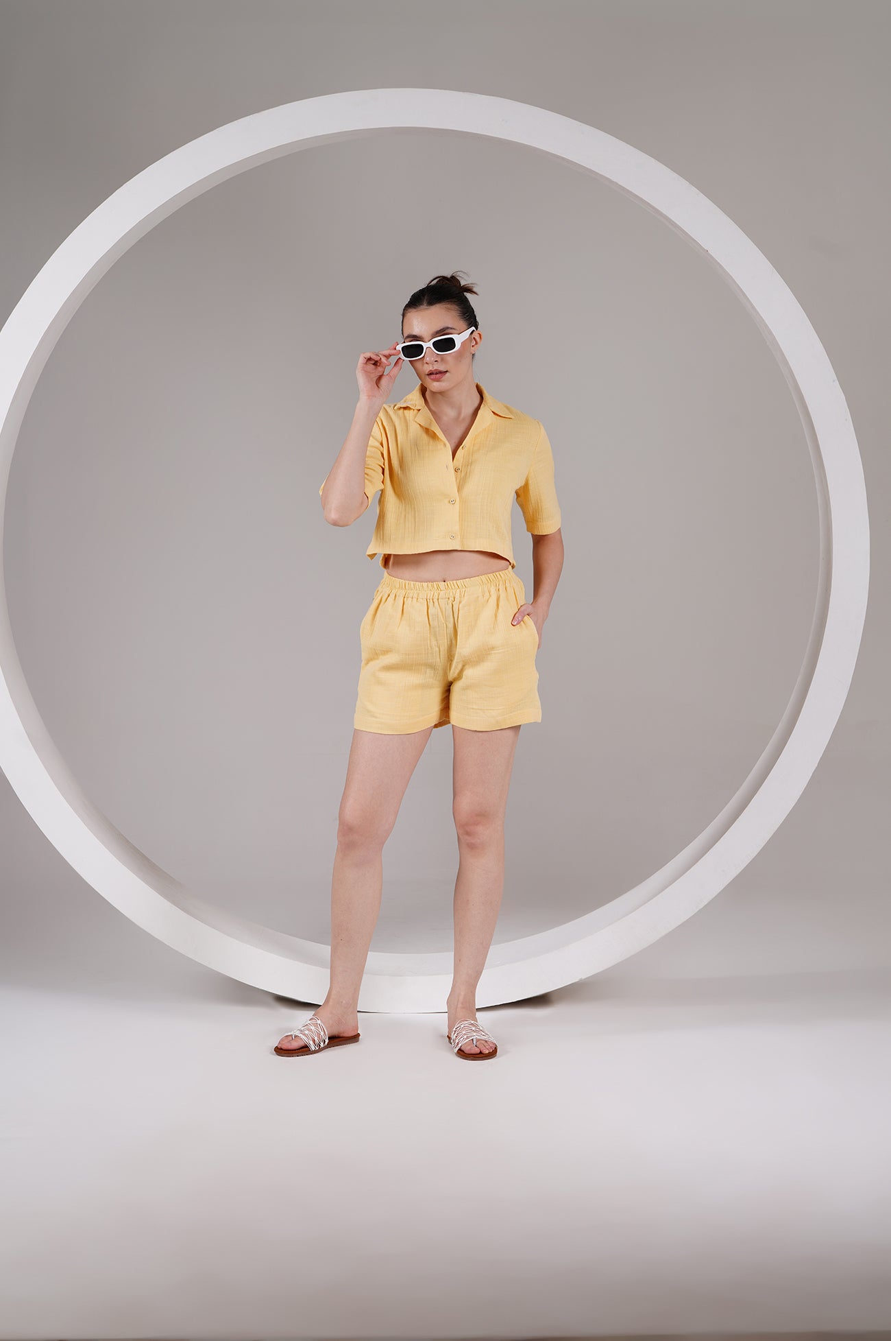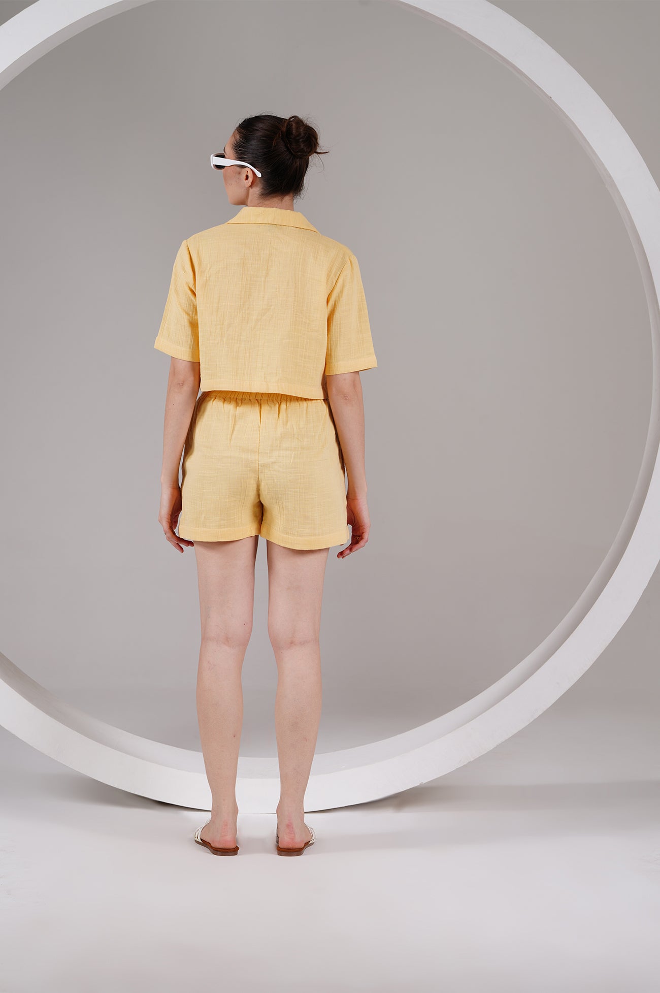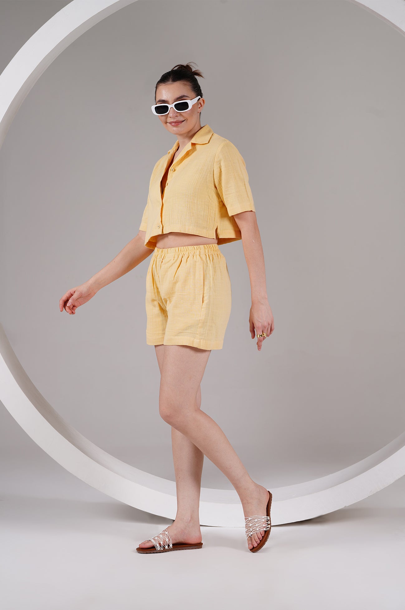 Effortless summer dressing in a co-ord you’ll live in. Crafted from soft, breathable cotton, this yellow set features a cropped short-sleeve shirt with a notched collar and button front, paired with easy-fit shorts designed for comfort and movement. Minimal, light, and versatile — perfect for lounging, traveling, or styling up for a casual day out.