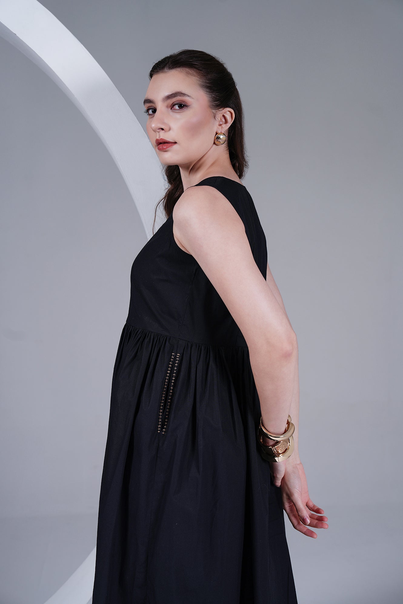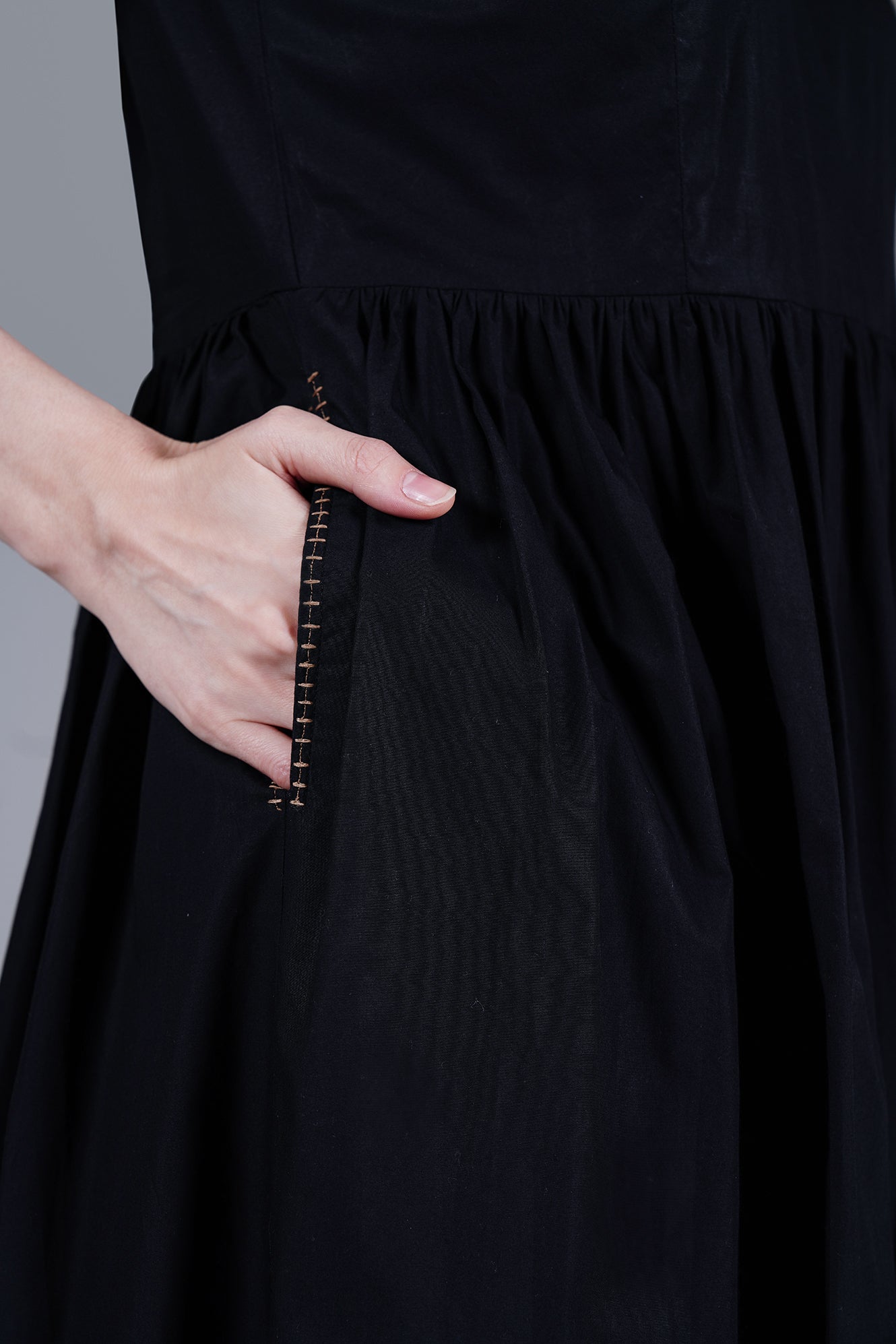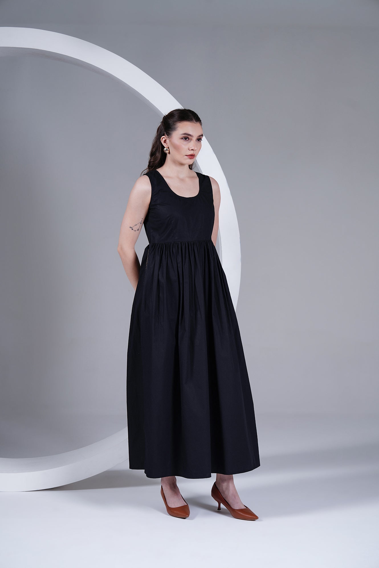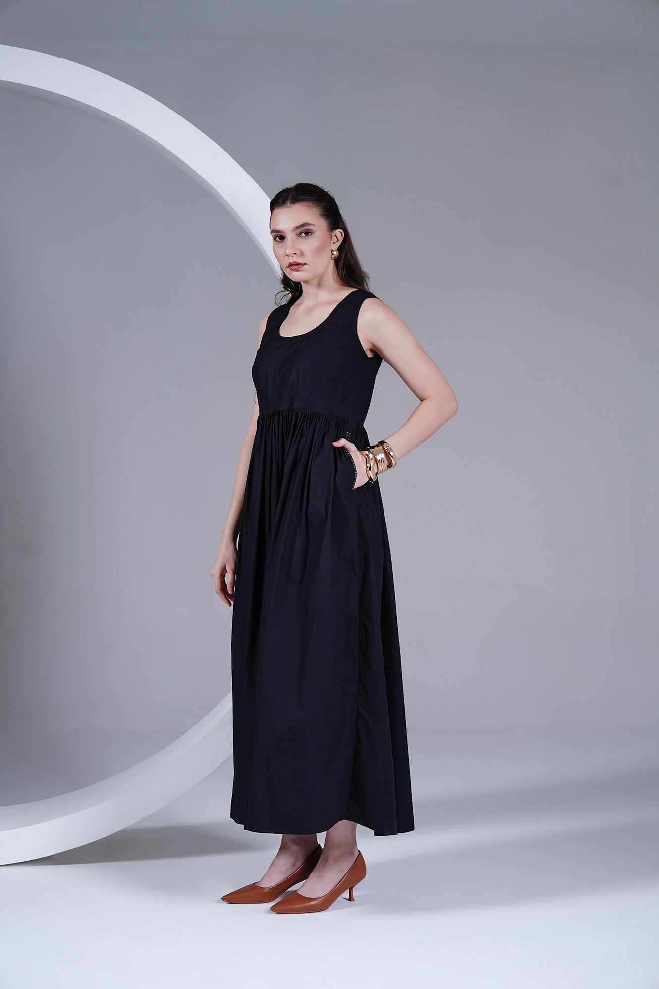 A timeless black dress crafted in breathable cotton poplin, designed for effortless style and comfort. This sleeveless silhouette features a scoop neckline, gathered waistline for a soft flare, and concealed side pockets detailed with hand-stitched finishing. Perfect for everyday wear or styled up for evenings, this dress is a versatile wardrobe essential.
