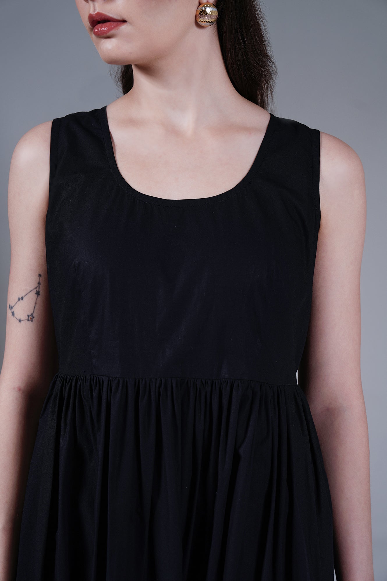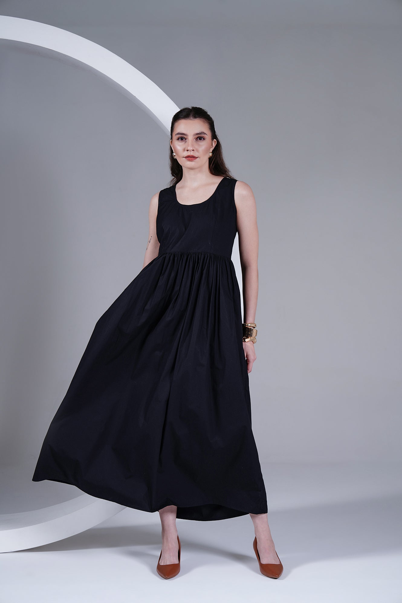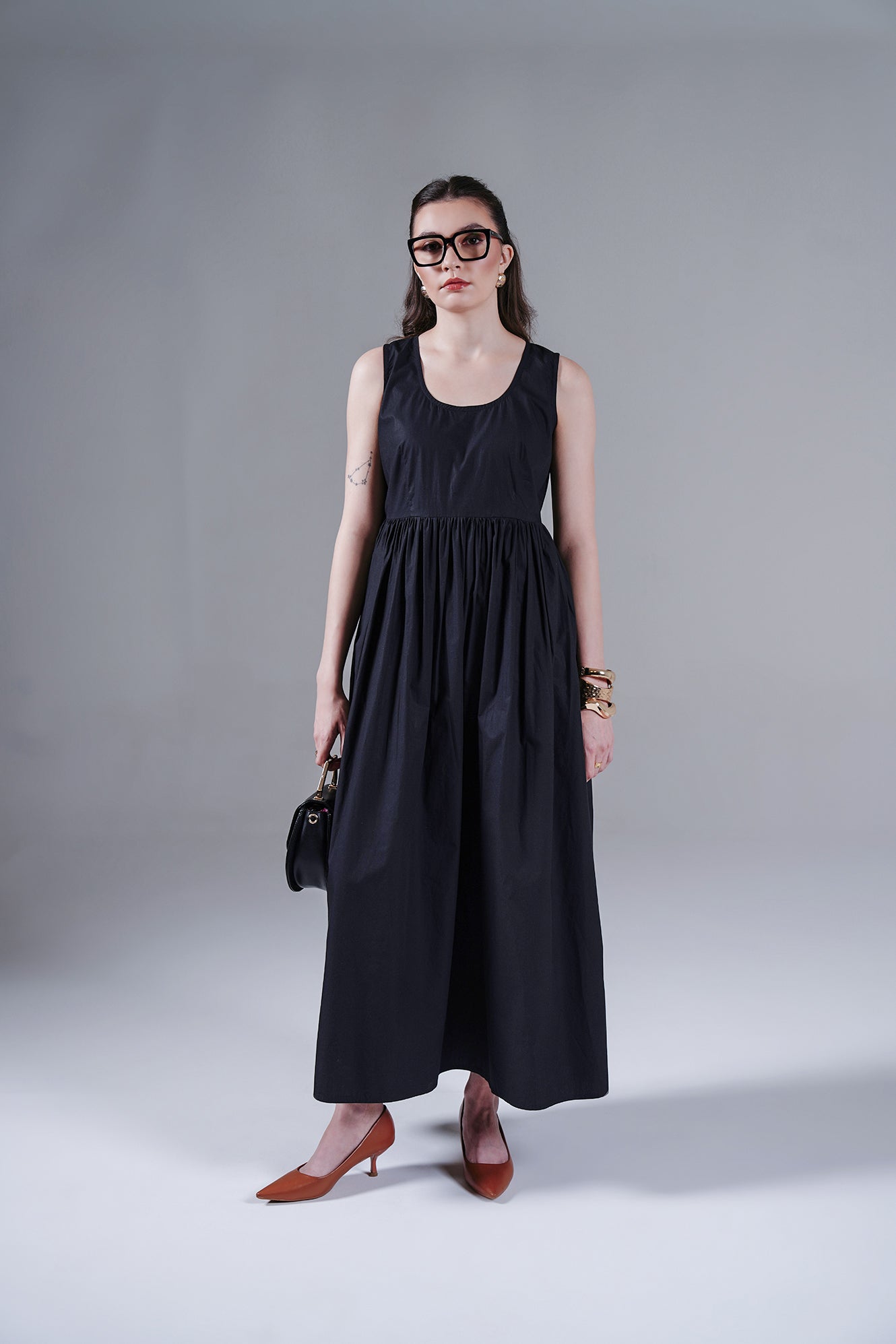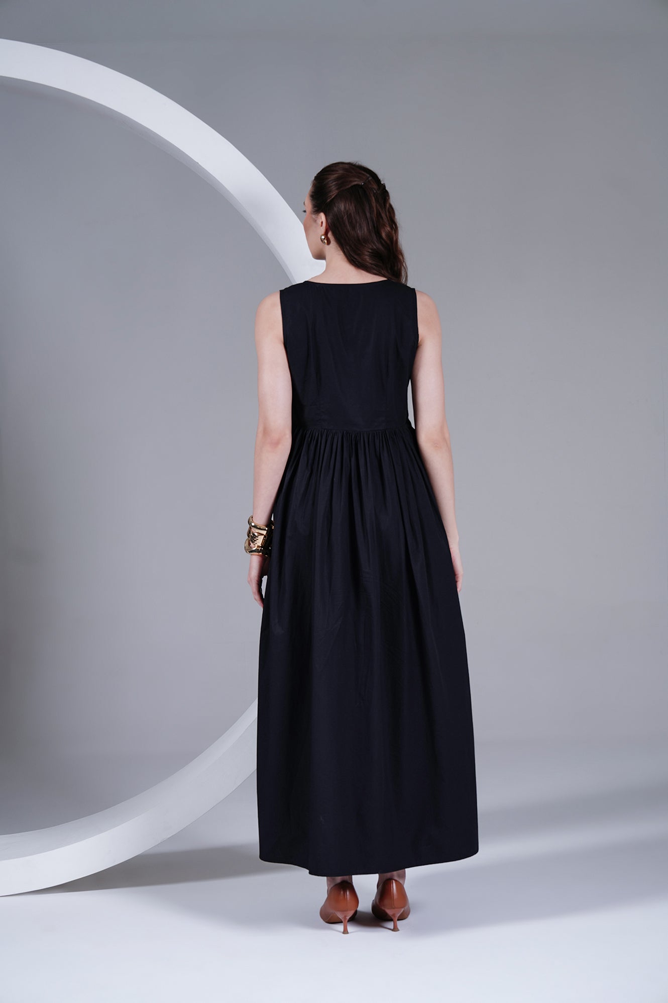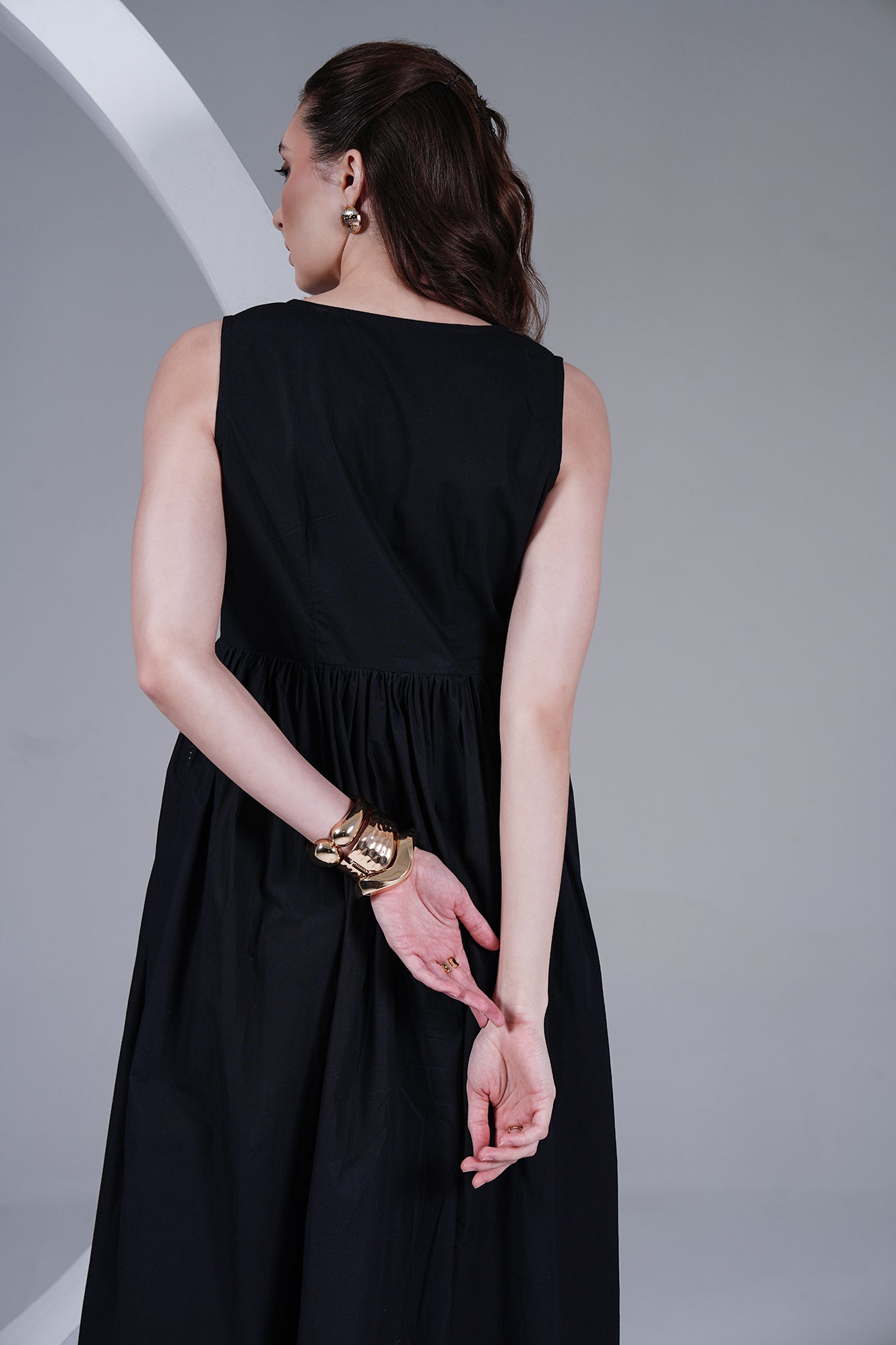 A timeless black dress crafted in breathable cotton poplin, designed for effortless style and comfort. This sleeveless silhouette features a scoop neckline, gathered waistline for a soft flare, and concealed side pockets detailed with hand-stitched finishing. Perfect for everyday wear or styled up for evenings, this dress is a versatile wardrobe essential.