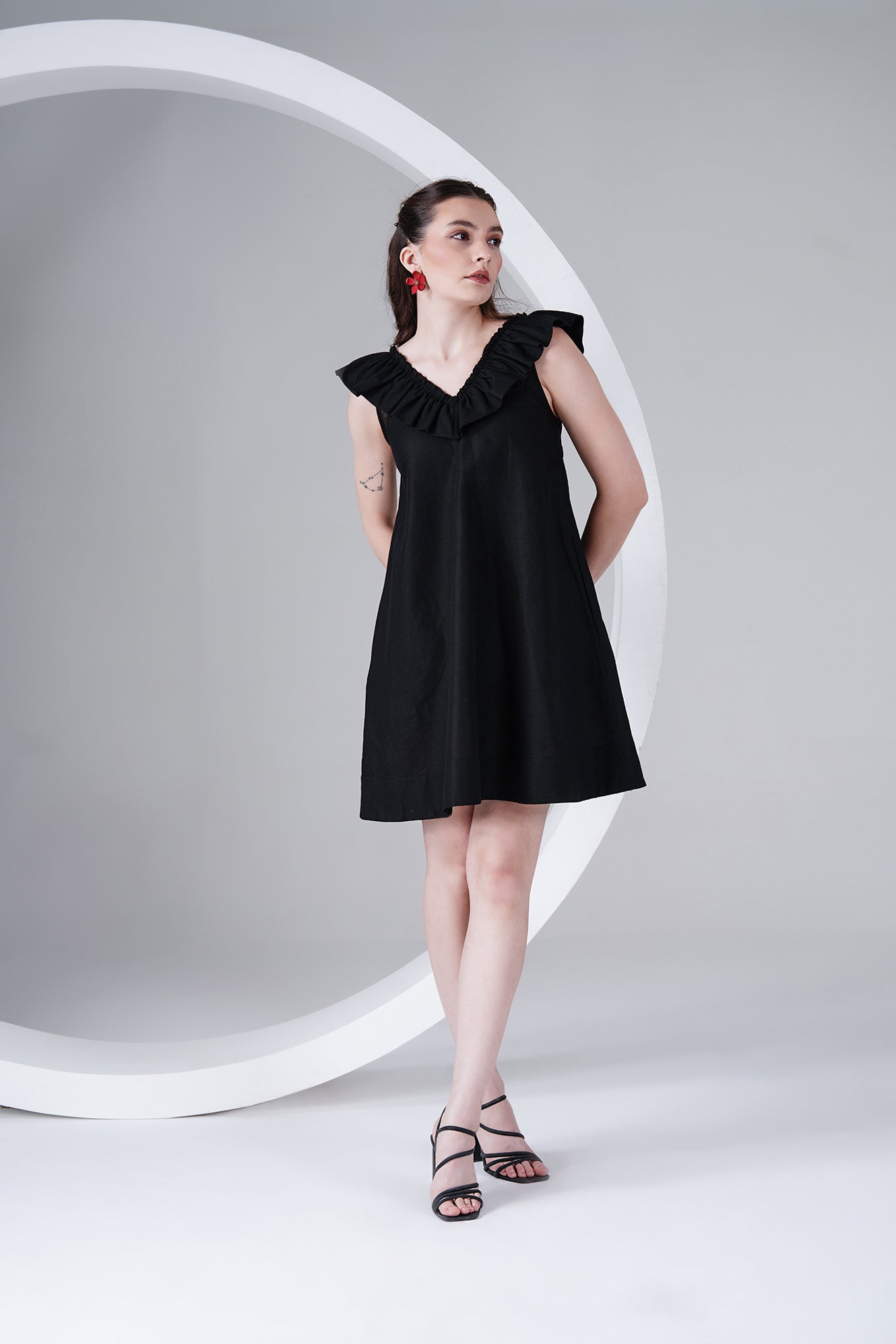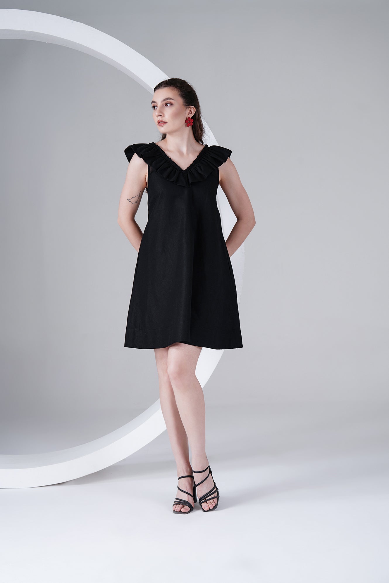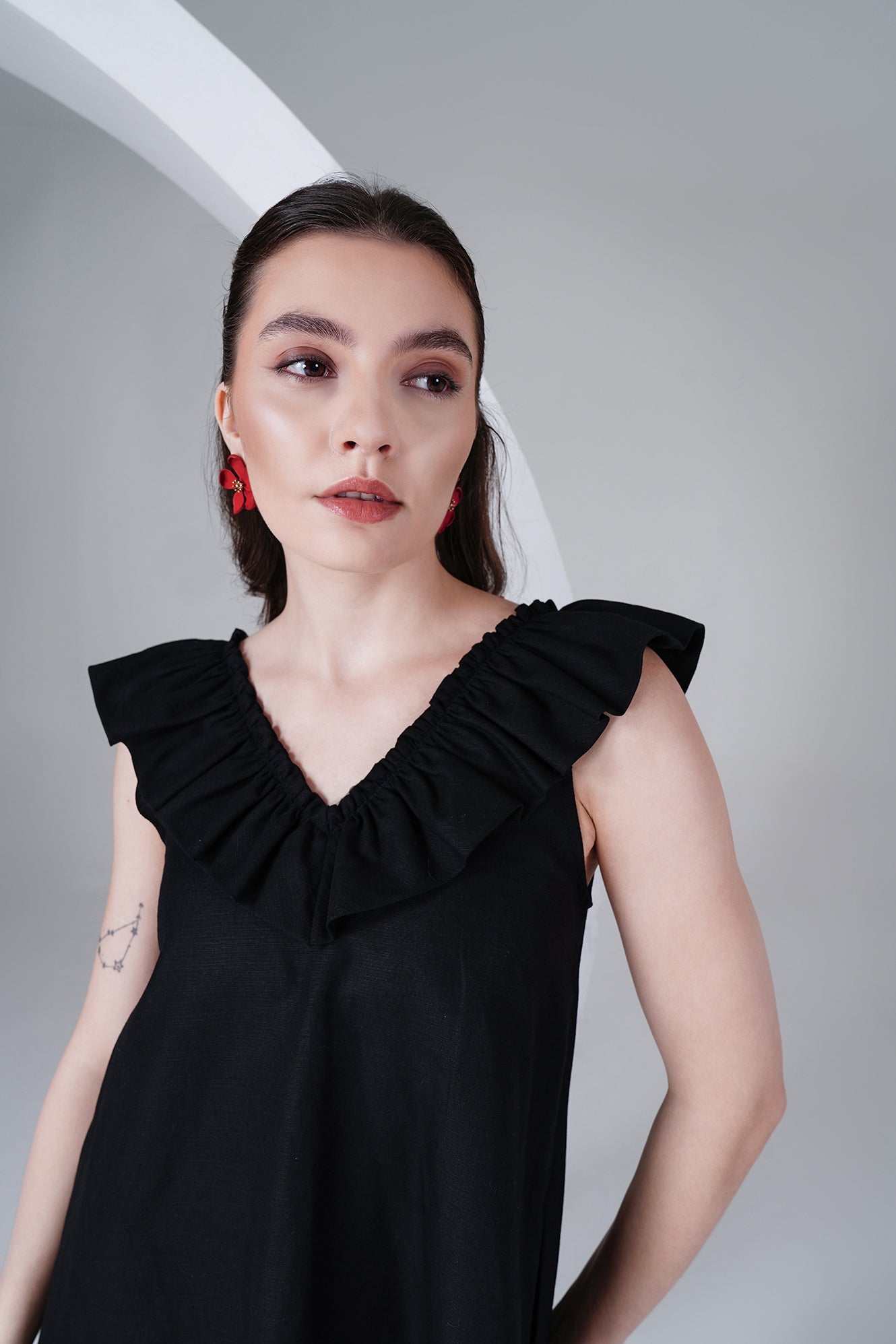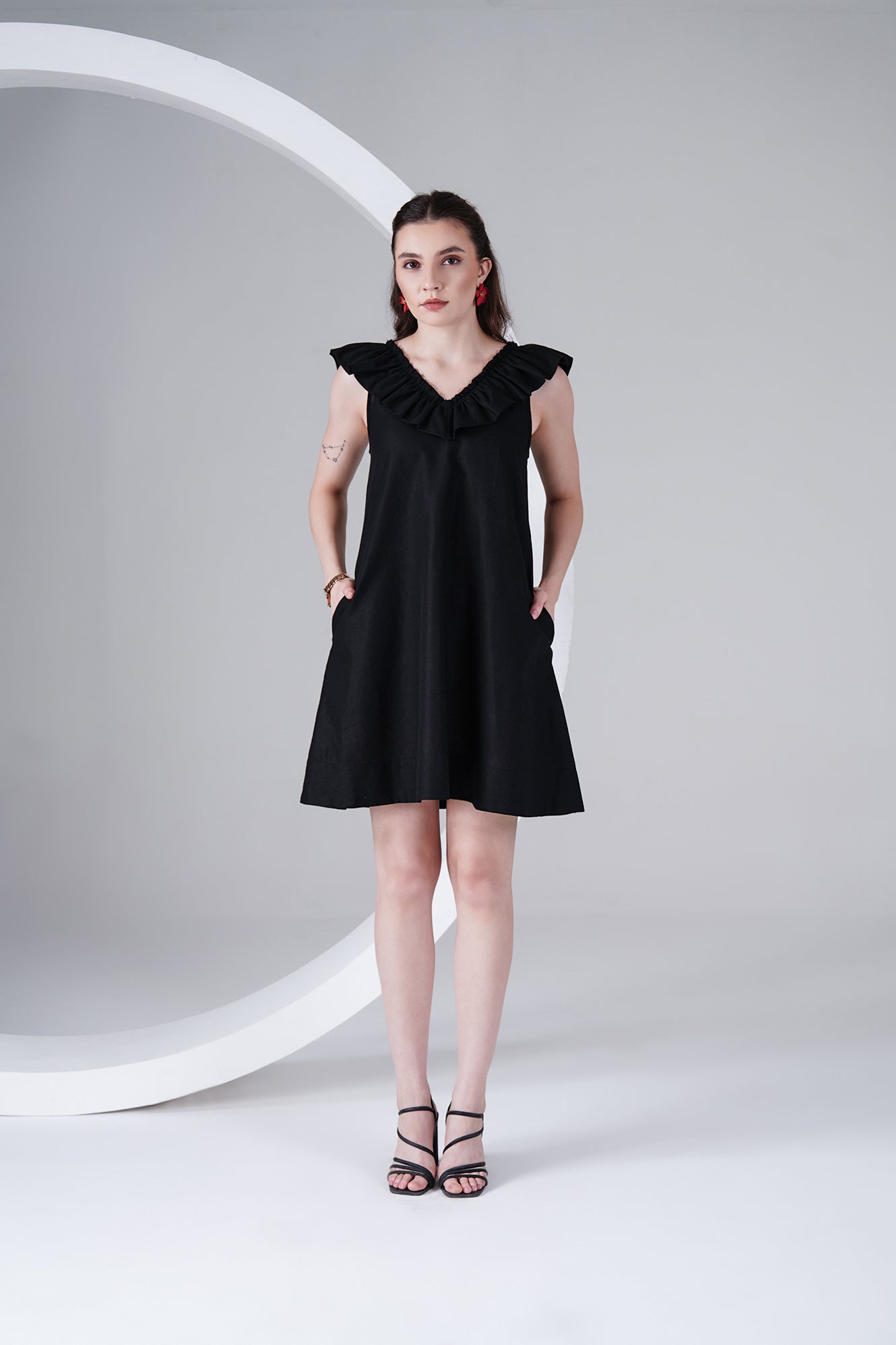 A timeless black dress crafted in 100% cotton-linen, designed for effortless elegance. Featuring a flattering V-neckline with statement ruffle detailing, this sleeveless dress combines comfort with sophistication. The easy A-line silhouette flows gracefully, while side pockets add everyday functionality. Perfect for both day and night styling, it transitions seamlessly from brunch to evening outings.