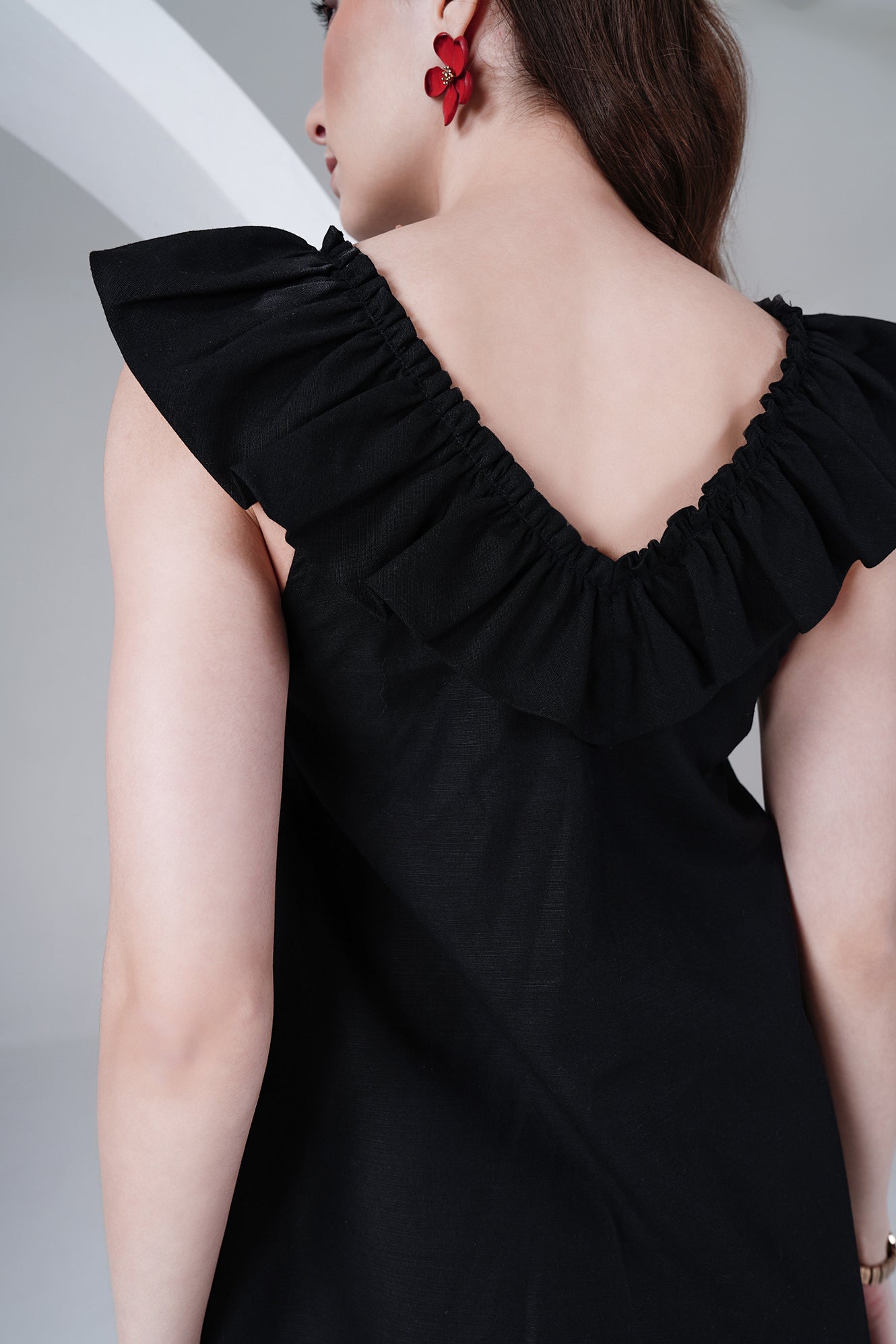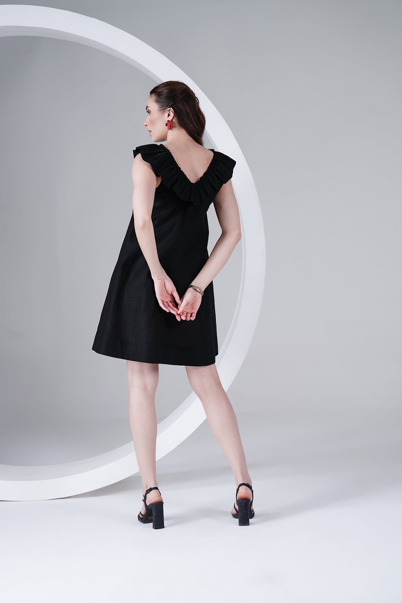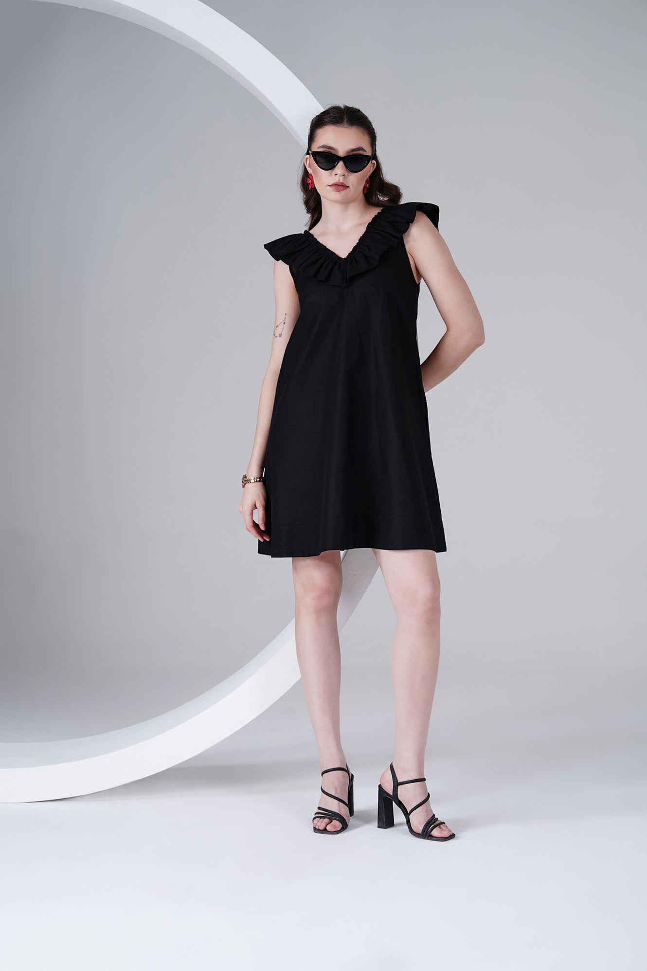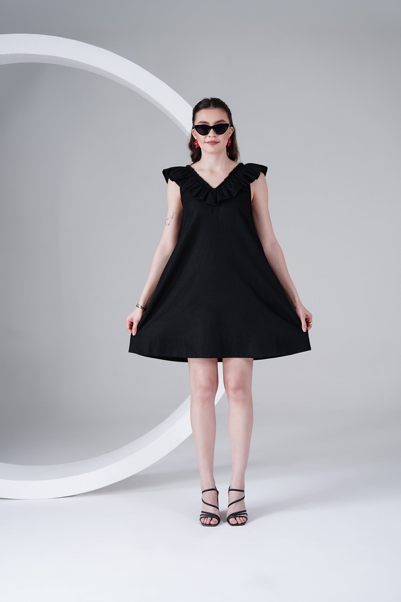 A timeless black dress crafted in 100% cotton-linen, designed for effortless elegance. Featuring a flattering V-neckline with statement ruffle detailing, this sleeveless dress combines comfort with sophistication. The easy A-line silhouette flows gracefully, while side pockets add everyday functionality. Perfect for both day and night styling, it transitions seamlessly from brunch to evening outings.