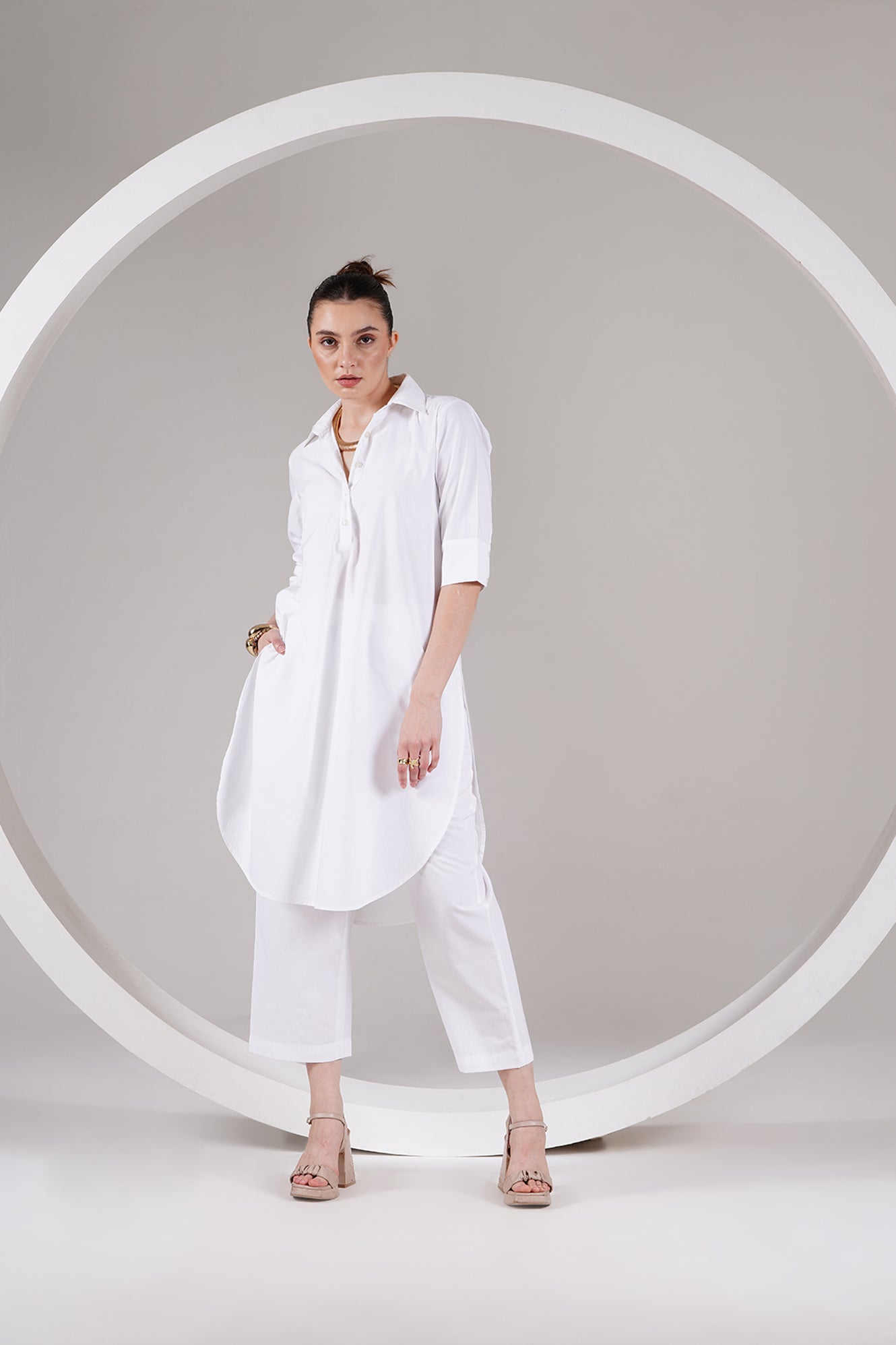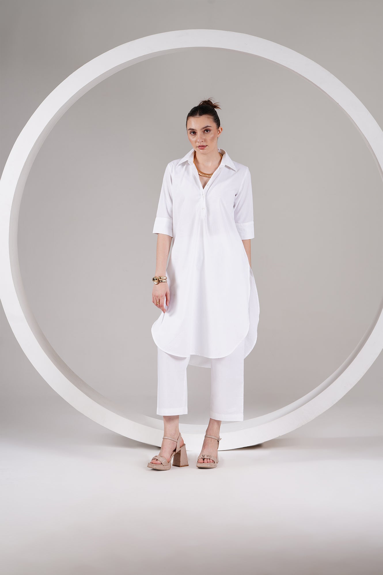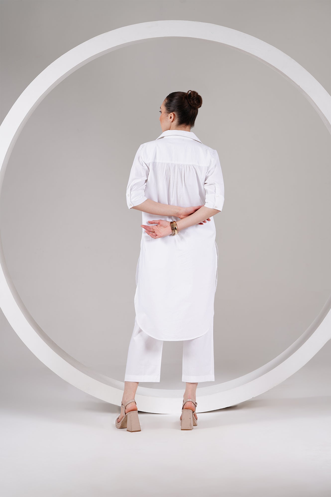 Elevate your everyday with this timeless white co-ord set crafted in crisp cotton poplin. The longline shirt features a curved hemline, half sleeves with cuff detail, and a relaxed silhouette for effortless sophistication. Paired with straight-cut pants, this ensemble transitions seamlessly from workdays to leisure with Suitaga’s signature minimal-in-motion touch.