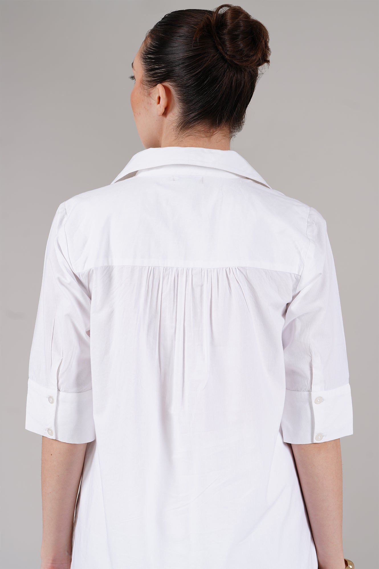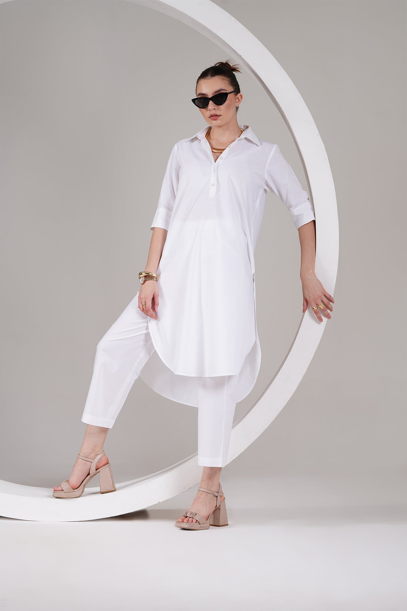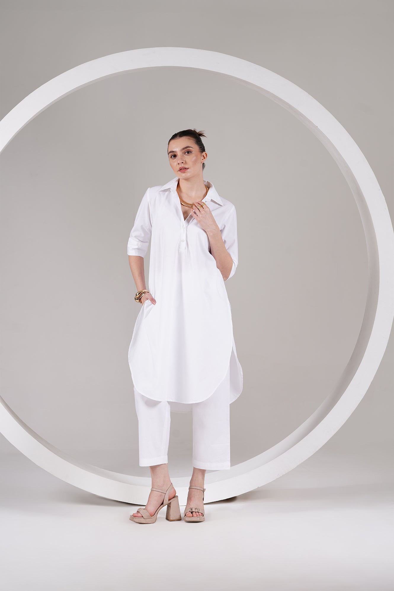 Elevate your everyday with this timeless white co-ord set crafted in crisp cotton poplin. The longline shirt features a curved hemline, half sleeves with cuff detail, and a relaxed silhouette for effortless sophistication. Paired with straight-cut pants, this ensemble transitions seamlessly from workdays to leisure with Suitaga’s signature minimal-in-motion touch.